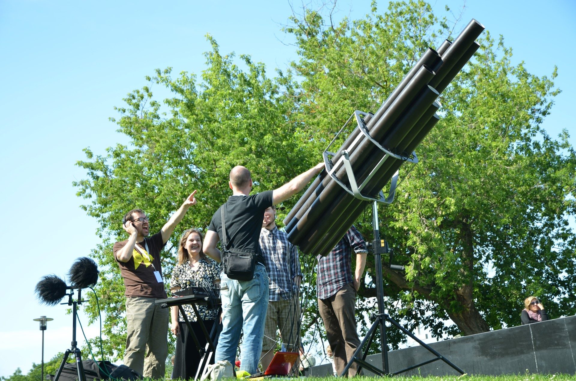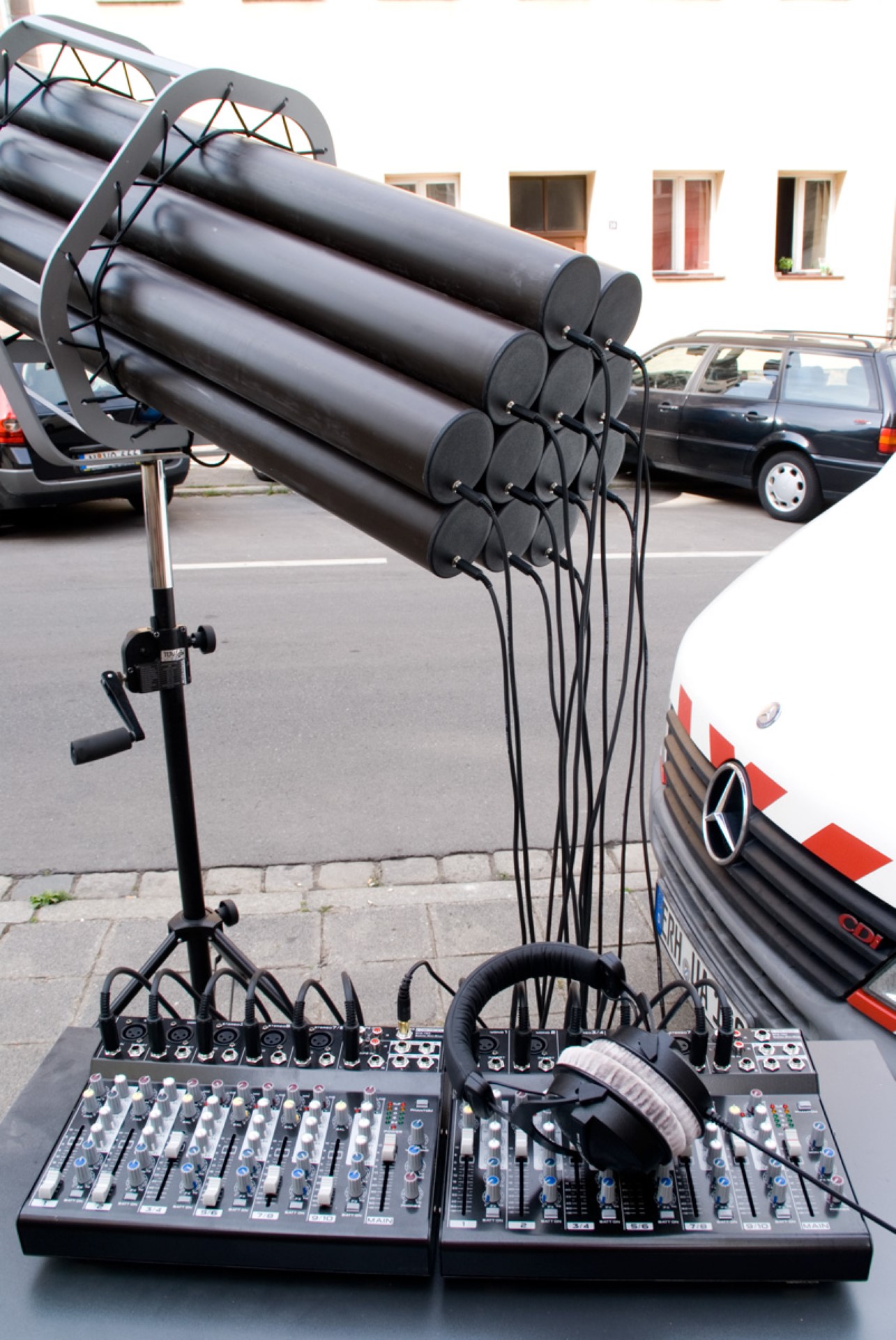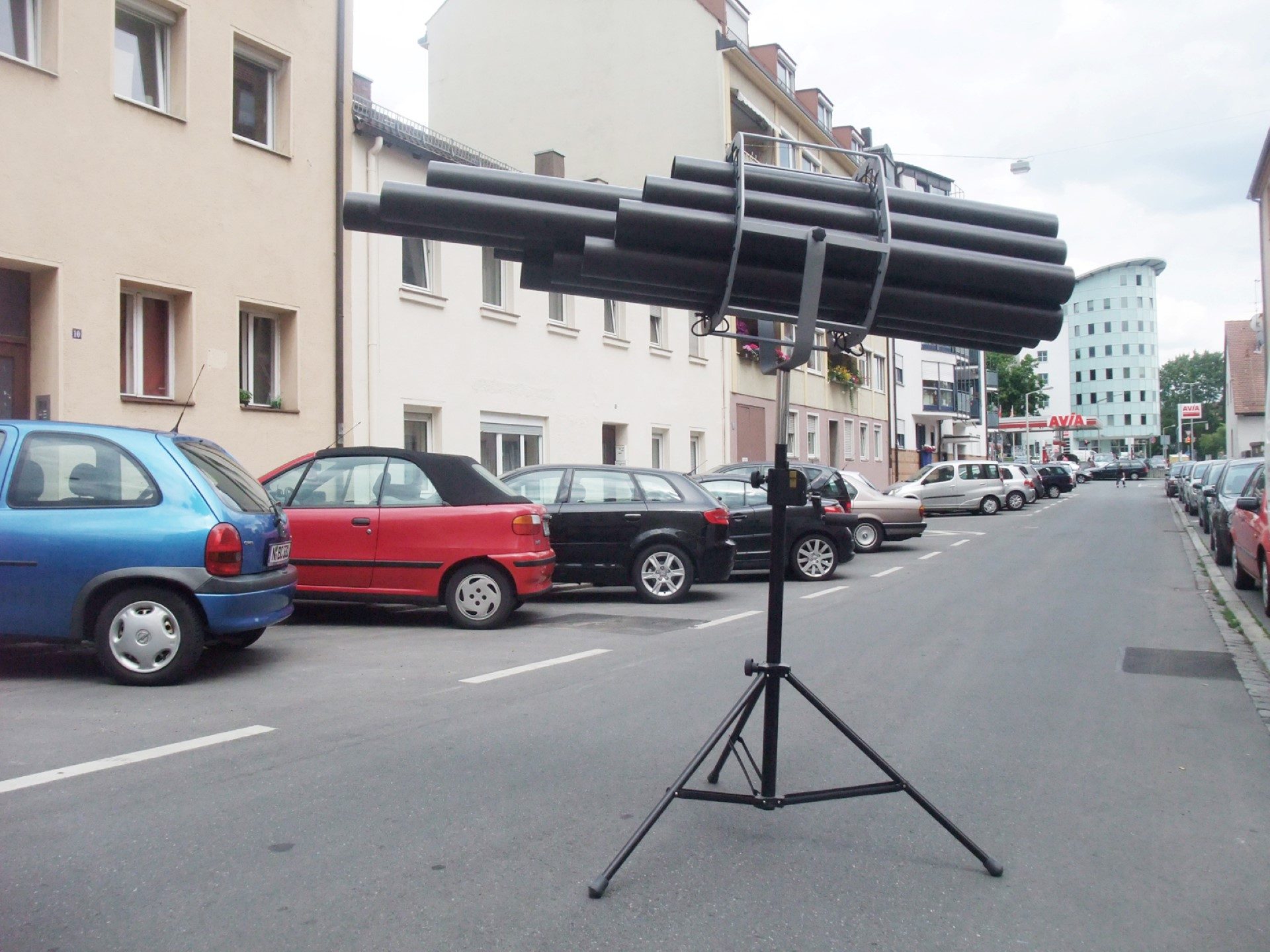 12-tone-filter is a mobile sonic object that transforms urban noises into tuned sounds. The object is made of 12 PVC drain pipes. The pipes have a diameter of 100mm, they are connected by elastic adhesive agent. The resonance of a tube of air is related to the length of the tube. Pipes of twelve different lengths convert the incoming noises by resonance, noise is tuned to different harmonic tonalities.The scale reaches from E to next Es´ and includes odd and even number harmonics.The listener receives a new quality of hearing street traffic, aircraft noises and other strong everyday sounds.In addition one can play the object like an instrument, fading several tubes in and out. It can be used as interactive object for passerbys in public space and it can also be used as instrument for concerts in public space.12-tone filter is an effective transformer of badnoise into good noise. Thanks to its reduced weight the object is mobile. One person can handle it focusing on interesting sources. It has the metaphoric appearance of a big anti-noise weapon, like a multi-barrel gun. On the other hand it reminds us of a non-esoteric sonic counterdraft to Wilhelm Reich´s cloudbuster. The best place for the filter is near sound polluted and highly frequented streets and other places of so-called bad noise.