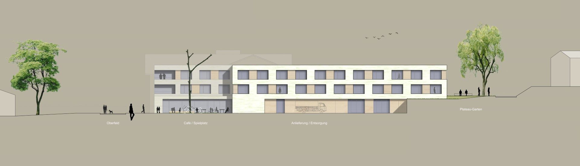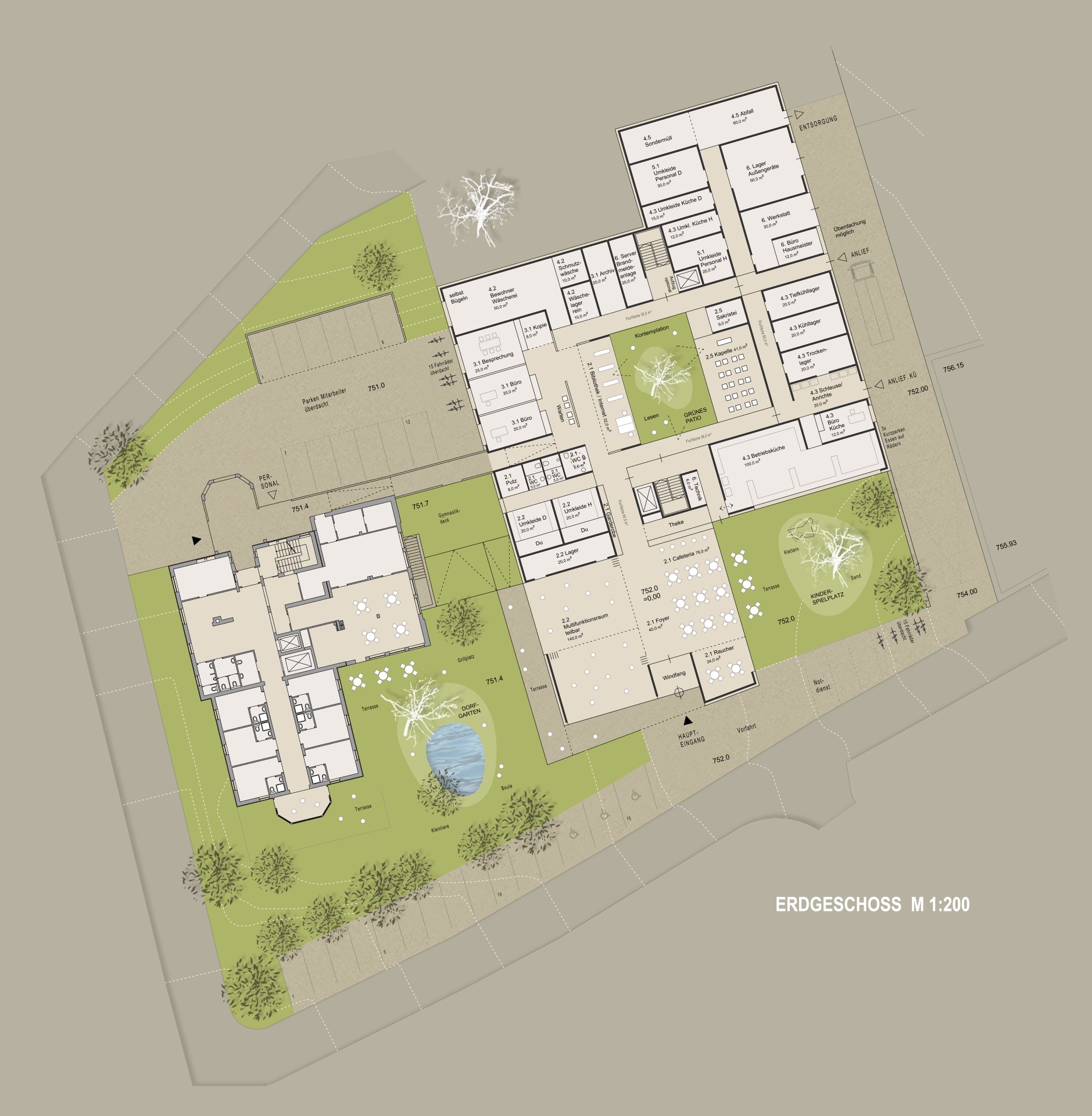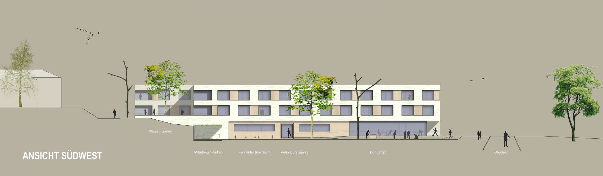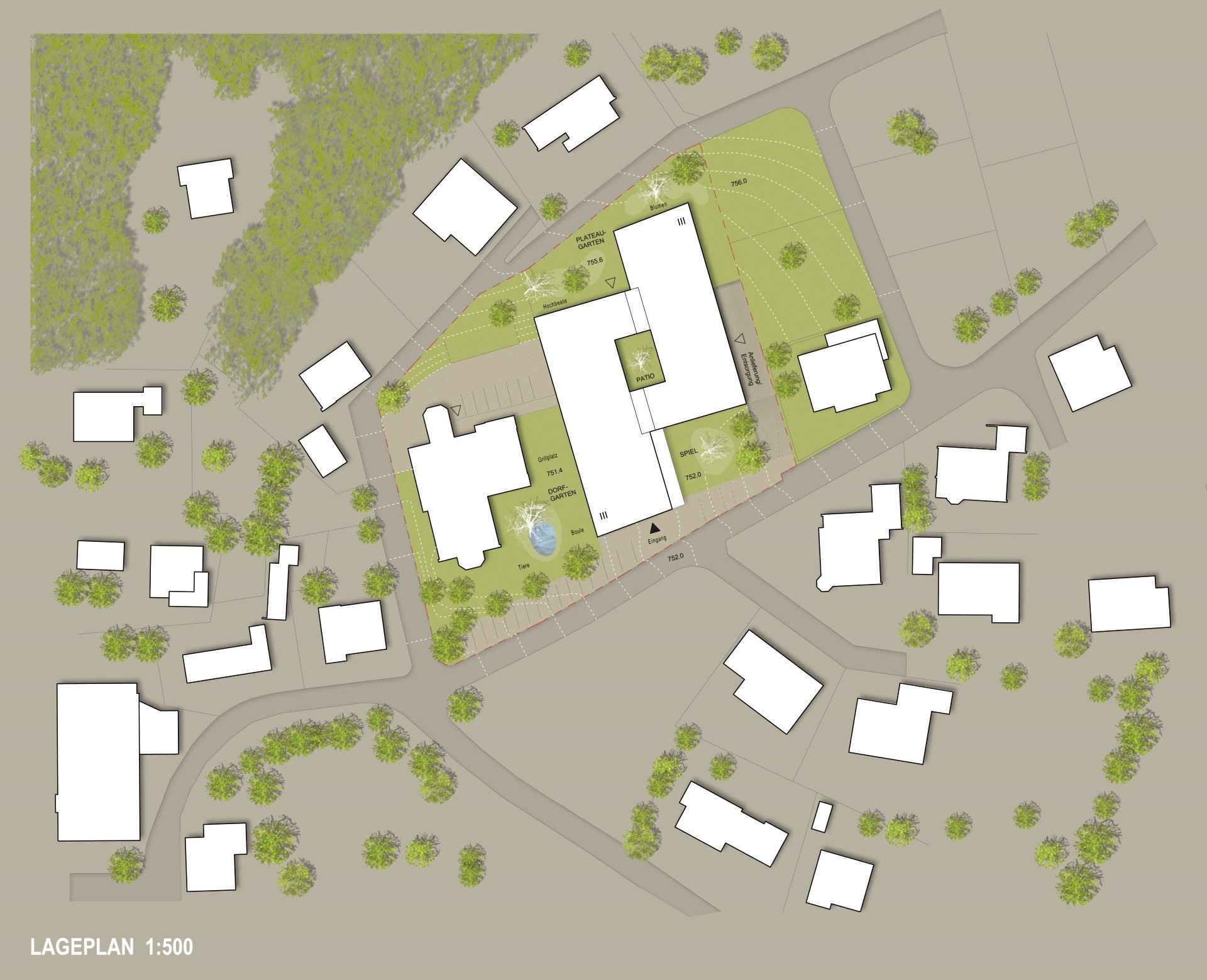 Der Neubau besteht aus zwei kompakten Volumen, die an zentraler Stelle ineinandergreifen und einen Lichthof bilden. Der Haupteingang mit Vorfahrt liegt direkt an der Erschließungsstraße. Durch die Positionierung des Baukörpers auf dem Grundstück entstehen drei separate Freibereiche: der Dorfgarten, der Spielplatz und der Plateau-Garten.