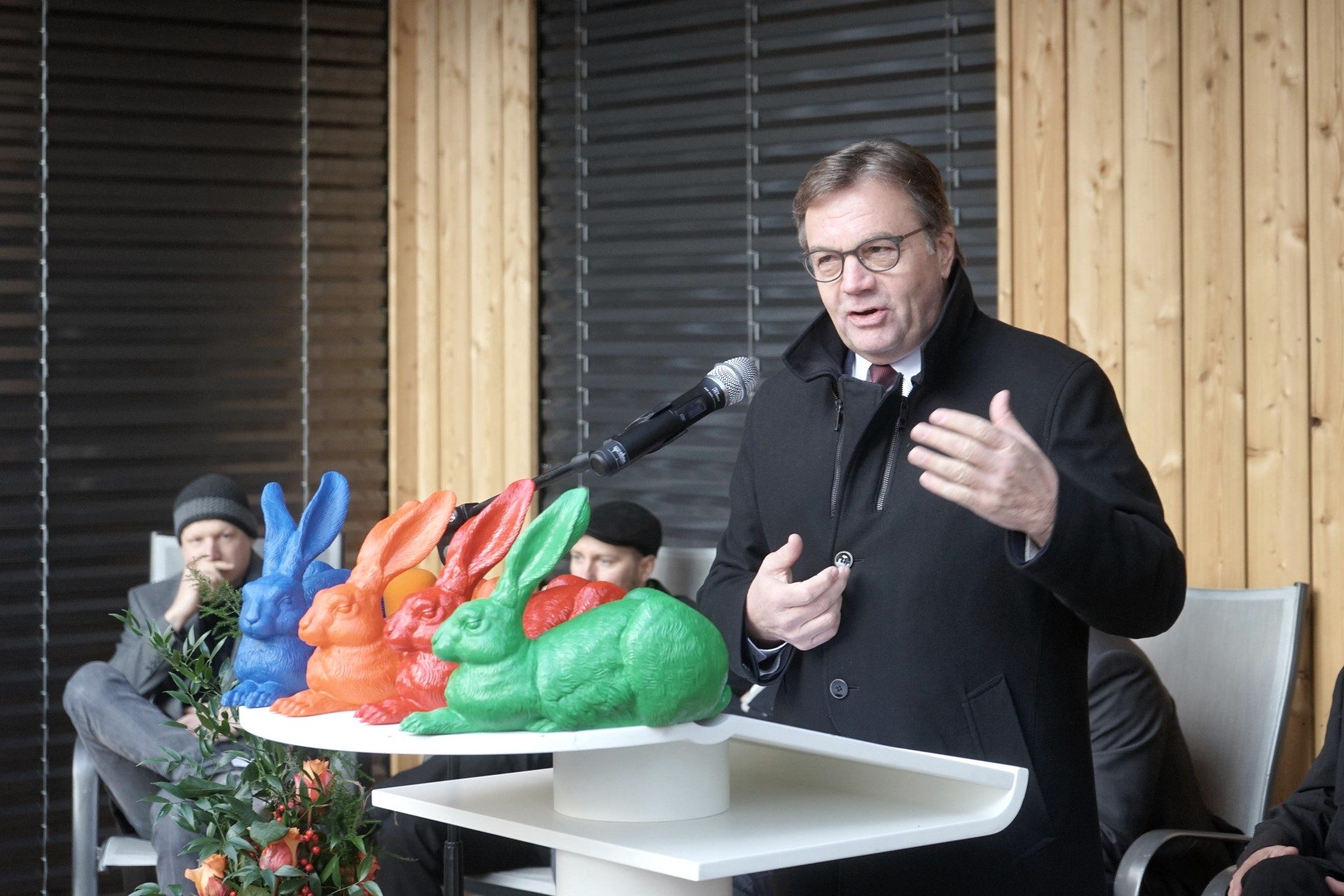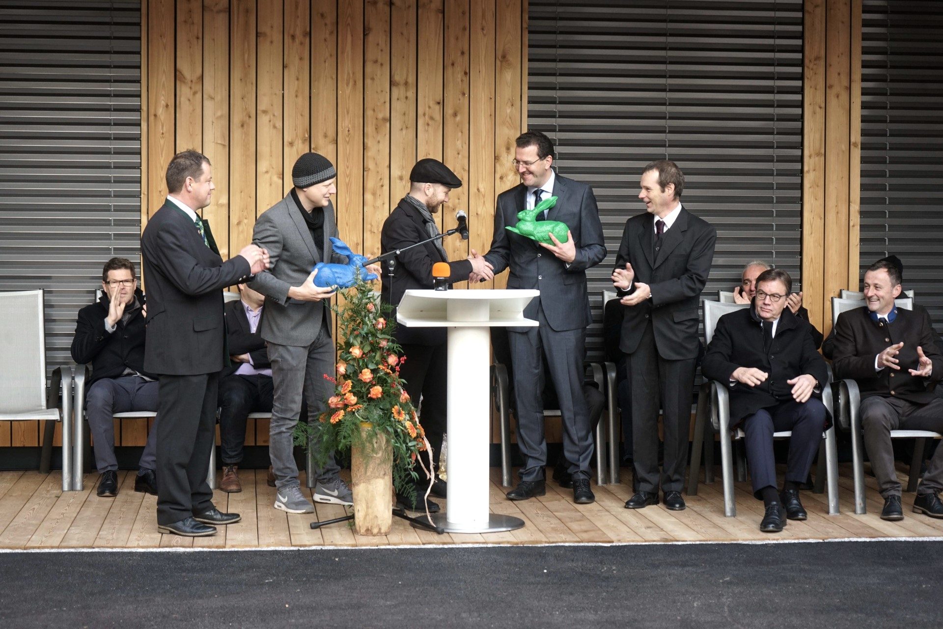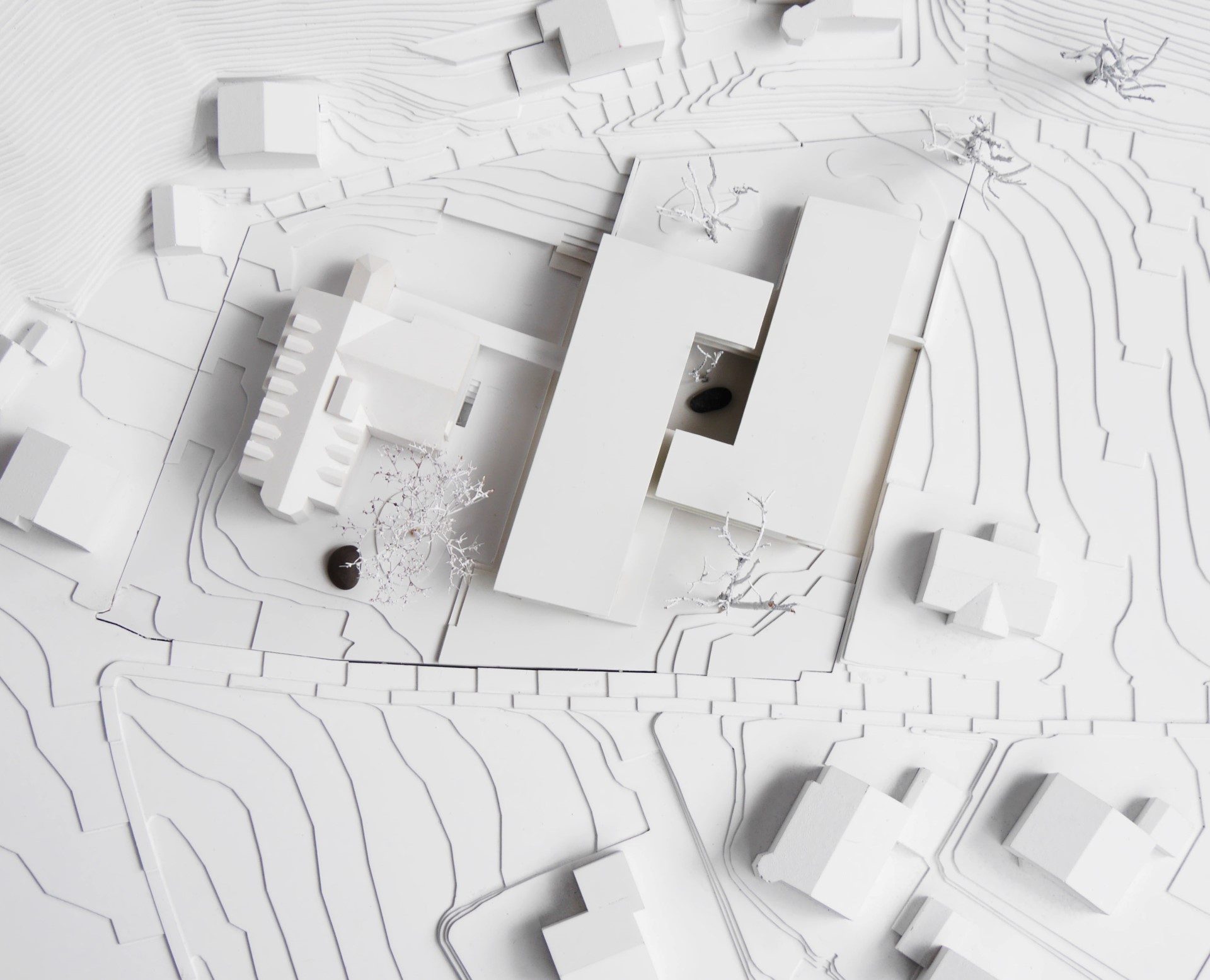 Der Neubau besteht aus zwei kompakten Volumen, die an zentraler Stelle ineinandergreifen und einen Lichthof bilden. Der Haupteingang mit Vorfahrt liegt direkt an der Erschließungsstraße. Durch die Positionierung des Baukörpers auf dem Grundstück entstehen drei separate Freibereiche: der Dorfgarten, der Spielplatz und der Plateau-Garten.