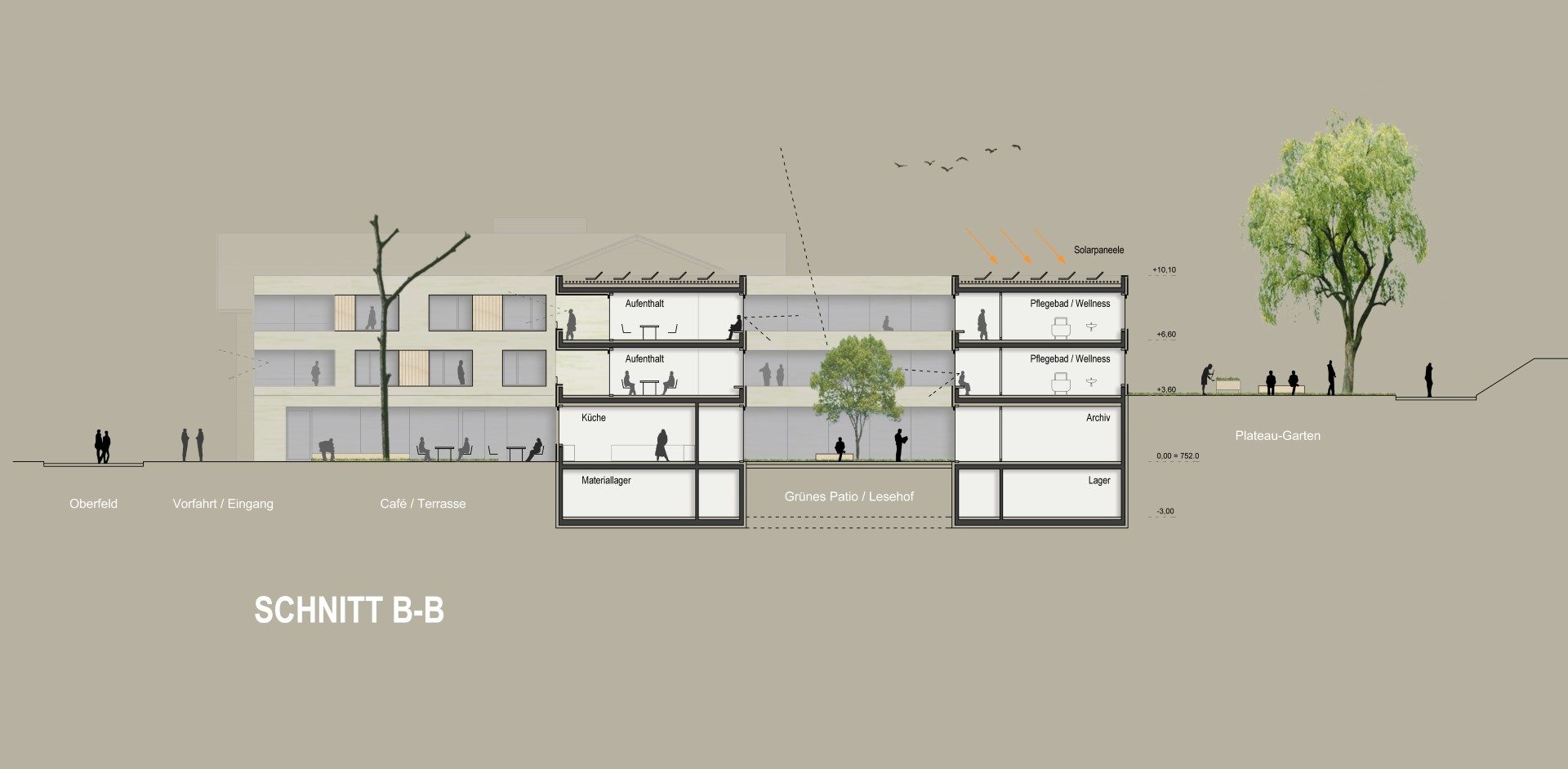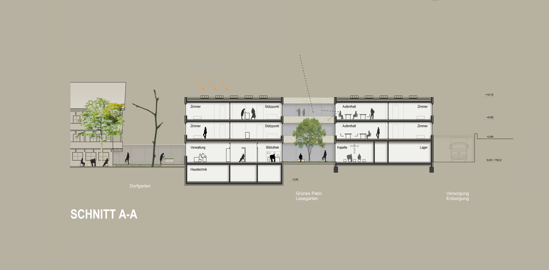 Die differenzierte Ausbildung des Gebäudes soll die Begegnung und Kommunikation zwischen den Bewohnern des Altenheims und dem restlichen Quartier fördern. Sie bietet auf der anderen Seite aber auch eine Lebenswelt mit Rückzugsmöglichkeiten und angenehm entspannter Atmosphäre. Integration, Gemeinschaft und individuelle Lebensgestaltung müssen sich gegenseitig nicht ausschließen.