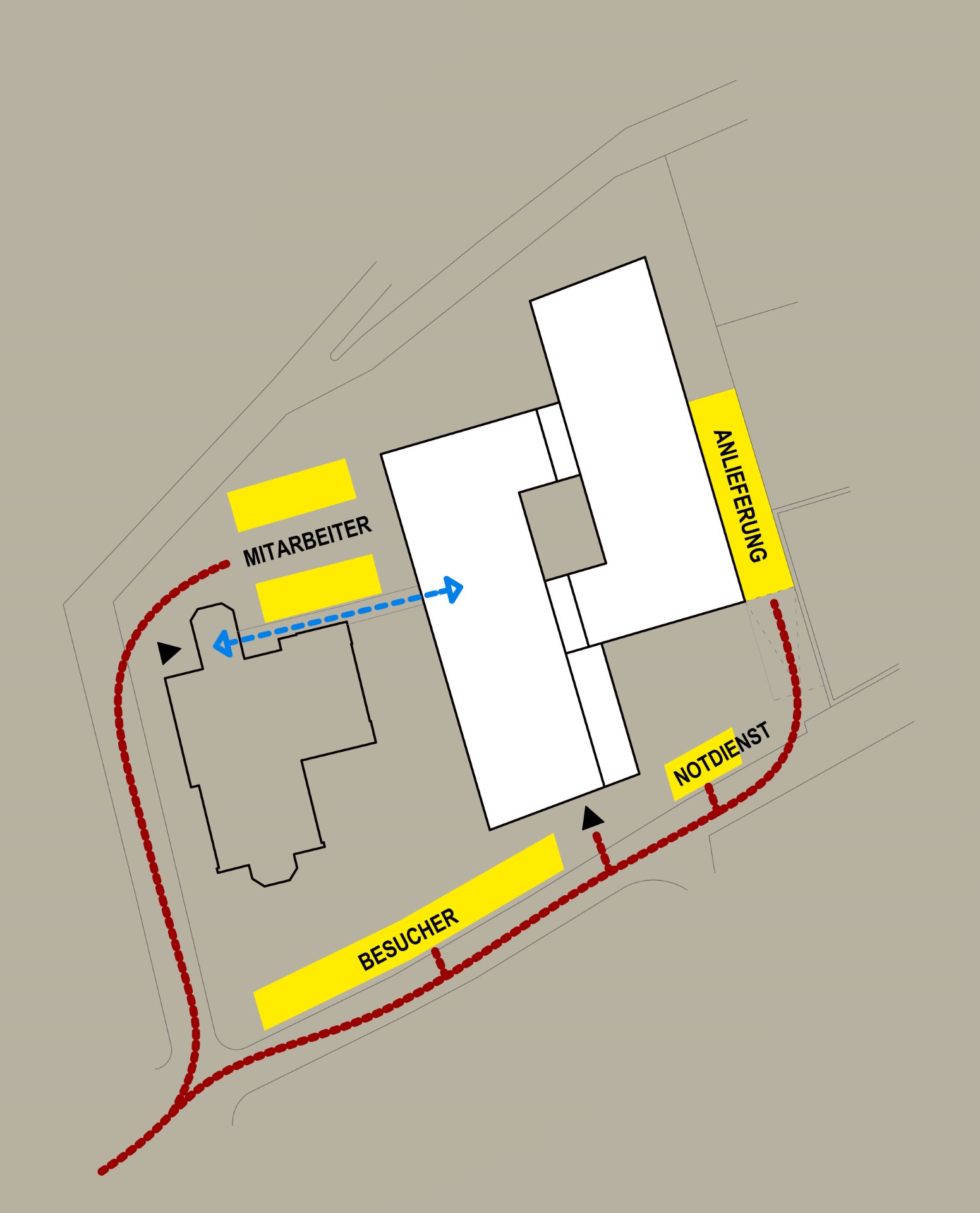 Der Neubau ist über einen Verbindungsgang an das Bestandsgebäude angebunden. Die Anlieferung und Entsorgung erfolgt getrennt von den übrigen Heimabläufen über den östlichen Wirtschaftshof. Die Besucherparkplätze sind südlich entlang der Straße situiert. Das Parken für die Mitarbeiter befindet sich konzentriert im Nordwesthof der Anlage. Notdienstfahrzeuge können direkt neben dem Haupteingang parken.