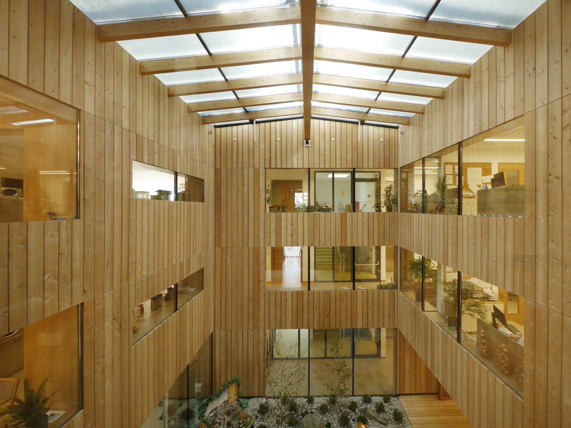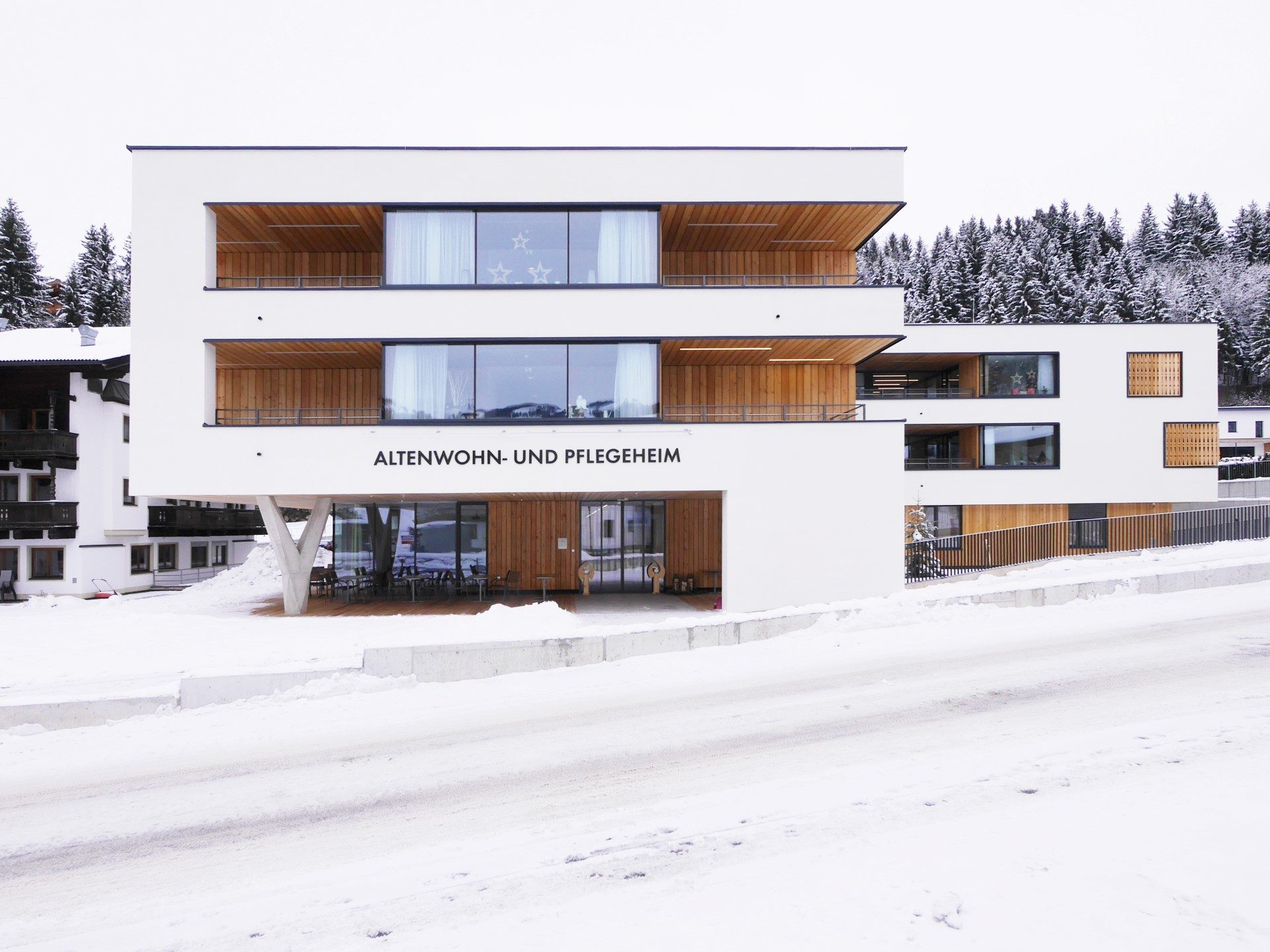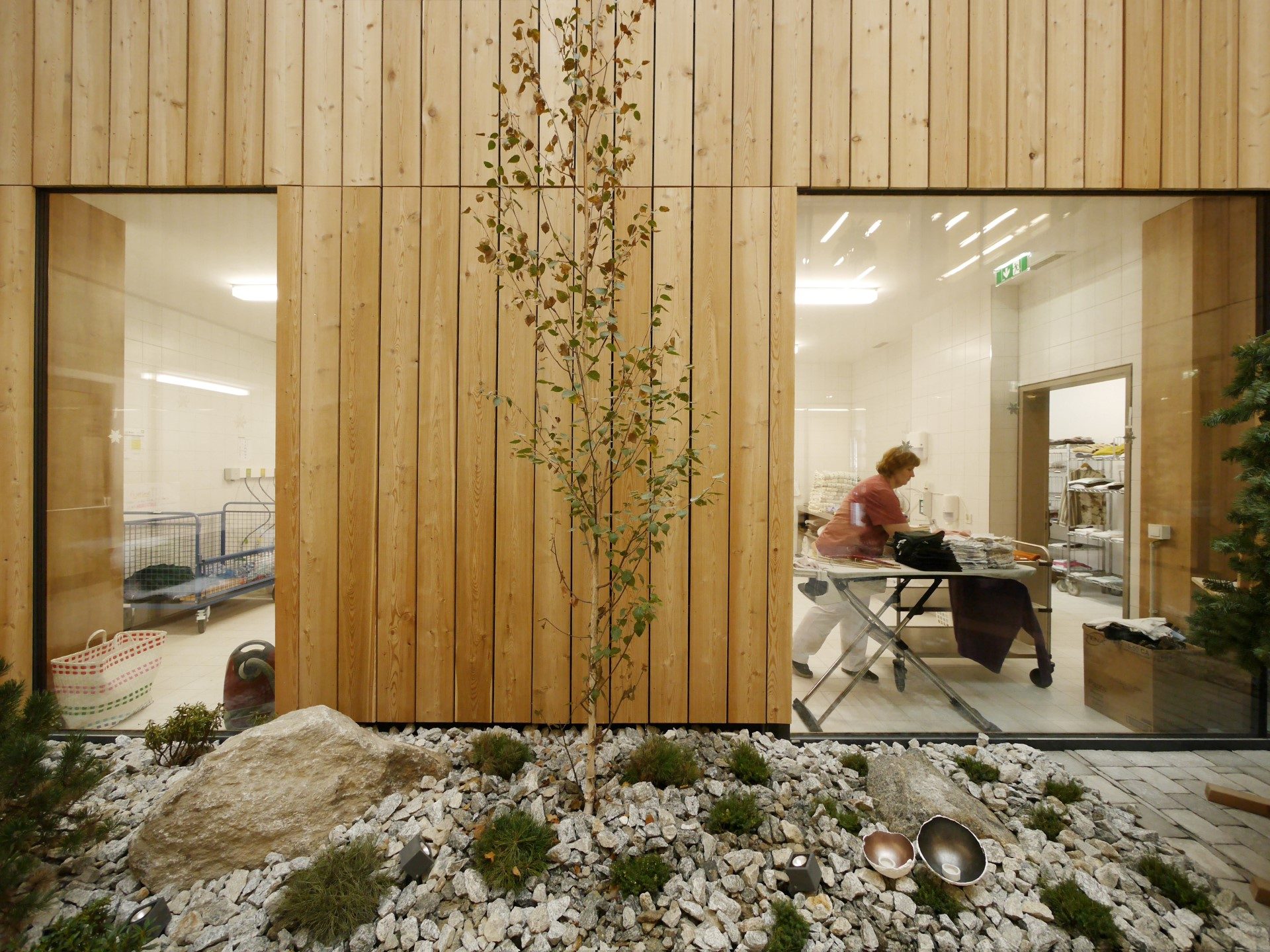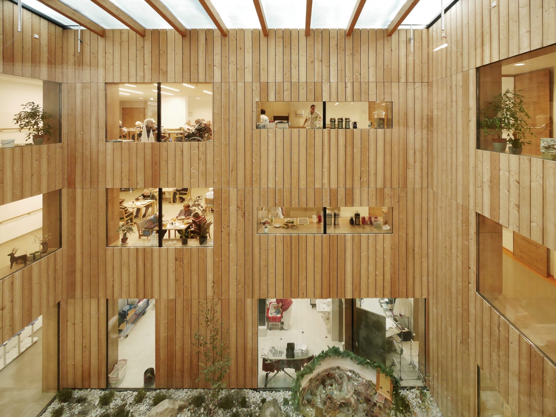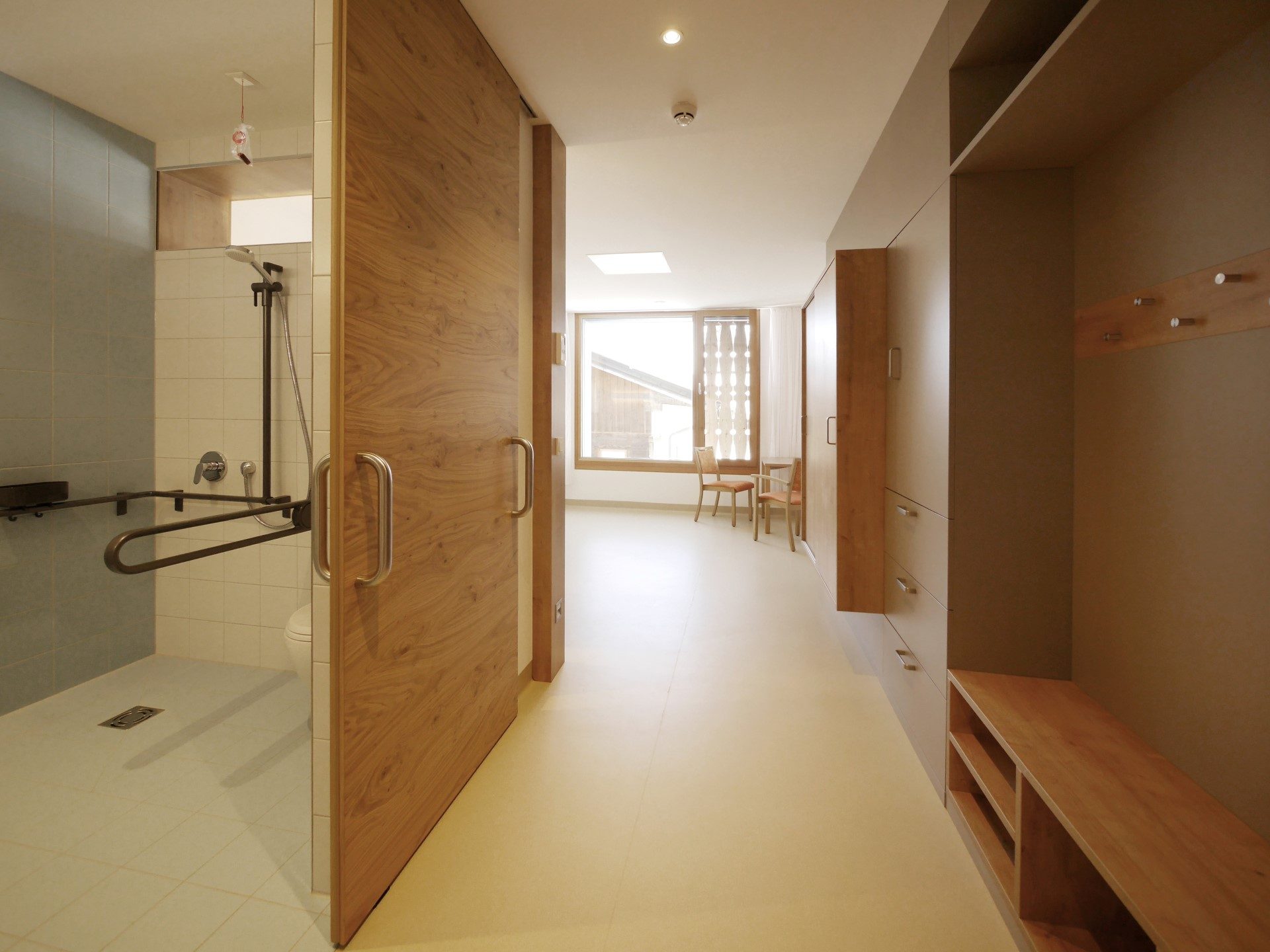 Der warme Werkstoff Holz wird zum Wegbegleiter im Inneren, er wird an Boden, Wand und Decke eingesetzt. In den Bewohnerzimmern erhalten die Böden einen Linoleumbelag. Farblich aufeinander abgestimmte Oberflächen dienen im gesamten Gebäude der Orientierung der Bewohner. Hölzerne Falt- oder Schiebeläden sorgen für den notwendigen Sonnenschutz und stellen ein Bezugselement zur gewohnten örtlichen Handwerkstradition dar.