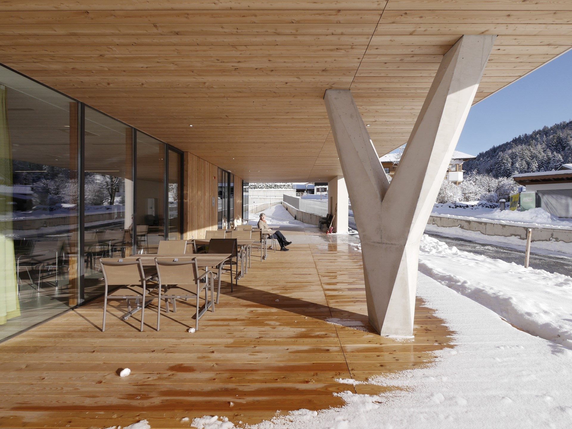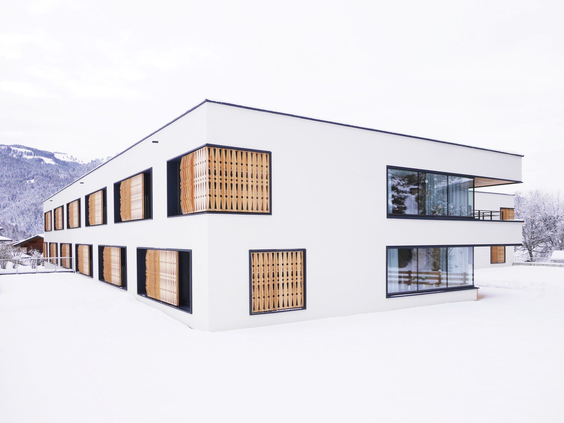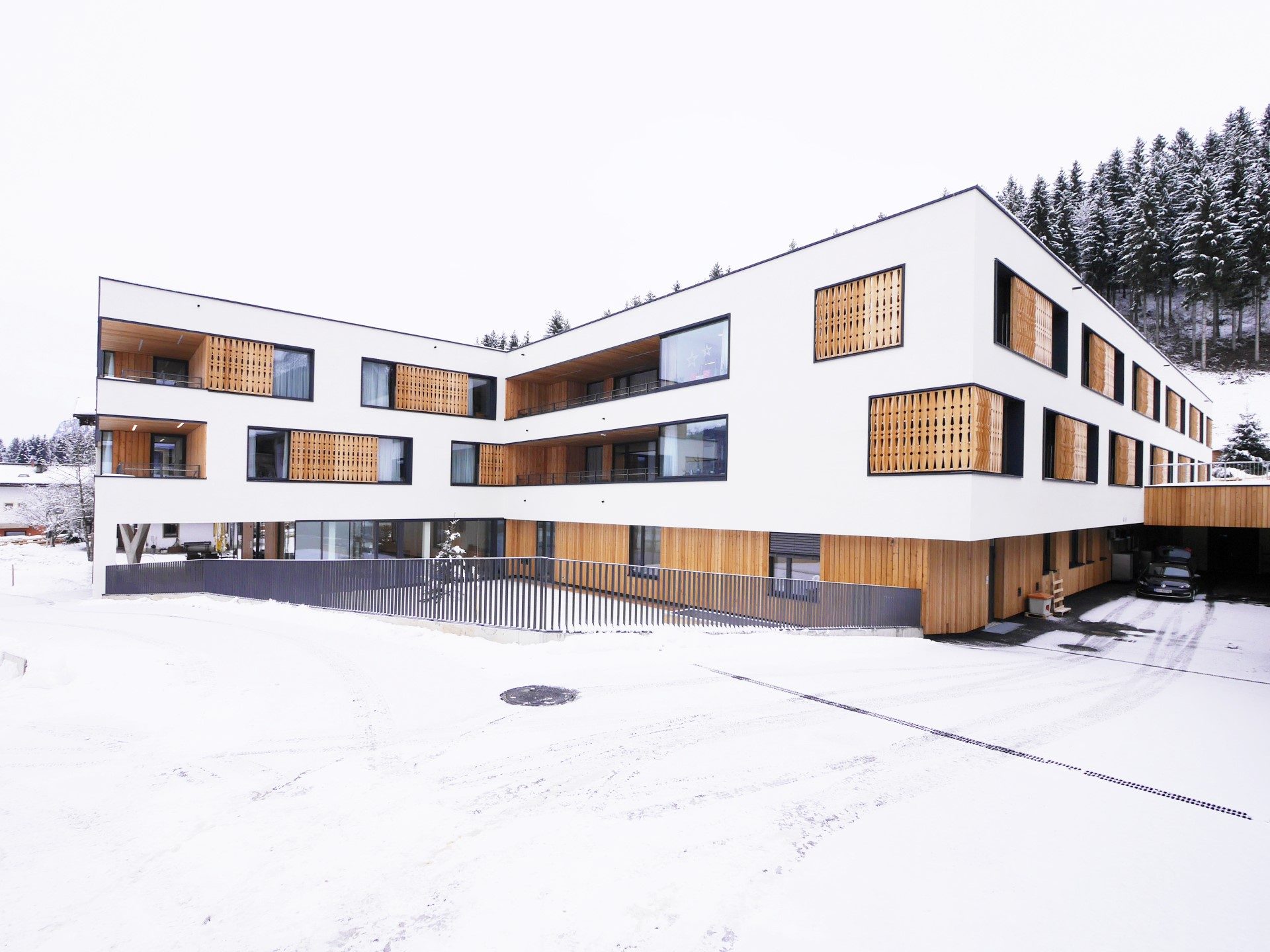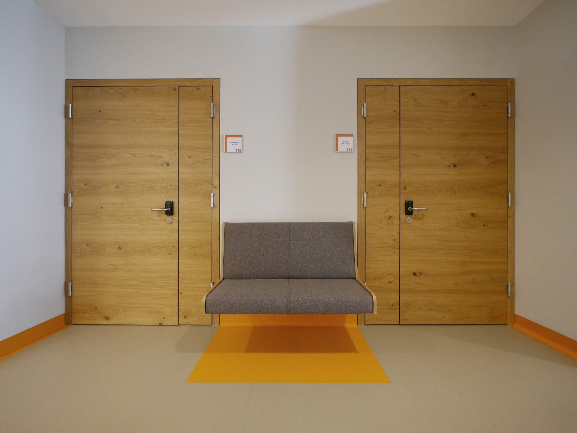 Der warme Werkstoff Holz wird zum Wegbegleiter im Inneren, er wird an Boden, Wand und Decke eingesetzt. In den Bewohnerzimmern erhalten die Böden einen Linoleumbelag. Farblich aufeinander abgestimmte Oberflächen dienen im gesamten Gebäude der Orientierung der Bewohner. Hölzerne Falt- oder Schiebeläden sorgen für den notwendigen Sonnenschutz und stellen ein Bezugselement zur gewohnten örtlichen Handwerkstradition dar.