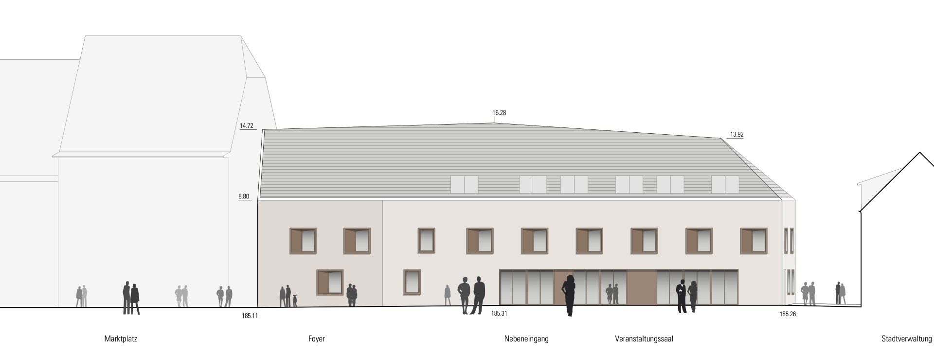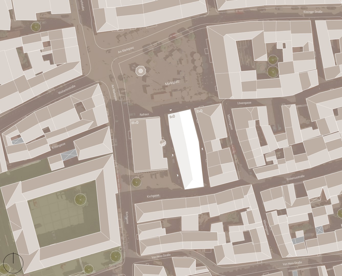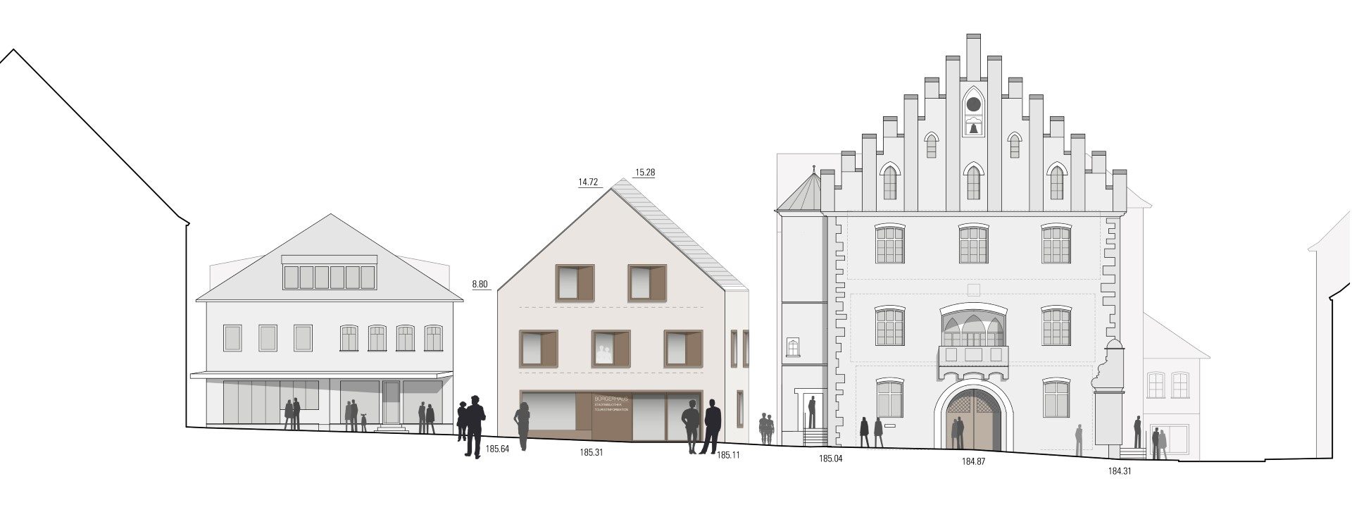 Der Marktplatz bildet den Mittelpunkt der Altstadt Hammelburgs und bietet eine hohe Aufenthaltsqualität. Er wird von überwiegend zwei- bis dreigeschossigen, traufständigen Gebäuden mit Satteldach flankiert. Thematisch ergänzt das neue Bürgerhaus die kulturellen und sozialen Einrichtungen im Südwesten des Marktplatzes. Die gestalterische Einheit der Platzkante soll durch den Umbau zum Bürgerhaus gestärkt werden. Das zweigeschossige Bestandsgebäude bekommt einen neuen Giebel zum Markt und wird dadurch als öffentliches Gebäude im Stadtraum erkennbar, ohne dem hochaufragenden giebelständigen Rathaus die räumliche Dominanz zu nehmen. Die Dachneigung wird beim Umbau zum Bürgerhaus an die Dachneigung des Rathauses angeglichen. Der östliche Nachbar wird dadurch nicht beeinträchtigt, Belichtung und Belüftung bleiben gewährleistet. Zur Frobeniusstraße wird ein Walmdach ausgebildet. Die Gesamtkubatur des Bürgerhauses orientiert sich bis auf den neuen Giebel am bestehenden Kaufhaus. Die altstadttypische enge Stellung zu den Nachbargebäuden bleibt erhalten.