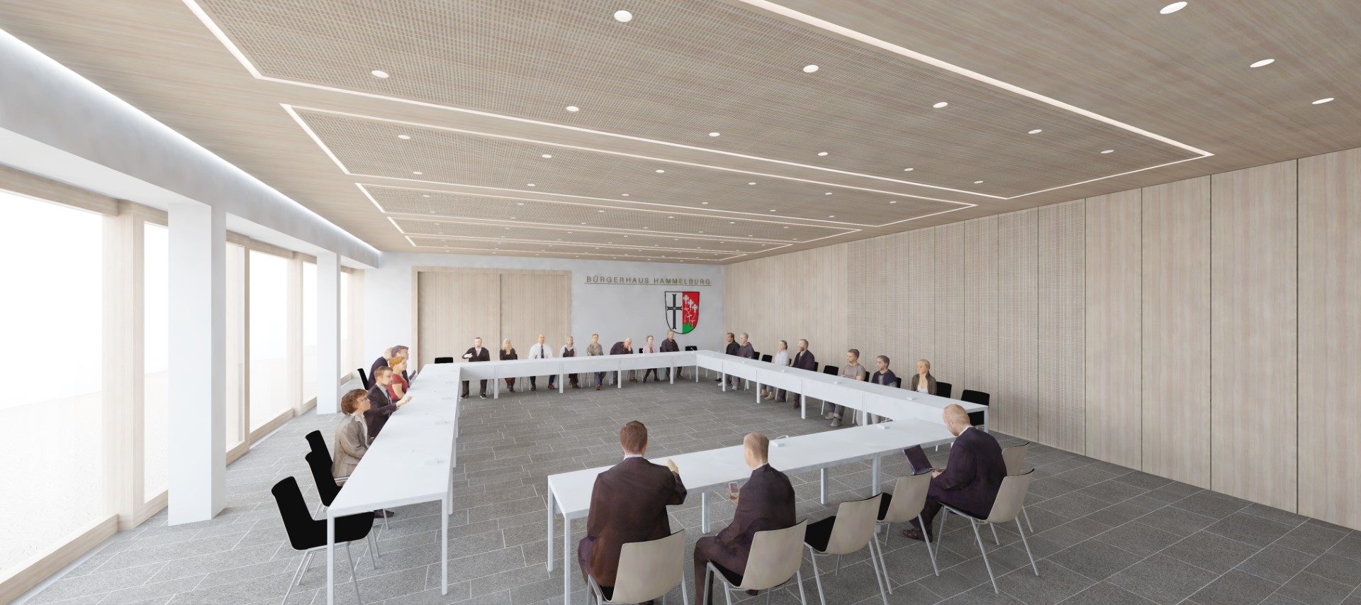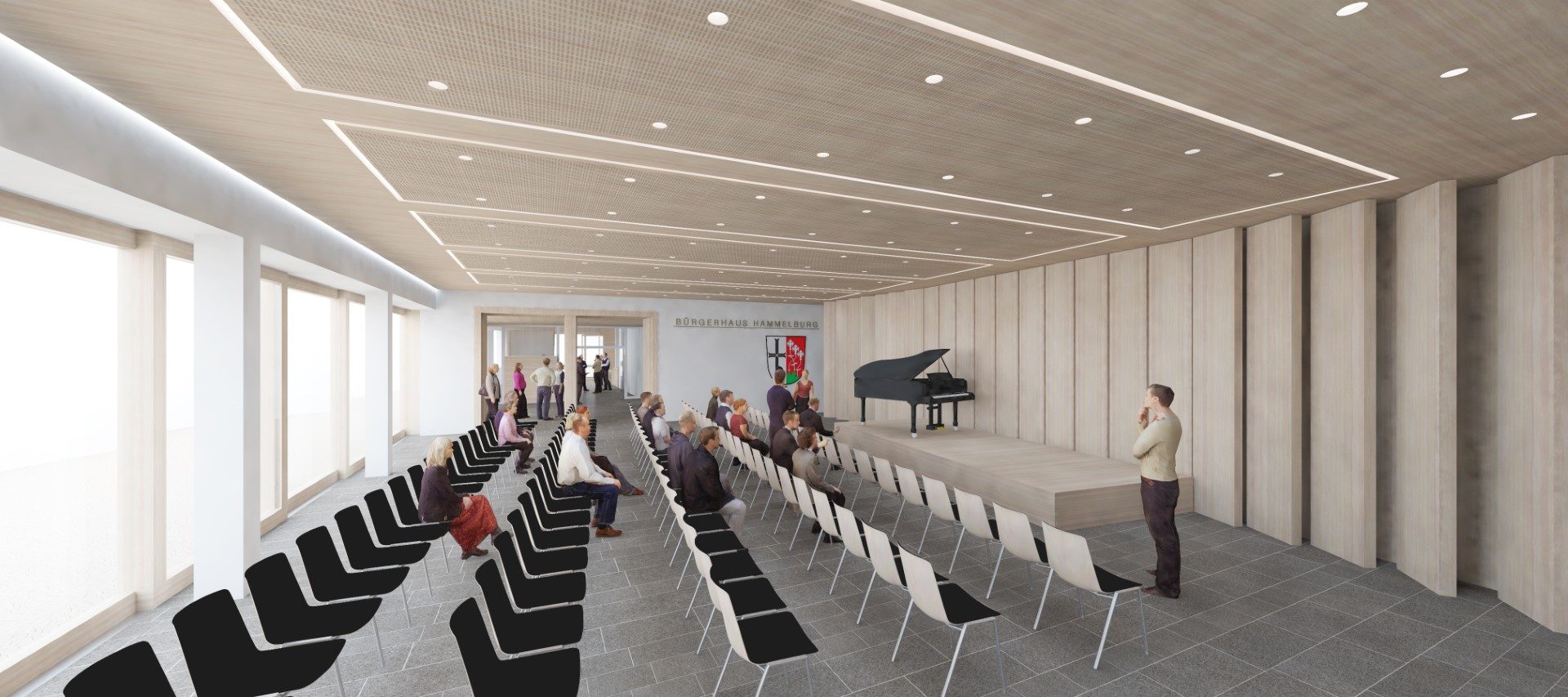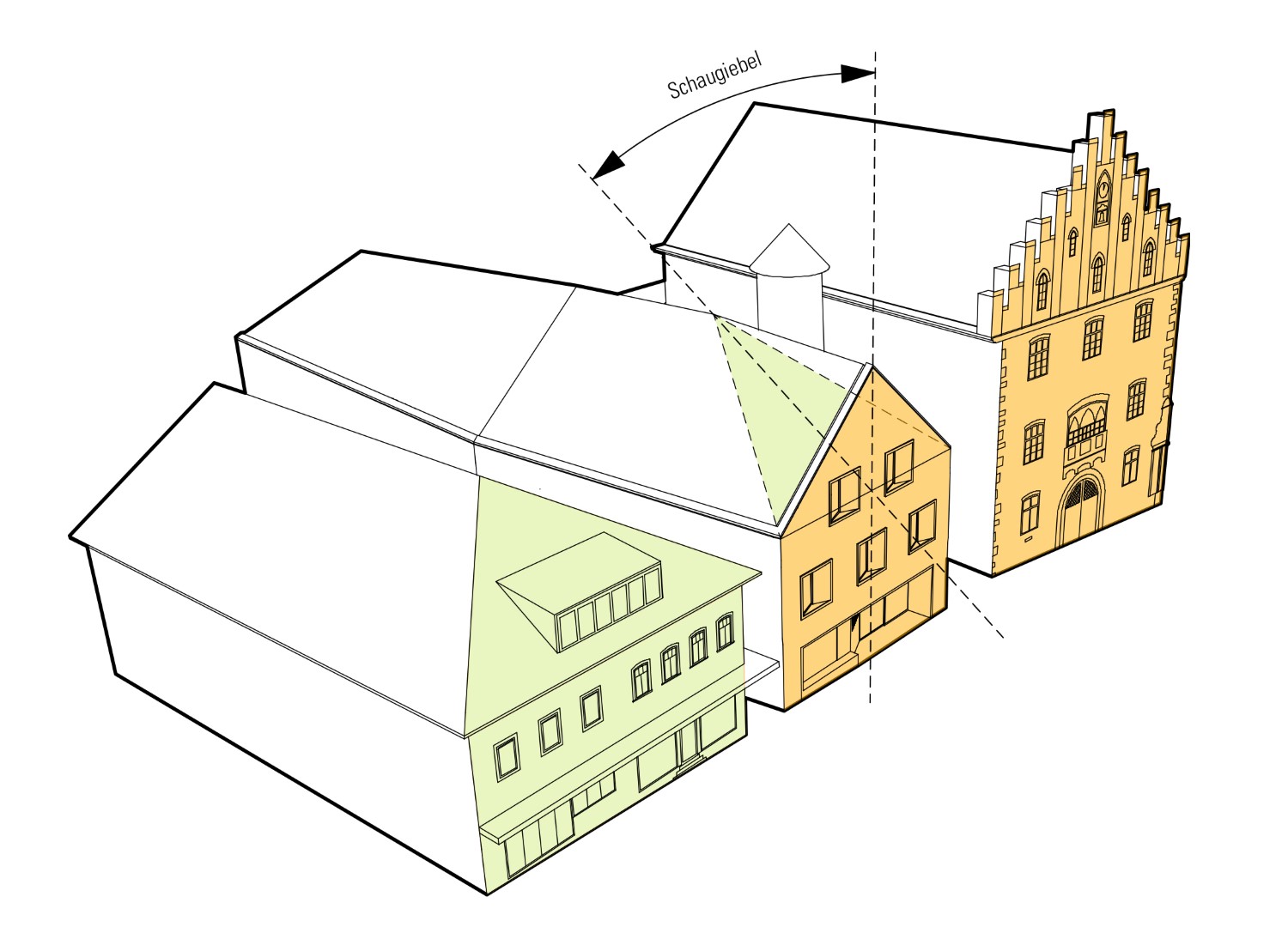 Der Marktplatz bildet den Mittelpunkt der Altstadt Hammelburgs und bietet eine hohe Aufenthaltsqualität. Er wird von überwiegend zwei- bis dreigeschossigen, traufständigen Gebäuden mit Satteldach flankiert. Thematisch ergänzt das neue Bürgerhaus die kulturellen und sozialen Einrichtungen im Südwesten des Marktplatzes. Die gestalterische Einheit der Platzkante soll durch den Umbau zum Bürgerhaus gestärkt werden. Das zweigeschossige Bestandsgebäude bekommt einen neuen Giebel zum Markt und wird dadurch als öffentliches Gebäude im Stadtraum erkennbar, ohne dem hochaufragenden giebelständigen Rathaus die räumliche Dominanz zu nehmen. Die Dachneigung wird beim Umbau zum Bürgerhaus an die Dachneigung des Rathauses angeglichen. Der östliche Nachbar wird dadurch nicht beeinträchtigt, Belichtung und Belüftung bleiben gewährleistet. Zur Frobeniusstraße wird ein Walmdach ausgebildet. Die Gesamtkubatur des Bürgerhauses orientiert sich bis auf den neuen Giebel am bestehenden Kaufhaus. Die altstadttypische enge Stellung zu den Nachbargebäuden bleibt erhalten.