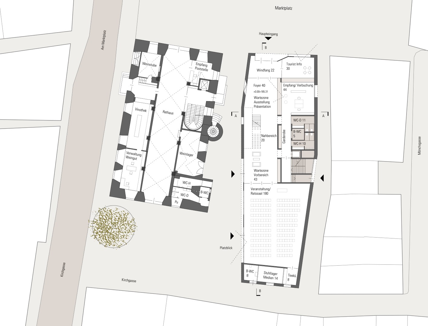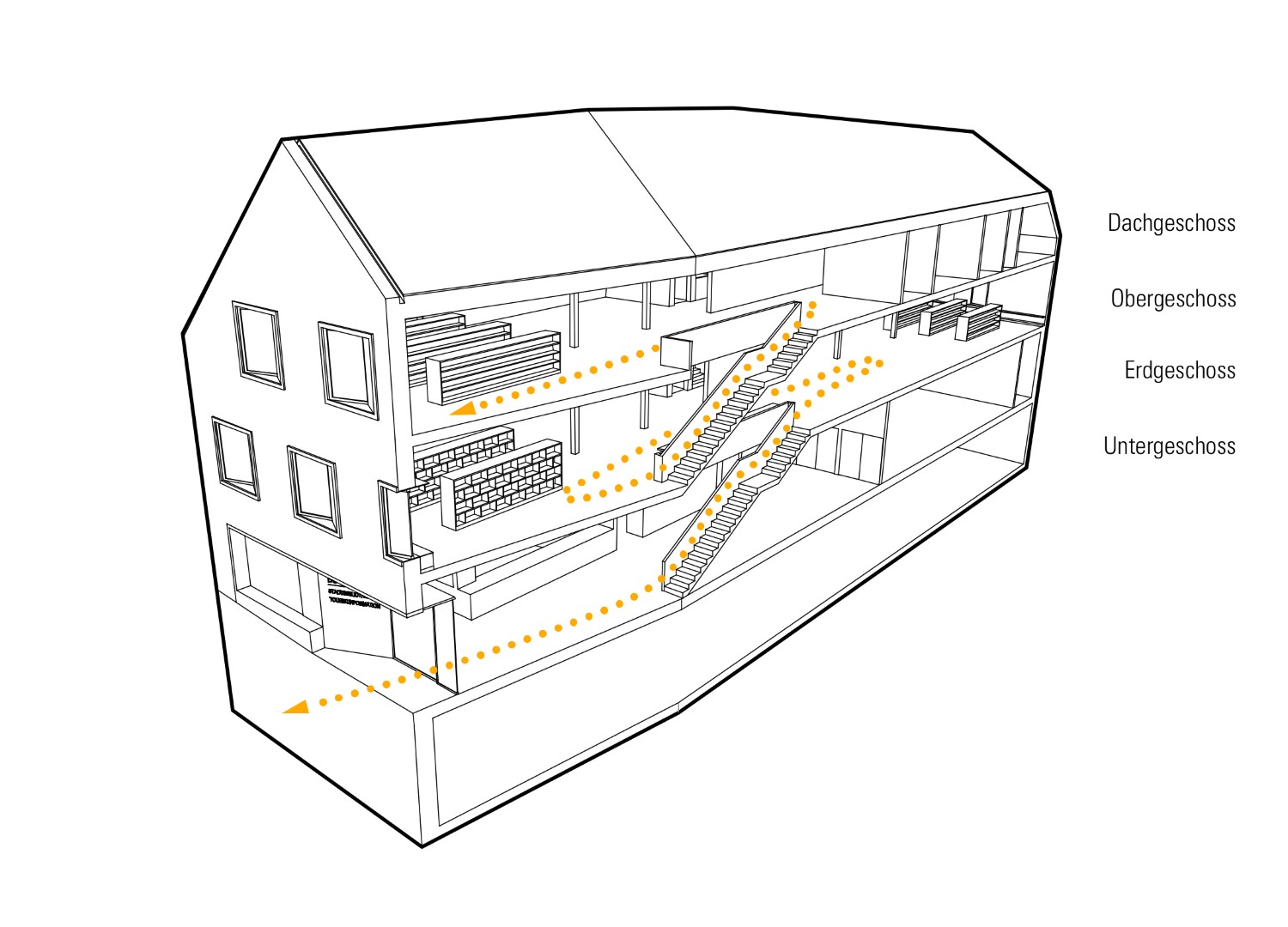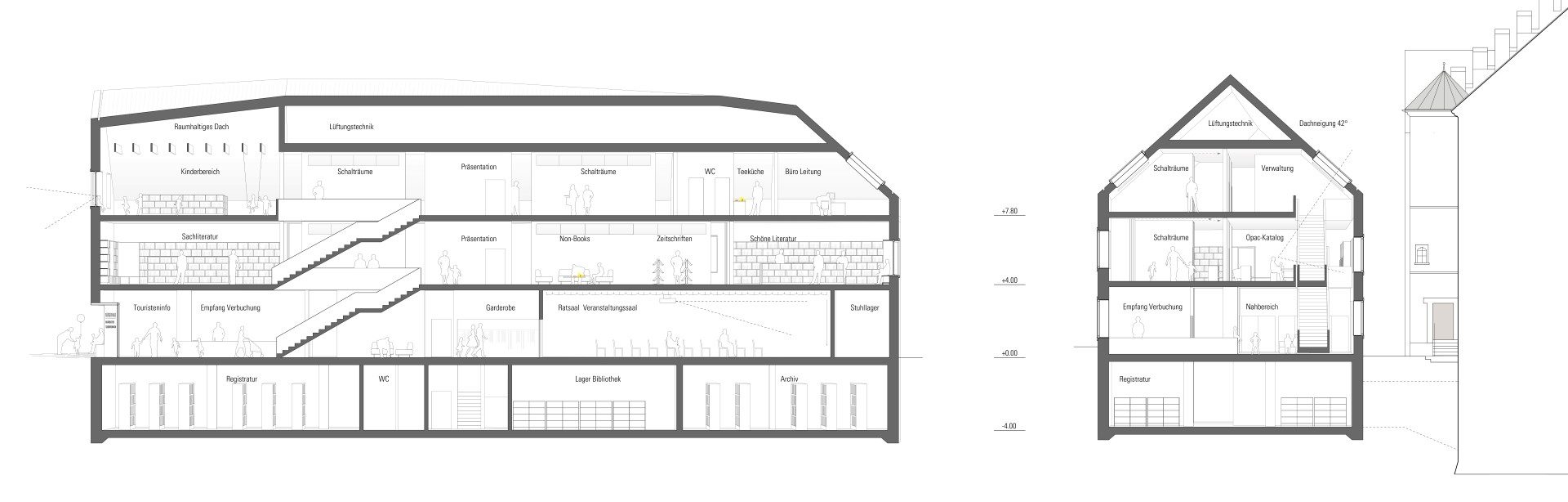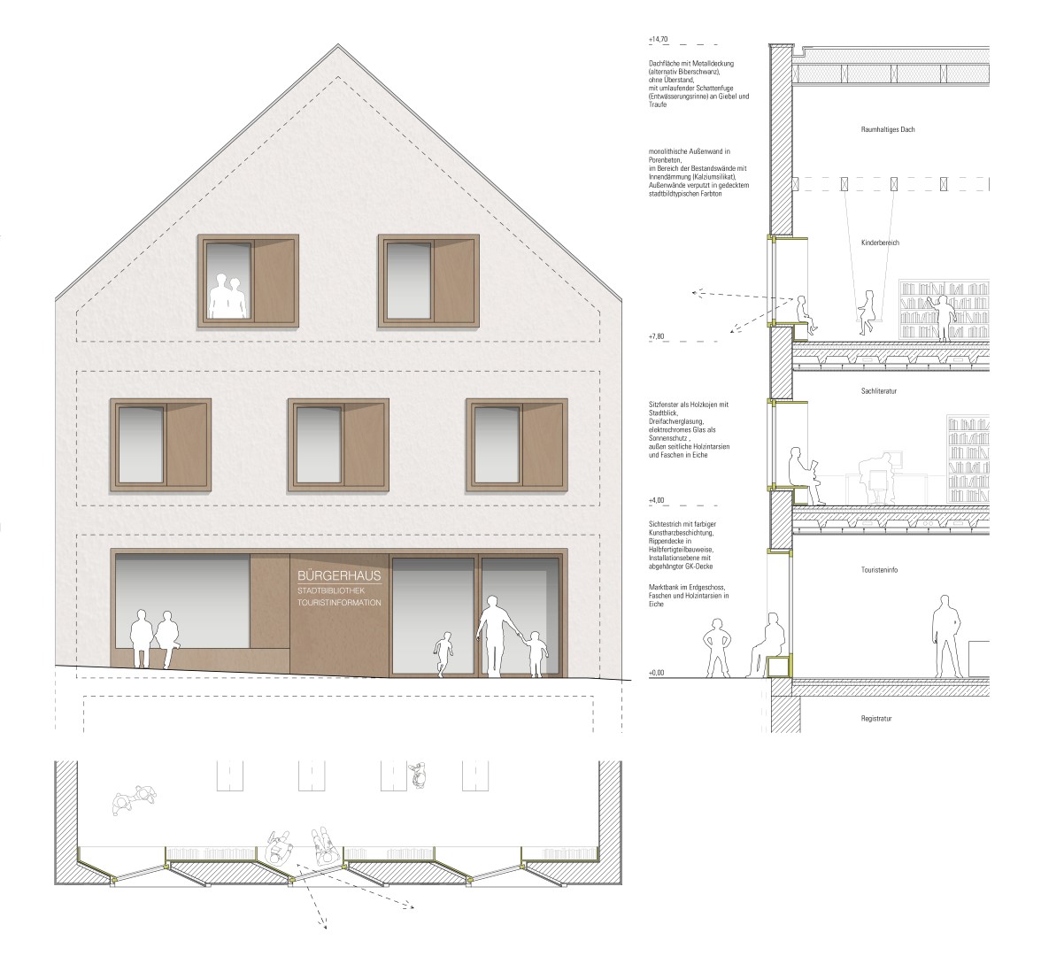 Über den Haupteingang gelangt man direkt in die Touristen-Information. Sie stellt für Touristen genauso wie für Einheimische die erste Anlaufstelle in Hammelburg dar. Direkt im Anschluss zur Informationstheke befindet sich der Bibliotheksempfang mit Verbuchungsstelle. Garderobe, WC- und Serviceräume sind für die Besucher auf kurzem Wege erreichbar. Im Eingangsbereich der Bibliothek befinden sich neben der Wartezone auch Präsentations- und Ausstellungsflächen. Die Bibliothek ist 3-geschossig als Kommunikations- und Leselandschaft entwickelt. Der Innenraum wird in “Stuben” zoniert, die eine gemütliche Atmosphäre ausstrahlen und zum Verweilen einladen. Über eine offene einläufige Treppe gelangt man vom Empfang in die Obergeschosse der Bibliothek. Im ersten Obergeschoss befinden sich die Sachbücher, der Bereich für Schöne Literatur, Non-Books Medien und Zeitschriften. In unmittelbarer Nähe zur Treppe stehen Flächen für Präsentationen zur Verfügung. Im zweiten Obergeschoss ist der großzügige und räumlich besonders spannende Kinder- und Jugendbereich untergebracht. Schalträume in den Kernzonen können flexibel als Lern- und Leseräume genutzt werden. Die Flächen sind auch für größere Kinder- und Schul- gruppen geeignet. Hölzerne Sitzfenster sind zu allen wichtigen Seiten hinaus orientiert. Sie bringen Licht ins Innere der Bibliothek, ermöglichen abwechslungsreiche Ausblicke in die Altstadt und laden zum entspannten Schmökern und Relaxen ein. Sowohl die Raumsequenz, als auch die Erschließung ist so flexibel organisiert, dass eine langfristige Umnutzungsmöglichkeit der Bibliothek gegeben ist. So legt das Bürgerhaus durch eine nachhaltige Raumorganisation den Grundstein für ein zukunftsfähiges Gebäude im Herzen der Stadt.