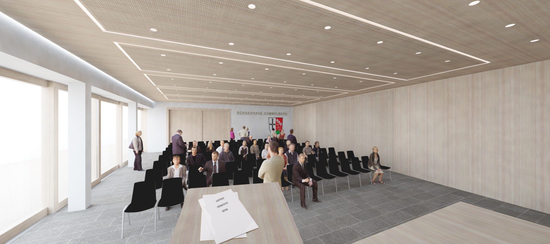 Der flexibel nutzbare große Saal befindet sich im Erdgeschoss. Er orientiert sich mit seiner geschosshohen Verglasung zum Buttenmarkt und kann mit Vortrags- oder Ratsbestuhlung vielseitig Verwendung finden. Bei öffentlichen Veranstaltungen kann der Buttenmarkt mitgenutzt werden.