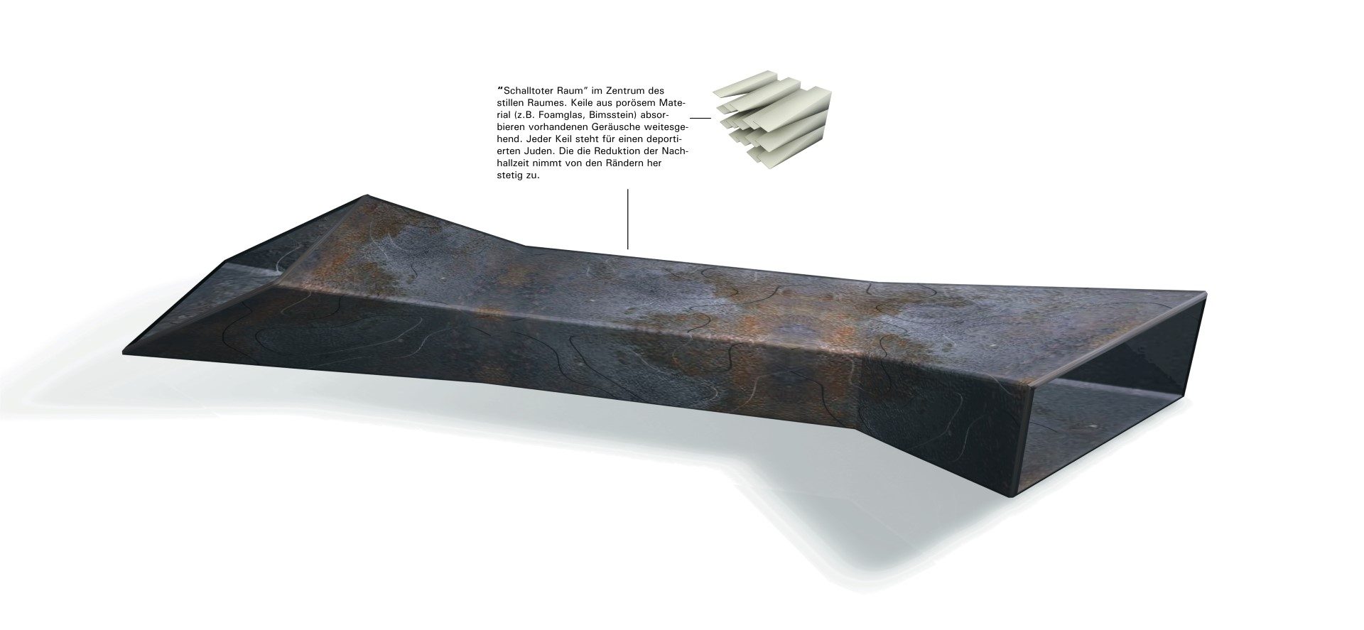 Die inselartig veränderte Akustik markiert den Ort und symbolisiert gleichzeitig das Leid und die menschlichen Schicksale, die mit ihm verbunden sind.“Camera Silenta“ nimmt den Verlauf der alten Schienen auf und ist deshalb andauernde Spur ihrer Existenz.