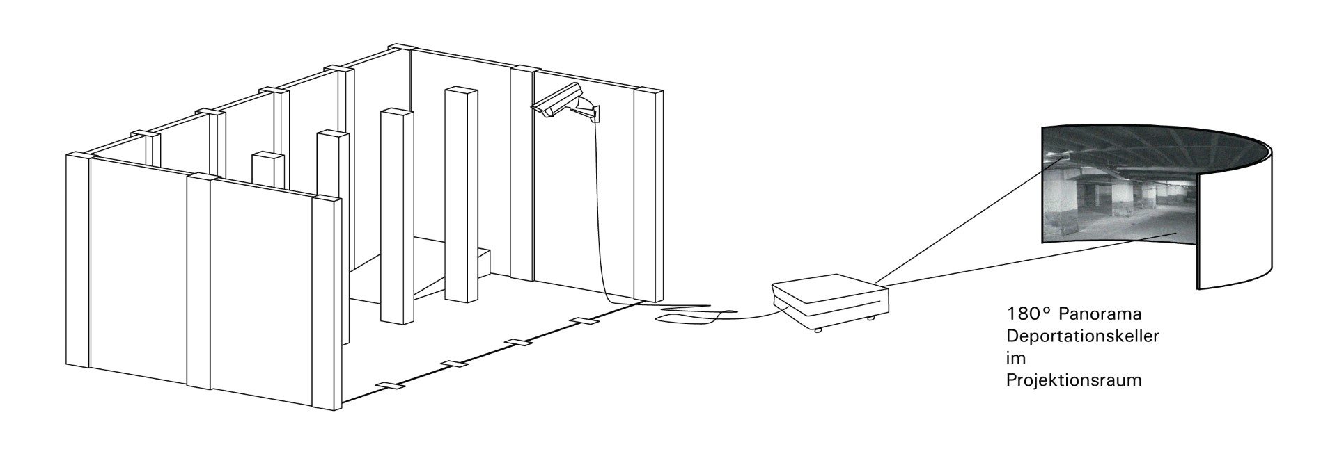 Über diese Fensteröffnungen in Augenhöhe kann der Passant aber auch von außen in den Erdgeschossraum des Stellwerkes hineinblicken. In diesem “Projektionsraum“ findet er eine Videoprojektion der nicht zugänglichen Kellerräume in der Großmarkthalle als live-Übertragung. Eine künstlerische Metapher, ein Bild eines heute leeren Raumes, entrückt und dennoch existent, ein Stück deutsch-jüdischer Vergangenheit und menschlicher Schicksale, gleichzeitig ein Appell an die Vernunft …