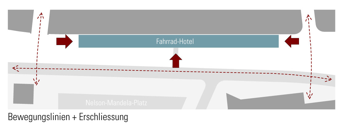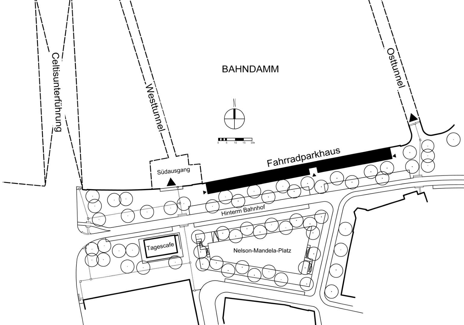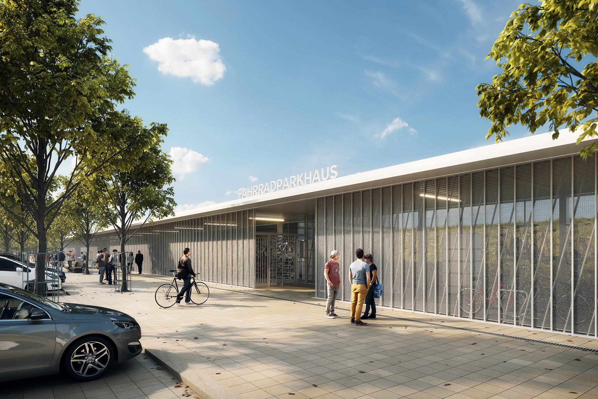 Am Südausgang des Hauptbahnhofes, am Nelson-Mandela-Platz soll in Zusammenarbeit mit den städtischen Ämtern ein gesichertes Fahrradparkhaus entstehen.