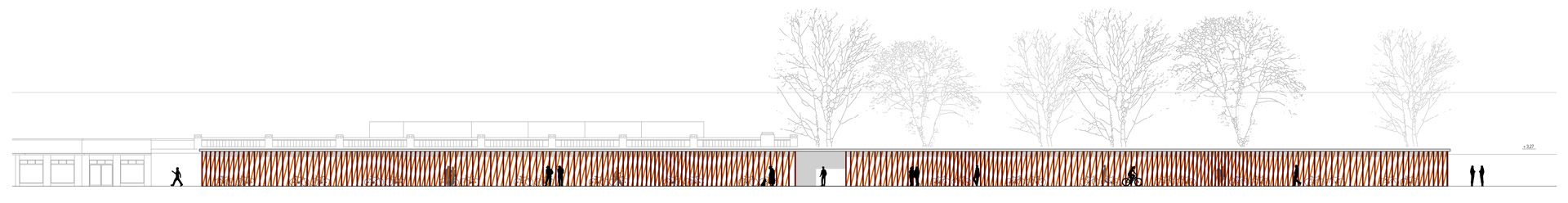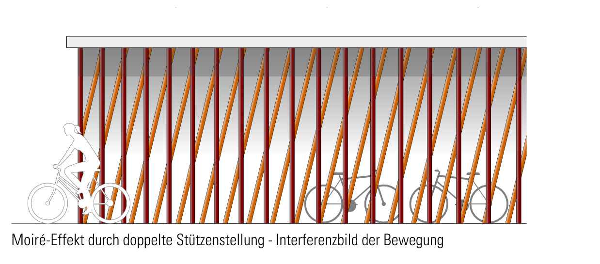 Die Fassade des Parkhauses nimmt in abstrahierter Form das Thema des Radfahrens auf.