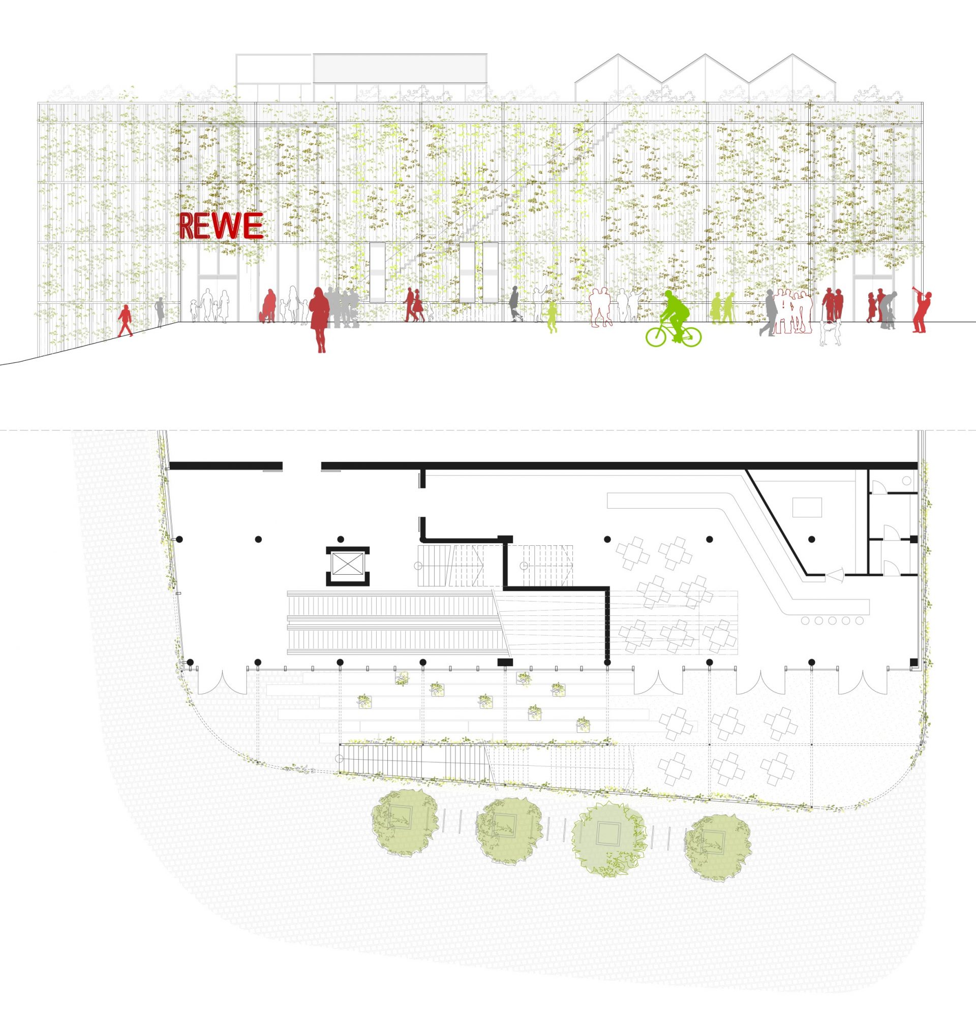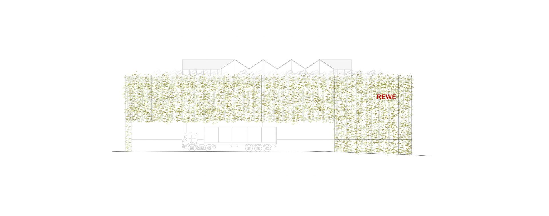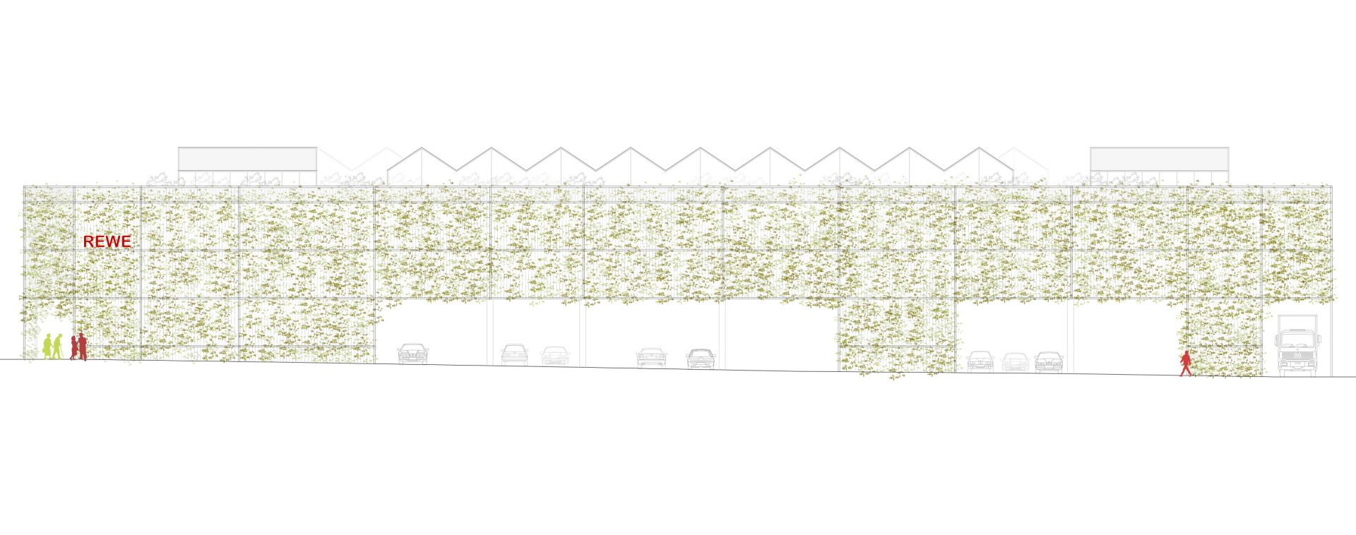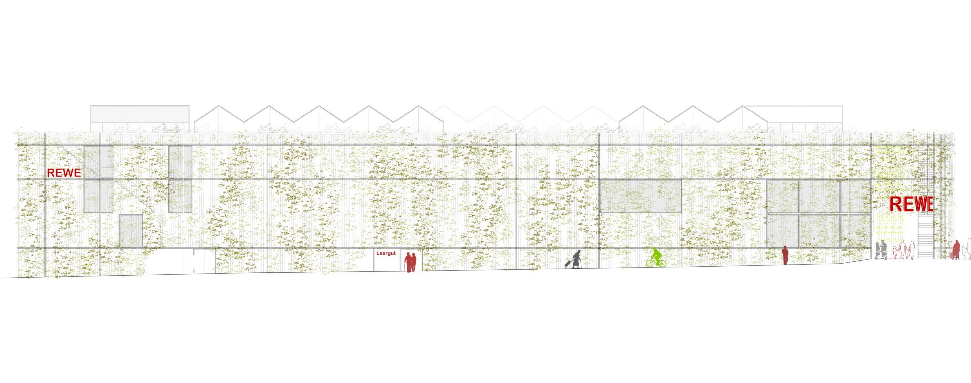 Die Fassade des neuen REWE-Marktes wird in zwei Schichten gedacht: