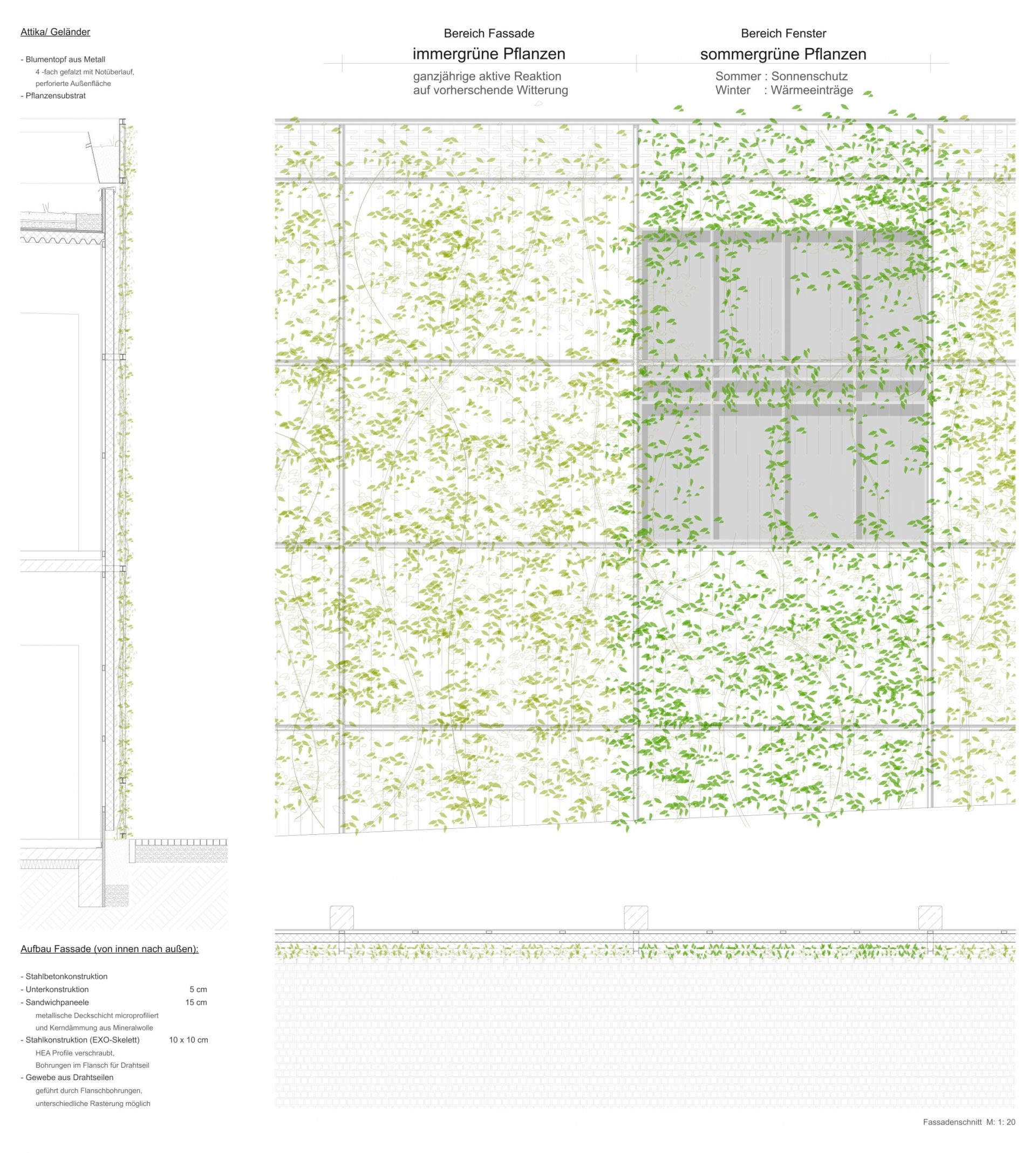 Durch die Komposition aus immergrünen und nur sommergrünen Pflanzen lässt sich der Licht- und Wärmeeintrag auf die Fassade bzw. die Fensterflächen gezielt steuern. Die grüne Fassade hilft, Schadstoffe und CO2 zu binden. Sie sorgt für Abkühlung im Sommer und hat ganzjährig positiven Einfluss auf den urbanen Evapotranspirationsfaktor (Verdunstungsfaktor).