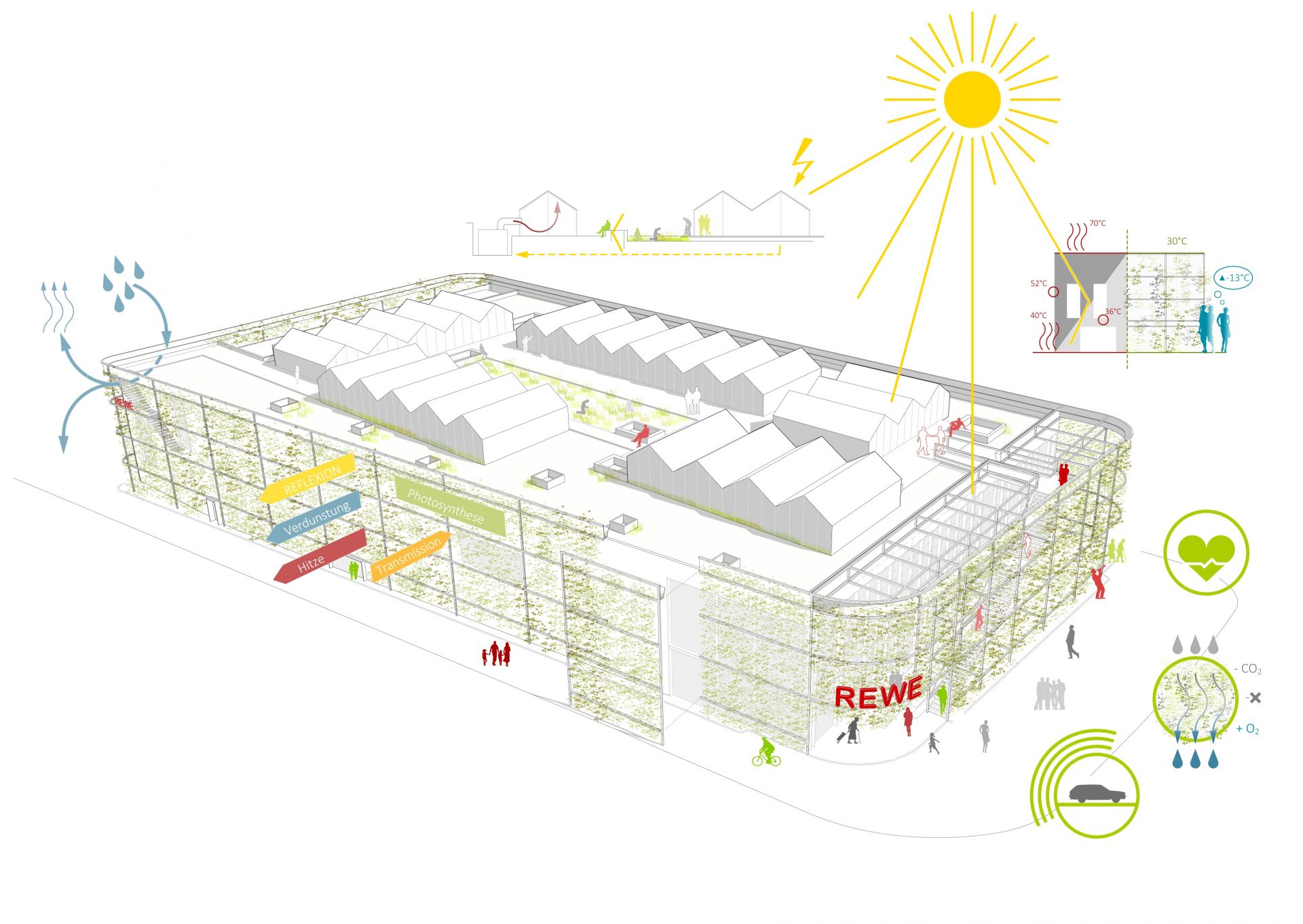 Neben den 4 vertikalen Fassaden wollen wir vor allem auch das Potential der Fünften Ansicht, der Dachfläche, betrachten. Hier könnten Überlegungen, die über eine standardmäßige extensive Begrünung hinaus gehen, ganz neue Horizonte für die Marktbetreiber und den ganzen Stadtteil eröffnen. In Zeiten, in denen unsere Gesellschaft vehement über den Klimawandel und den globalen Warentransportwahn diskutiert, könnte die Dachfläche des REWE-Centers mit ihren 2.340 m2 ein echtes Exempel für Nachhaltigkeit setzen. Warum geht man bei der Dachbegrünung nicht einen oder zwei Schritte weiter und nutzt die Dachfläche für die urbane Landwirtschaft und gibt sie so der Stadt zurück? Freiluftpflanzbeete und Gewächshäuser könnten einen Teil des regionalen Gemüses und der Kräuter produzieren, die im REWE-Markt angeboten werden. Das Versprechen an die Kunden bezüglich Frische und Regionalität wird direkt auf dem Dach in die Tat umgesetzt. Die Restenergie aus dem Supermarktbetrieb könnte im Winter die Gewächshäuser beheizen. Ein energetisch-ökologischer Kreislauf mit Vorbildfunktion.