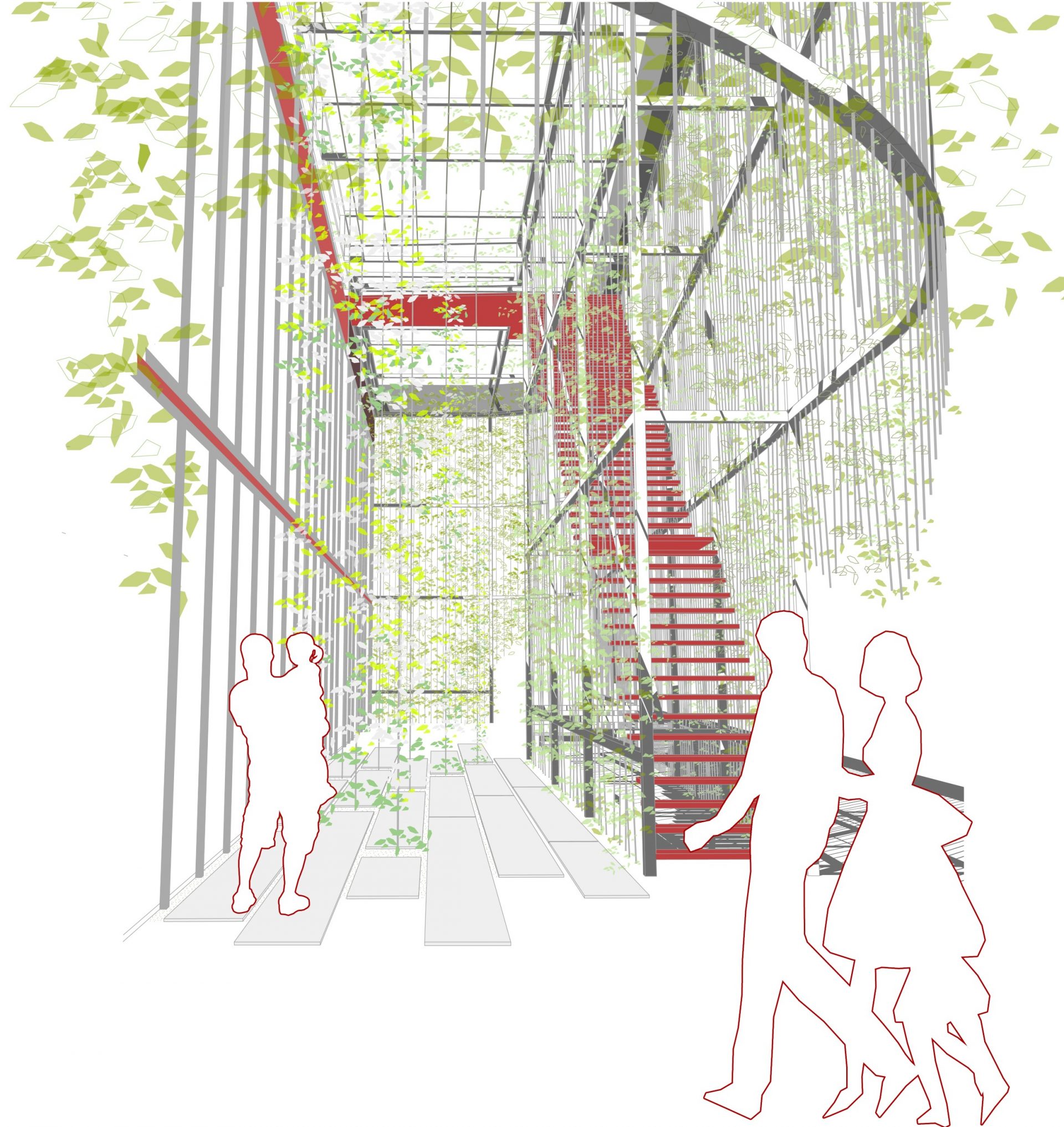 Die Begrünung wirkt auch als Schallabsorber und reduziert dadurch Verkehrslärm. Gerade für den Eingangsbereich mit Außenbestuhlung ist das ein Argument. Hier wird das Exo-Skelett raumgreifend ausformuliert. Es entsteht eine künstlerisch inszenierte, geschützte und zugleich einladende Vorzone mit Aufenthaltsqualität als Aushängeschild des Marktes. In dieser Vorzone wird auch eine Außentreppe integriert, die bis hinauf aufs Dach führt.