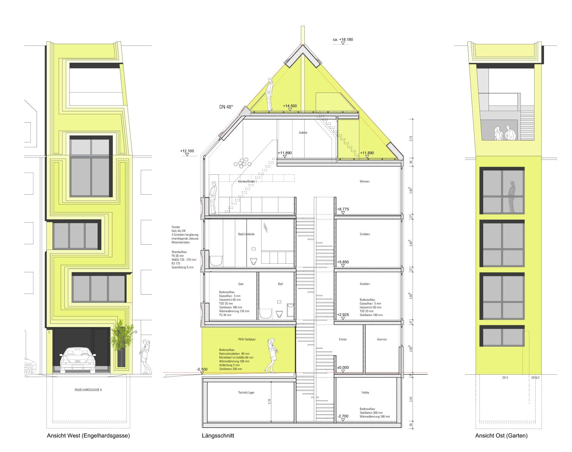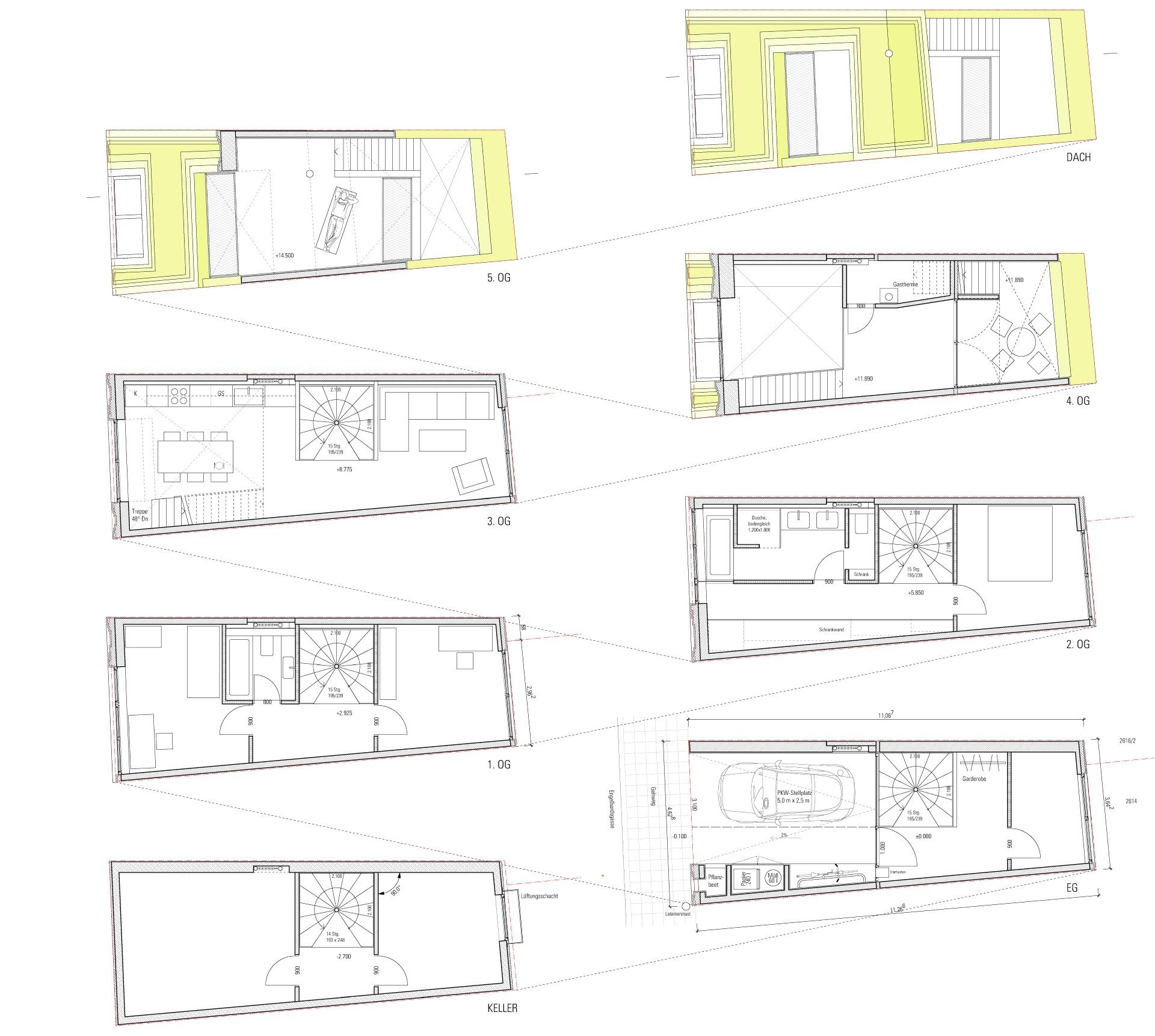 Auf dem straßenseitig nur 4,6 m breiten und 11 m tiefen sich zum Innenhof auf 3,6 m verjüngenden Grundstück entsteht ein Wohnhaus für eine Familie über mehrere Geschosse. Die in den oberen Geschossen angeordneten Wohnbereiche haben direkten Zugang zur Dachterrasse, die sich über zwei Ebenen erstreckt und den Blick auf die Altstadt öffnet. Die privaten Schlafbereiche befinden sich in den darunter liegenden Geschossen.