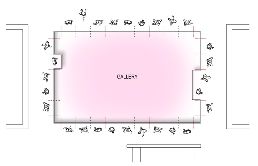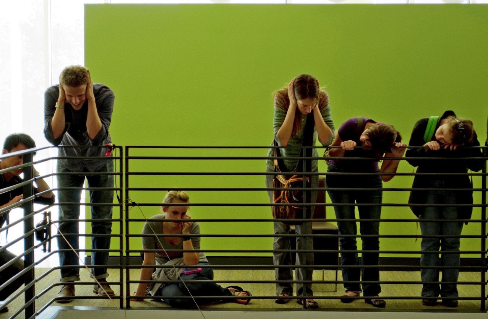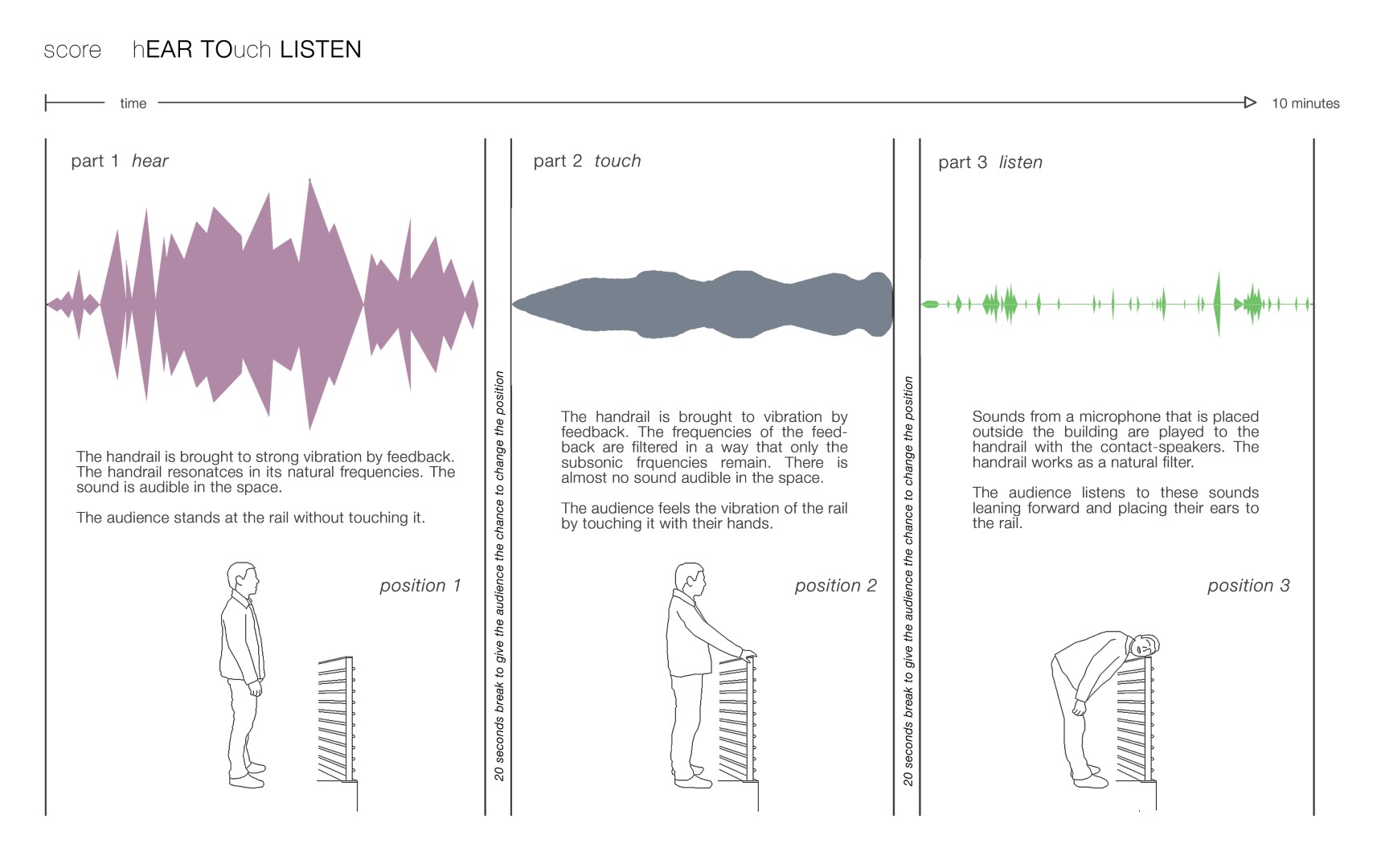 The audience leans forward and holds their ears to the handrail. Sounds from outside the building(traffic, birds, people talking) are live played via the contact-speakers to the handrail. The handrail works as a natural filter. The natural resonance of the handrail limits the ambient sounds from outsidethe building to the frequencies of the handrail.