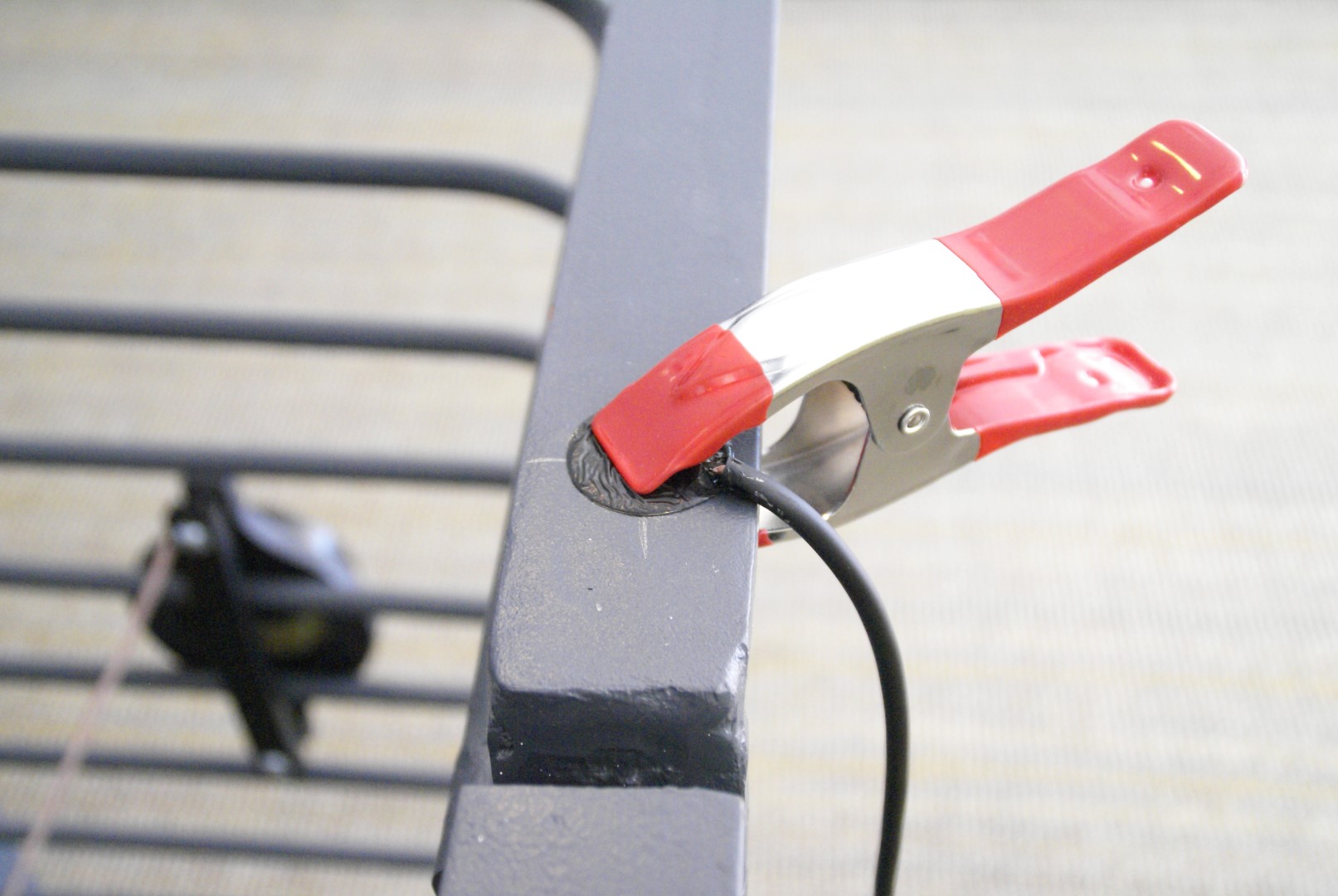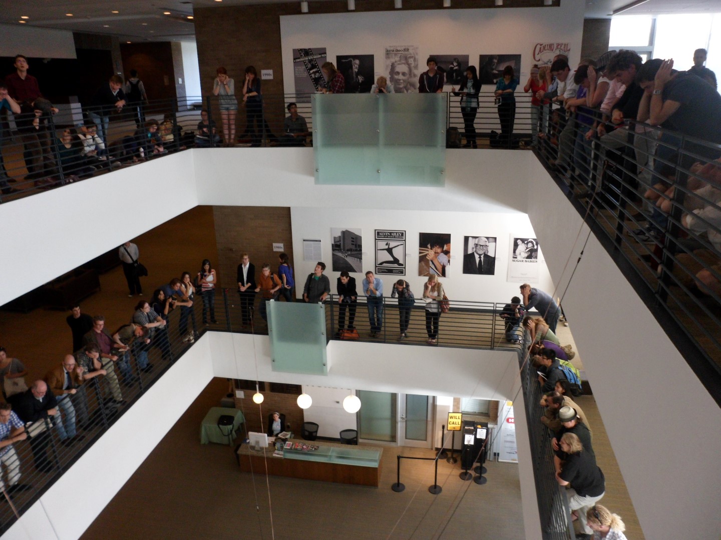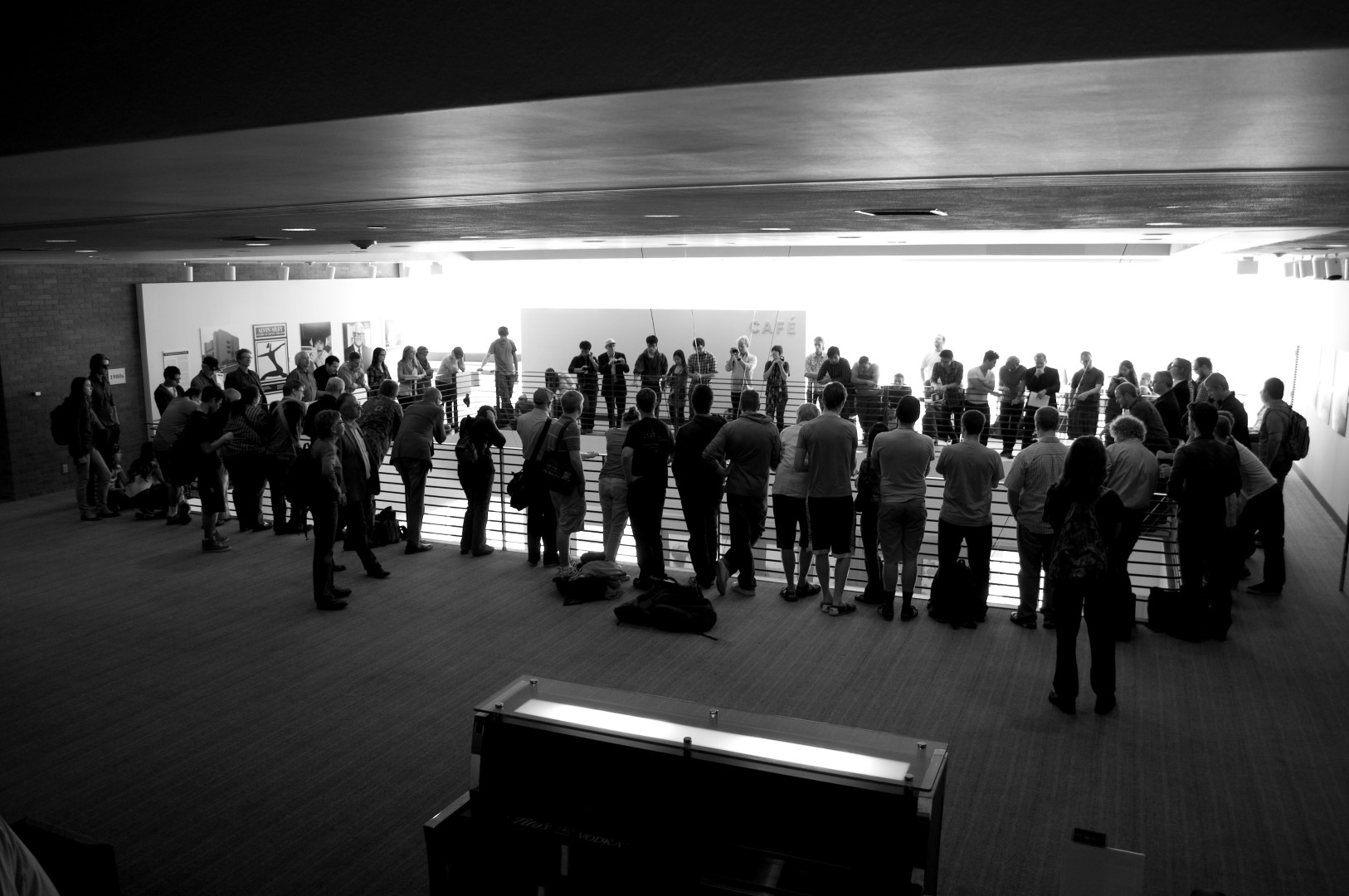 The audience leans forward and holds their ears to the handrail. Sounds from outside the building(traffic, birds, people talking) are live played via the contact-speakers to the handrail. The handrail works as a natural filter. The natural resonance of the handrail limits the ambient sounds from outsidethe building to the frequencies of the handrail.