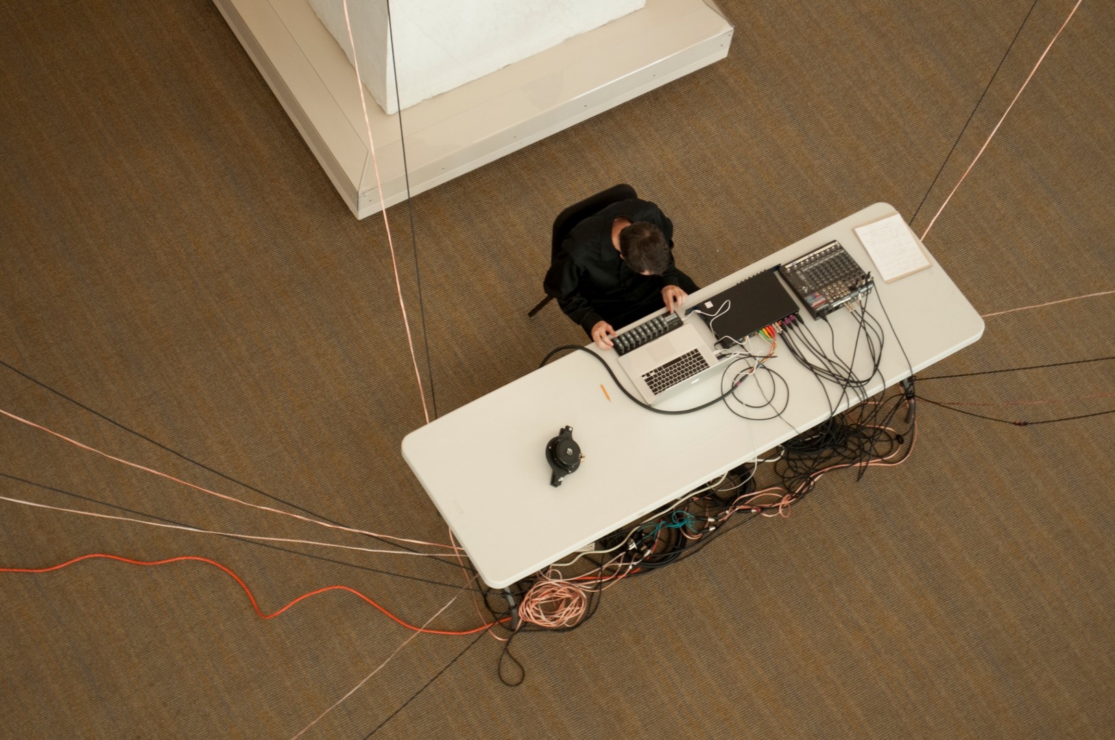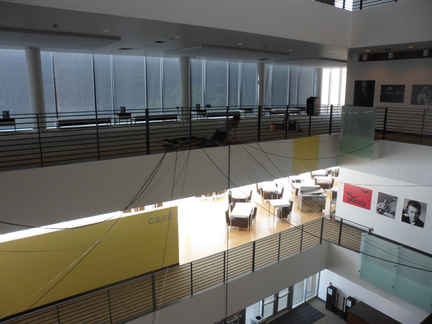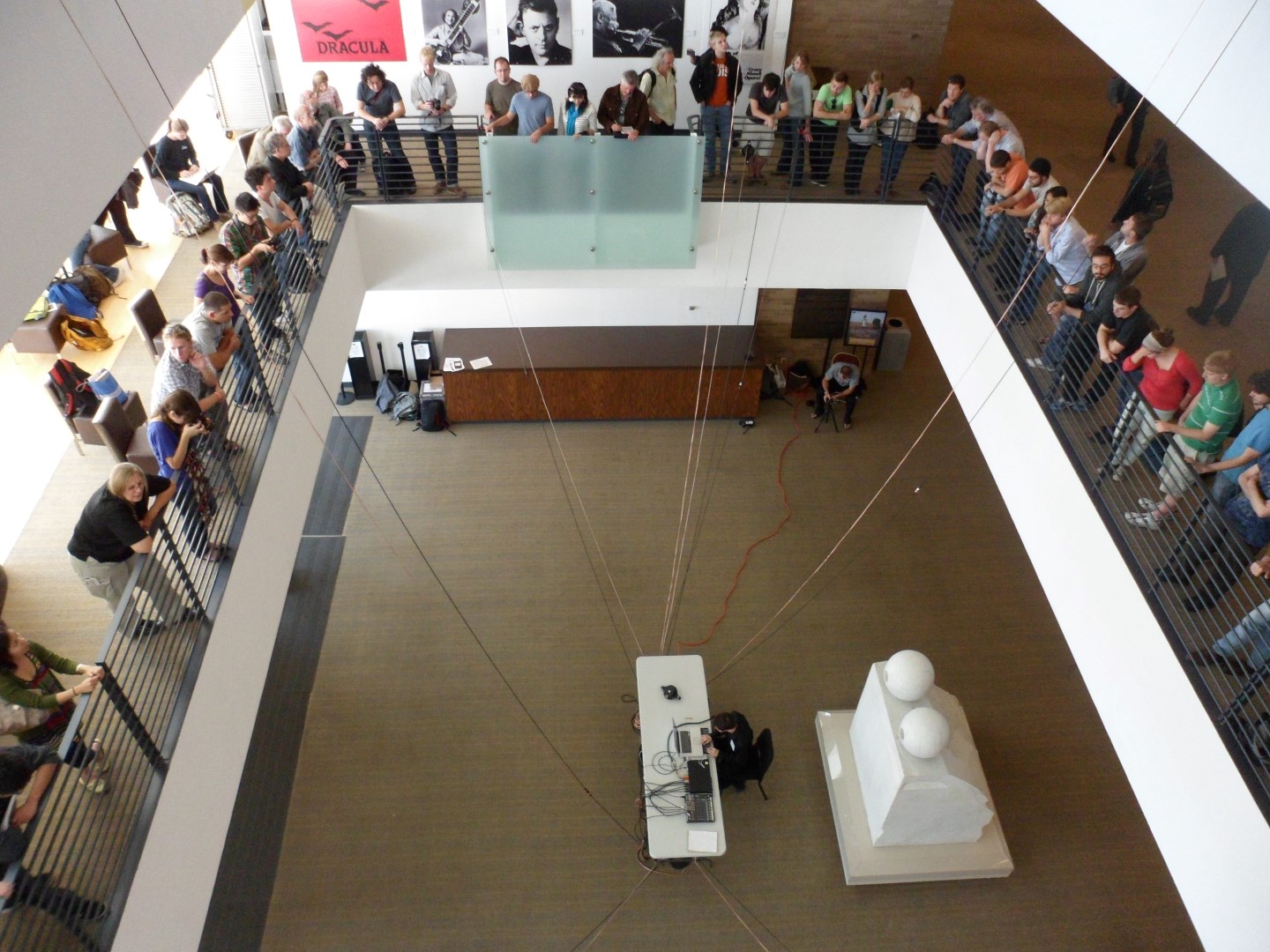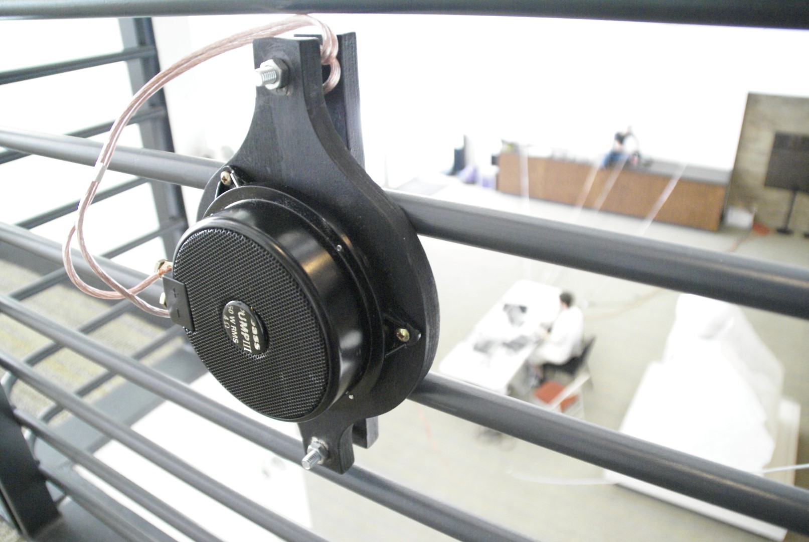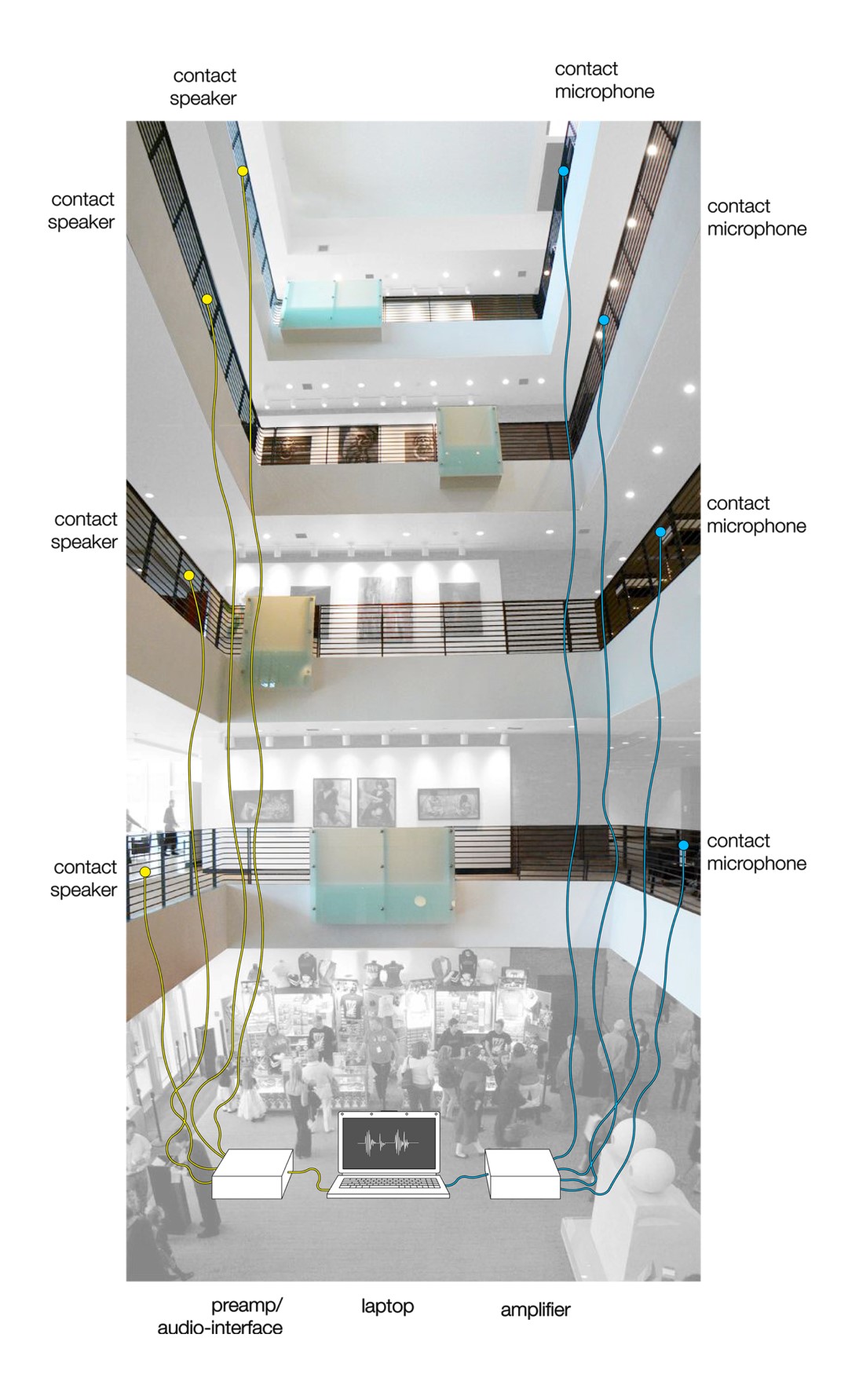 A set of contact-microphones and contact speakers are attached to the handrails at each of the floorsof the Bass Concert Hall Lobby. The contact-mikrophones and contact-speakers are connected to each other in a way that a feed back-loop is created, whereas the handrail works as natural filter.The feedback is modified with a computer. In that way the handrail can be brought to vibrate in its natural resonances.