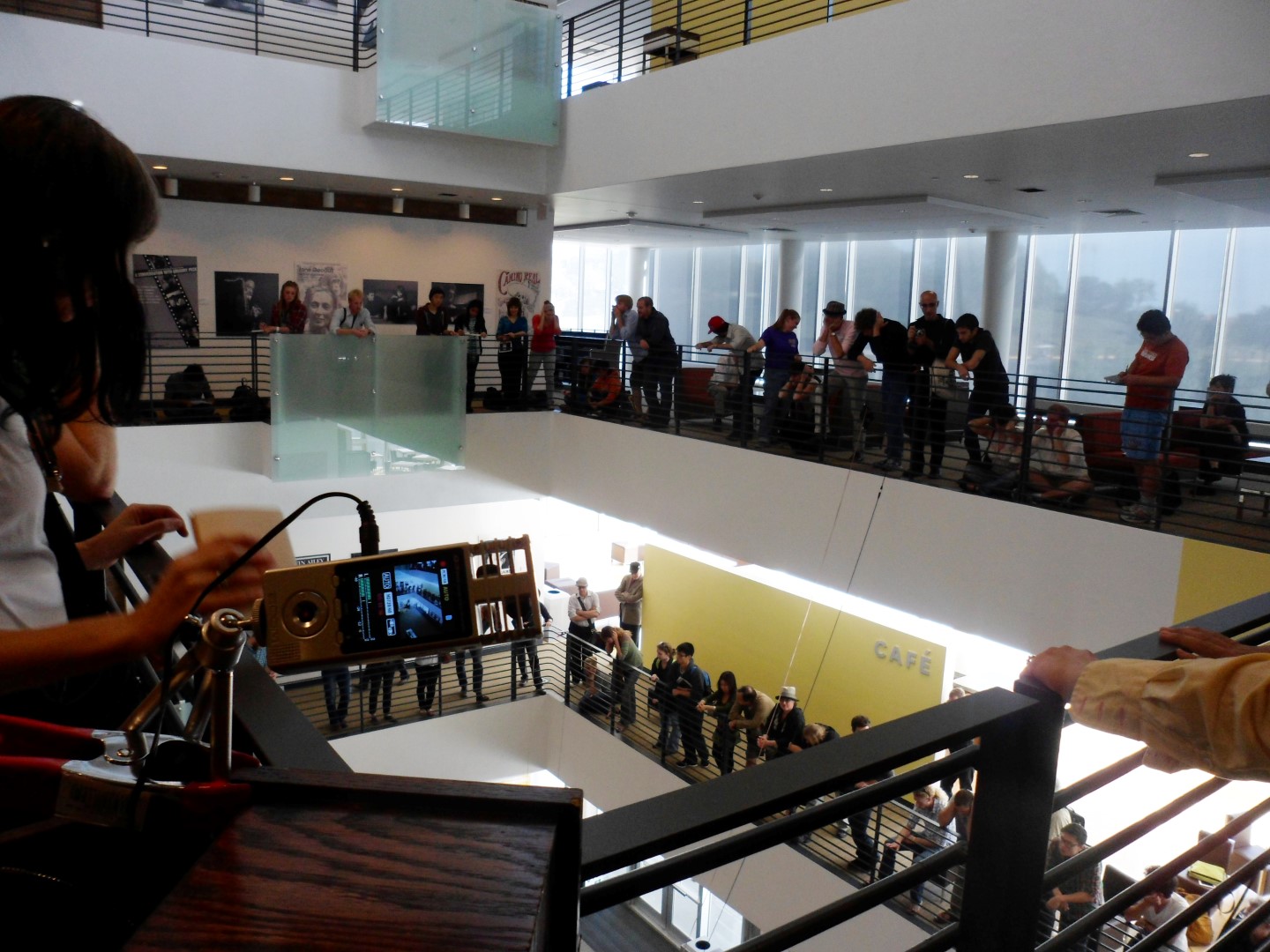 The audience stands on the floors without touching the handrails. The handrail is brought to strong vibration in all its natural frequencies by feedback-loops. The handrail works as sound-source and thesound is naturally audible in the whole space.