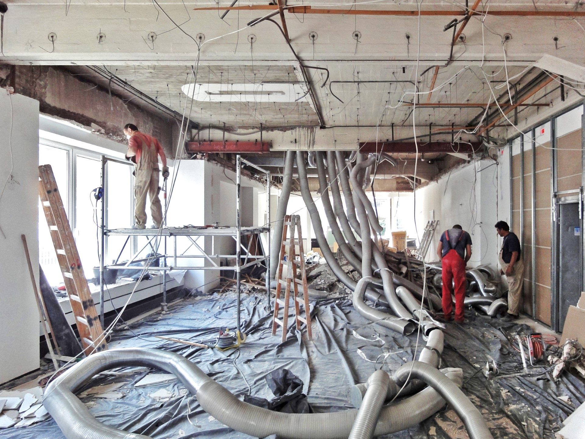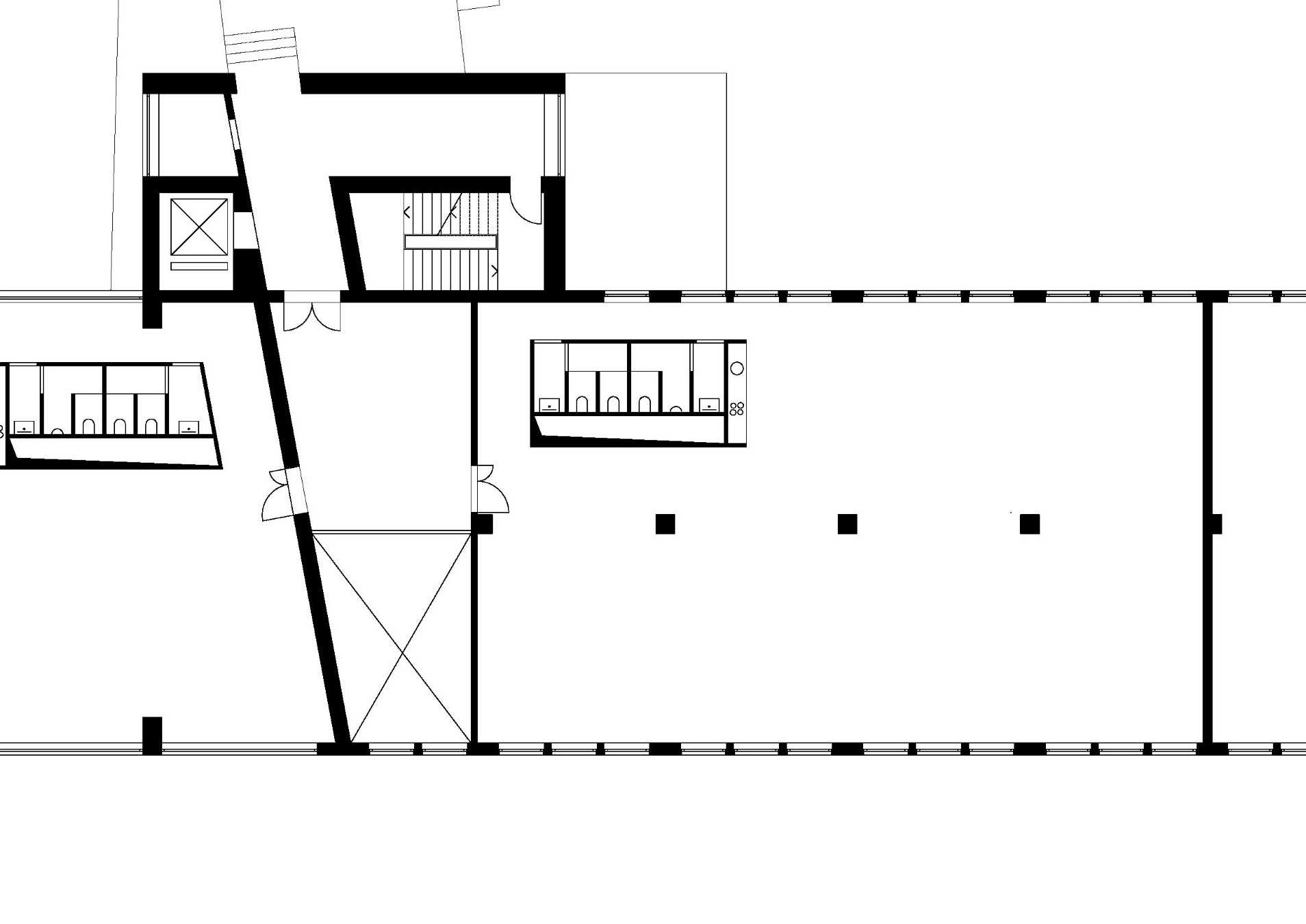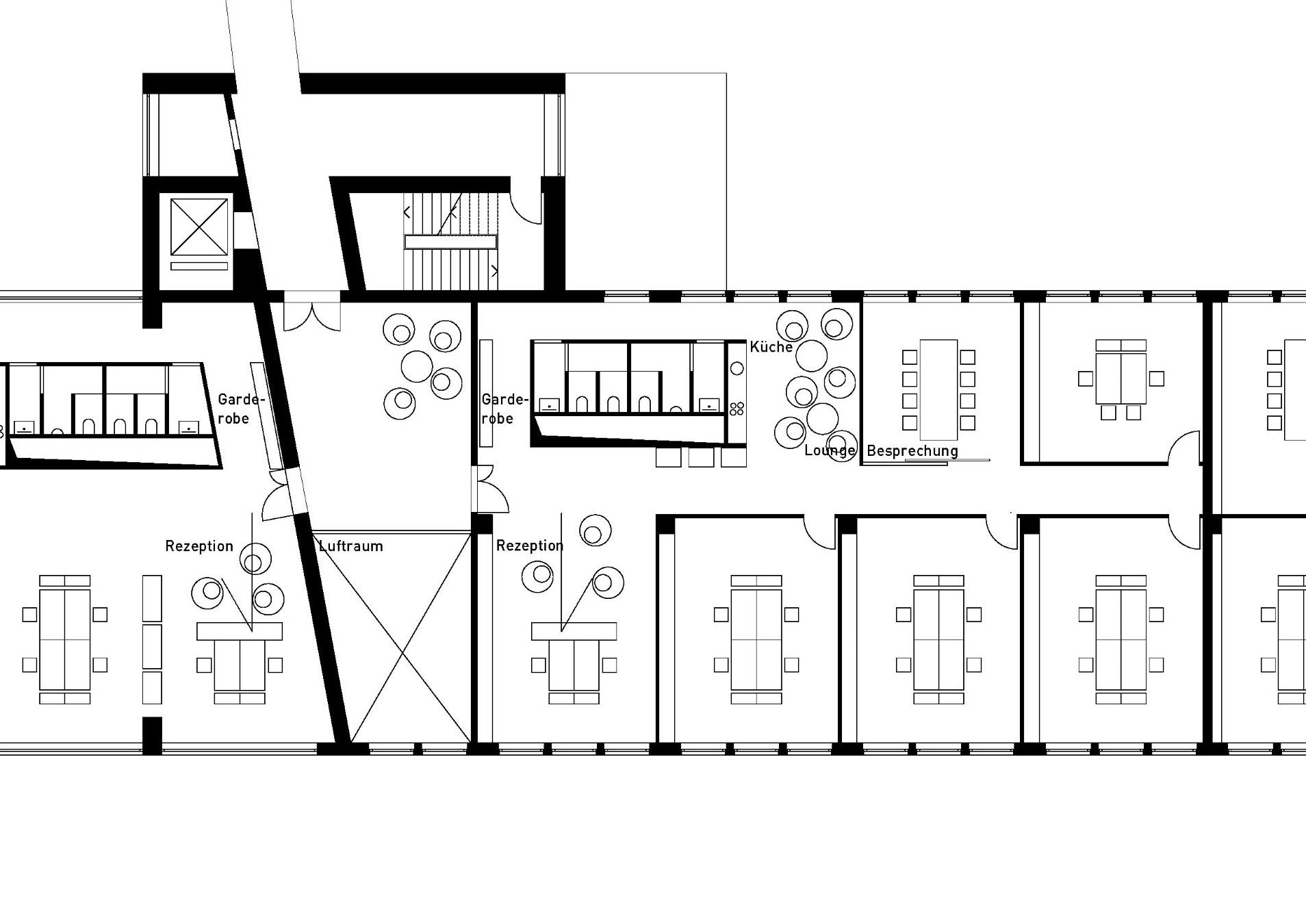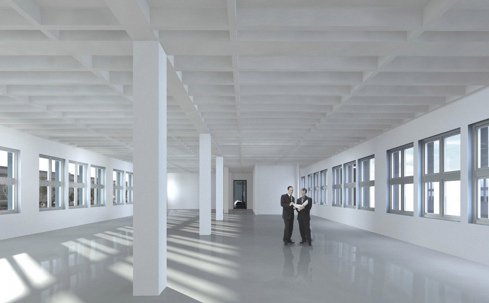 Die besondere Wertigkeit des Gebäudes ergibt sich aus der räumlichen und gestalterischen Qualität der Eingangsbereiche. Sie ermöglichen den Mietern und Kunden ein attraktives Erreichen ihrer Einheit sowohl von der Fürther Straße als auch vom Innenhof. Die Erschließungsbereiche sind mit weiß verputzen Wänden und Steinfußböden einfach gehalten, um den industriellen Charakter des Gebäudekomplexes zu unterstreichen. Sie beinhalten Lufträume, sodass der Raum insgesamt großzügig erscheint.Auch die einzelnen Mieteinheiten sollen ihre besondere Atmosphäre dadurch erhalten, dass die ursprünglichen Elemente, wie z. B. die Rippendecke, erlebbar werden. Dabei kann das Gebäude durchaus seine industrielle Patina zeigen. Im Prinzip wird die Hülle mit einfachen Mitteln in einen werthaltigen Zustand versetzt. Die einzelnen Nutzer haben dann die Möglichkeit, diese Hülle individuell einzurichten. Dies gewährleistet auch eine mögliche Anpassung an zukünftige Nutzungsänderungen. Zusätzlich erhält jede Mieteinheit eine Sanitär-/Installationseinheit, die als freies Element im Eingangsbereich platziert ist.Die vorgeschlagenen Verbesserungen beziehen sich somit im Wesentlichen auf eine Aufwertung der Eingangsbereiche insbesondere zur Fürther Straße. Die Fassade wird weitestgehend erhalten und mit einem Wärmedämmverbundsystem versehen. Die beiden Gebäudeteile A2 und A3 werden nur durch den bestehenden Unterschied in den Fassadenöffnungen differenziert. Um die Fassade des zweigeschossigen Aufbaus stärker von der Fassade des Gebäudeteils A3 abzuheben, werden hier die Fensteröffnungen zu einem Band zusammengezogen. Die bestehende vertikale Gliederung über die Entwässerungselemente entfällt, da durch die vorgeschlagene Flachdachsanierung eine Innenentwässerung möglich wird. Für die Farbgestaltung wird die bereits erneuerte Fassade des Gebäudes A1 invertiert: weiße Putzflächen mit Glassplittern für die Außenflächen und schwarze Putzflächen für die Laibungen. Die Sonnenschutzjalousien werden in die Fassade integriert.