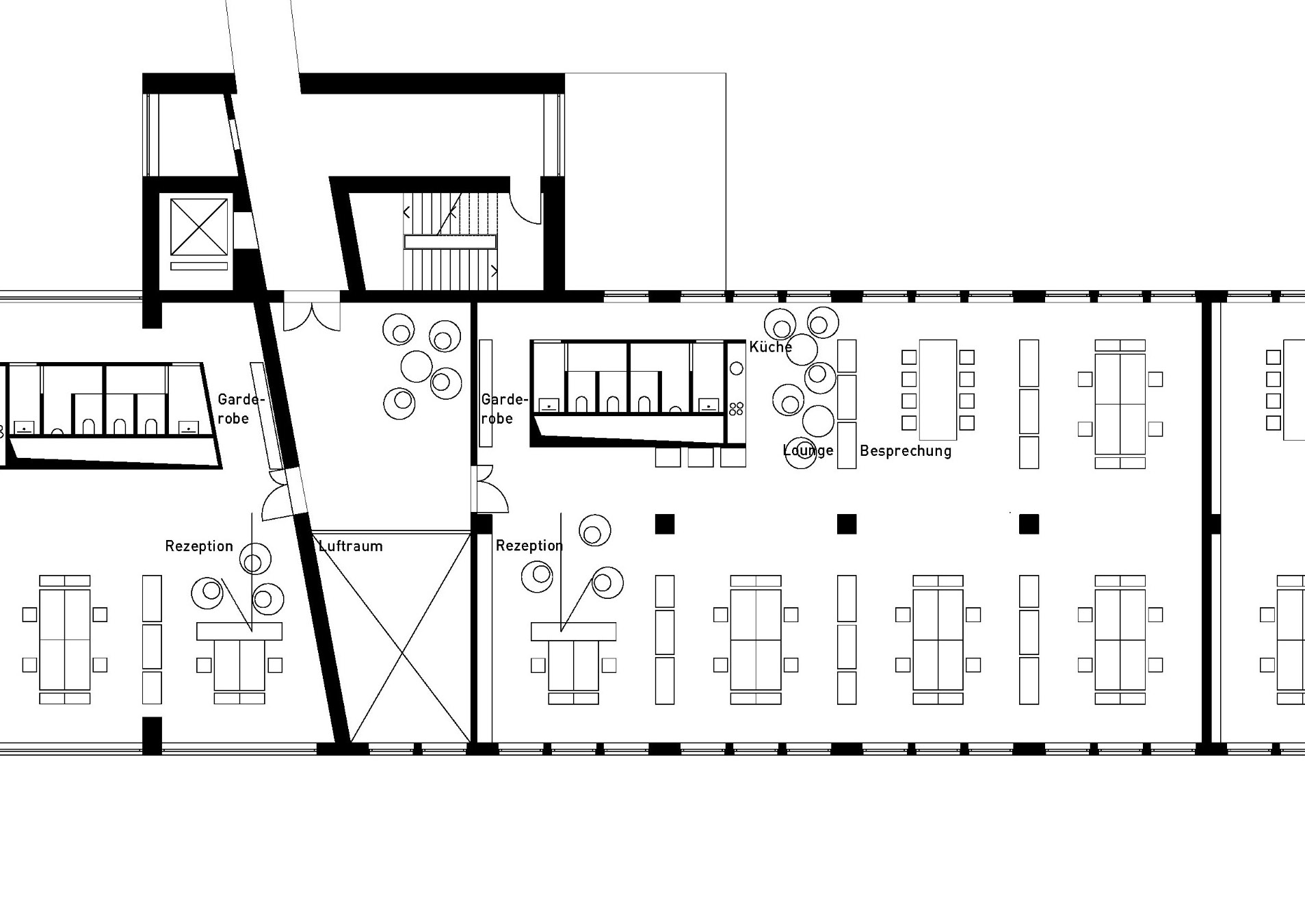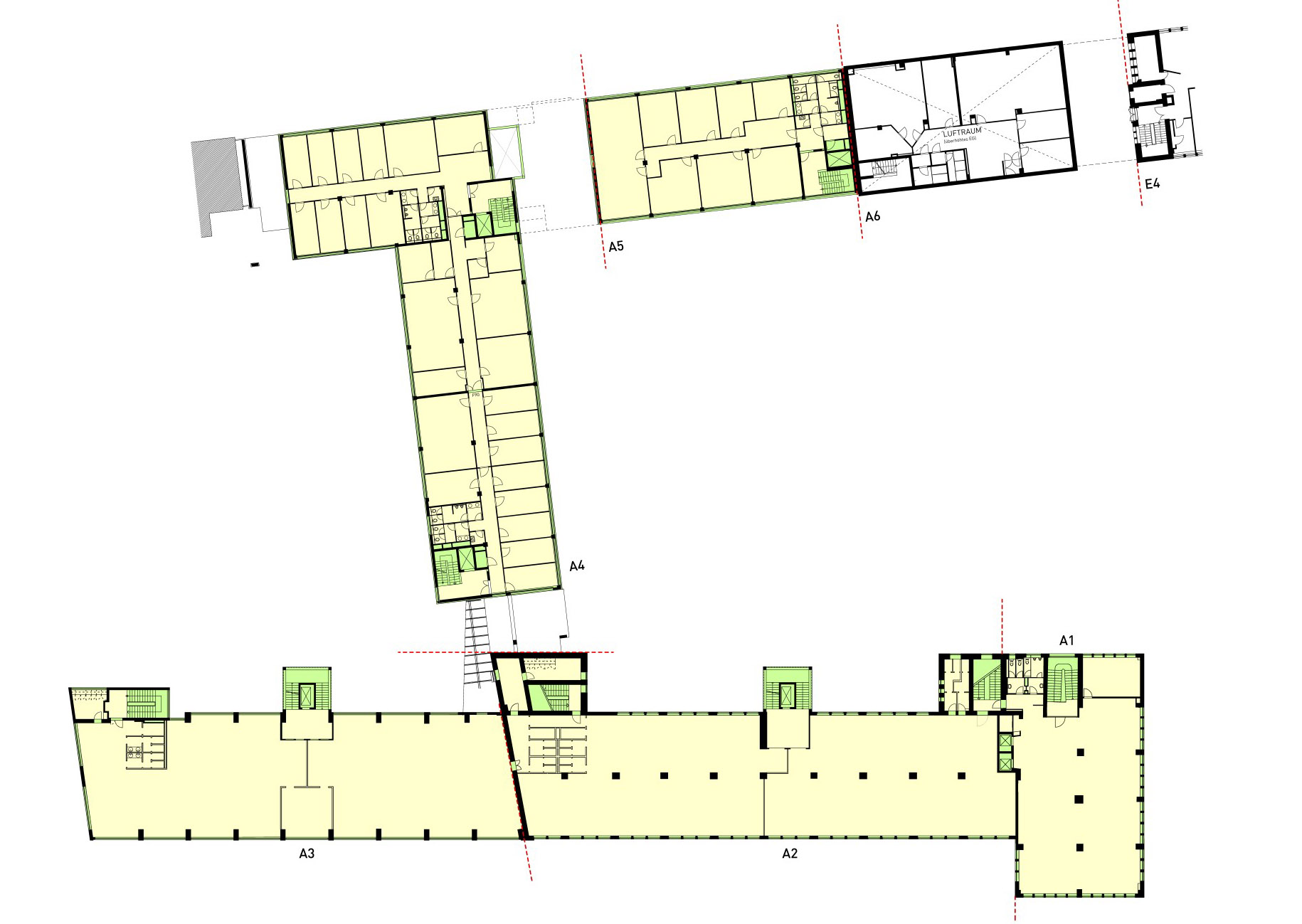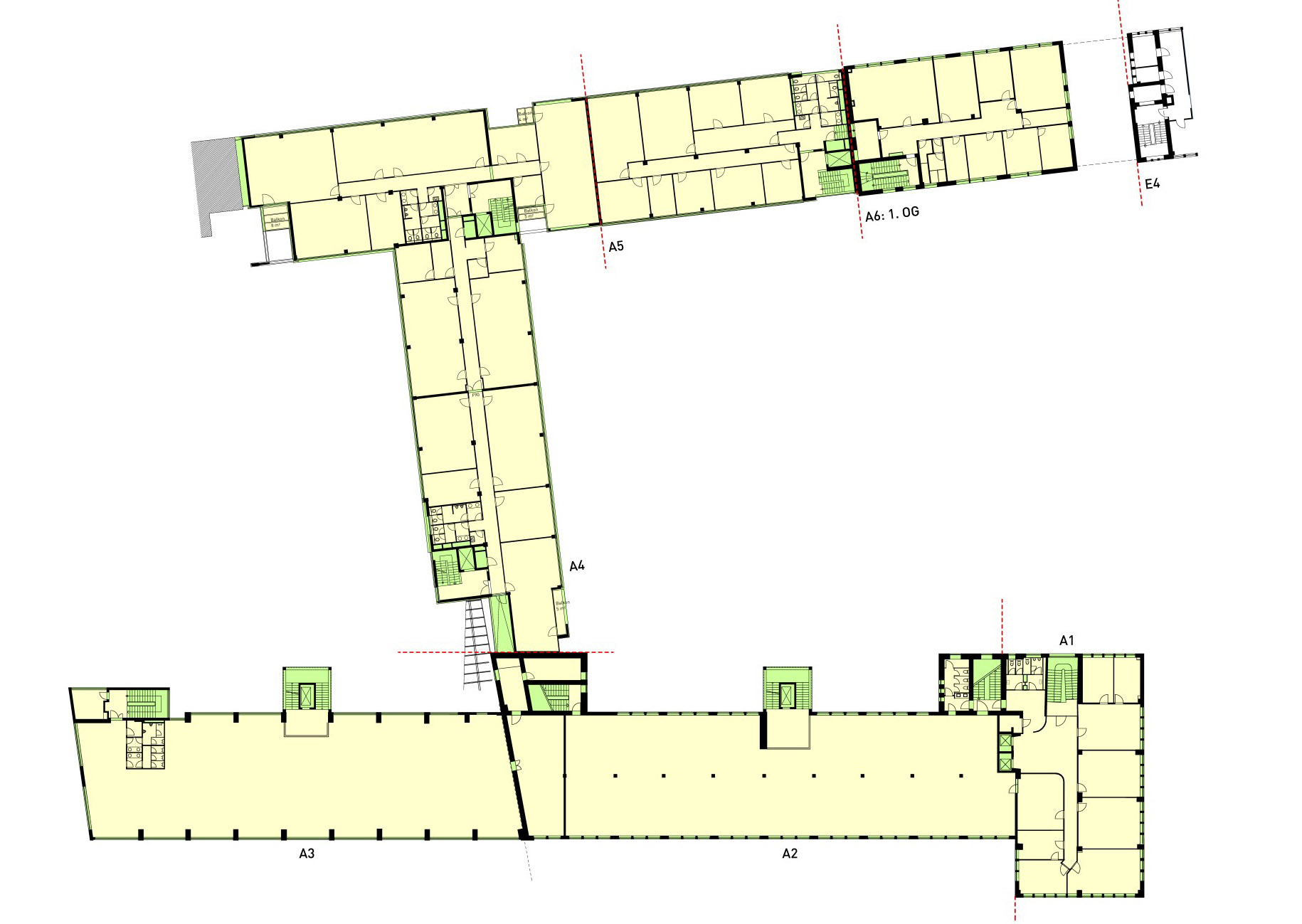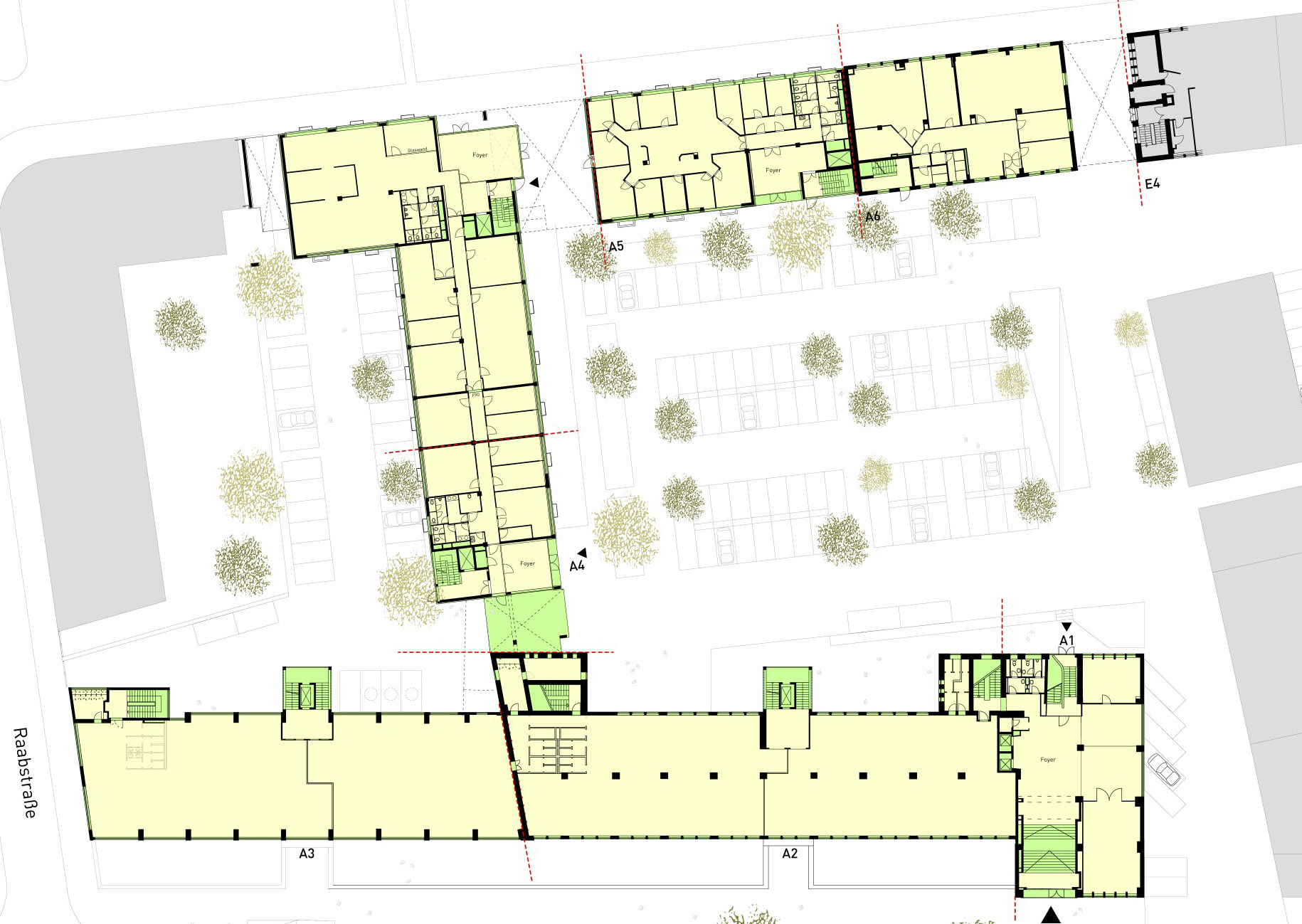 Die flexible Grundrisseinteilung ermöglicht es, die Gebäude A1, A2 und A3 an einen Nutzer (‘Single-Tenant’) zu vermieten. Der zentrale Eingang erfolgt in diesem Fall über den bestehenden Haupteingang im Kopfgebäude (A1) sowohl von der Fürther Straße als auch vom Innenhof. Für Mitarbeiter wird zusätzlich vom Innenhofbereich der Zugang der beiden Erschließungskerne weiter westlich aufgewertet und jeweils mit einem Aufzug nachgerüstet.Kommt es zu einer stärkeren Aufteilung unterschiedlicher Nutzer (‘Multiple-Tenant’), so können diese Erschließungskerne weiter um einen Zugang von der Fürther Straße ergänzt werden. Dieser Zugang erfolgt über eine Rampenanlage, die den Höhenunterschied zwischen dem Straßenniveau außerhalb des Gebäudes barrierefrei überwinden lässt. Die Rampenanlage verleiht der Erdgeschossebene des Gebäudes eine besondere Signifikanz, die von den Passanten am stärksten wahrgenommen wird. Darüber hinaus gelingt es, wertvolle Mietfläche innerhalb des Gebäudes zu erhalten.