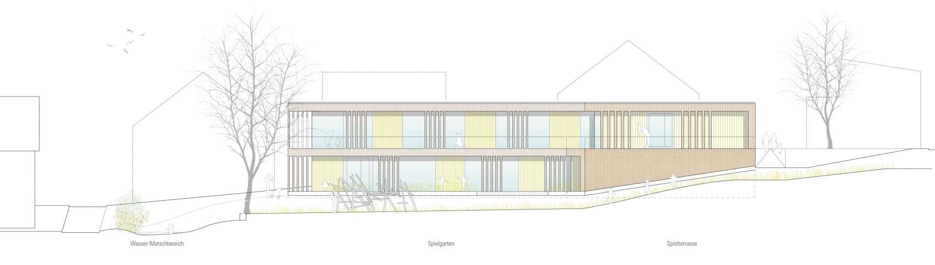- Realisierungswettbewerb 2019 - 1. Preis, zusammen mit raum 3 Architekten, 4-gruppige Kindertagesstätte