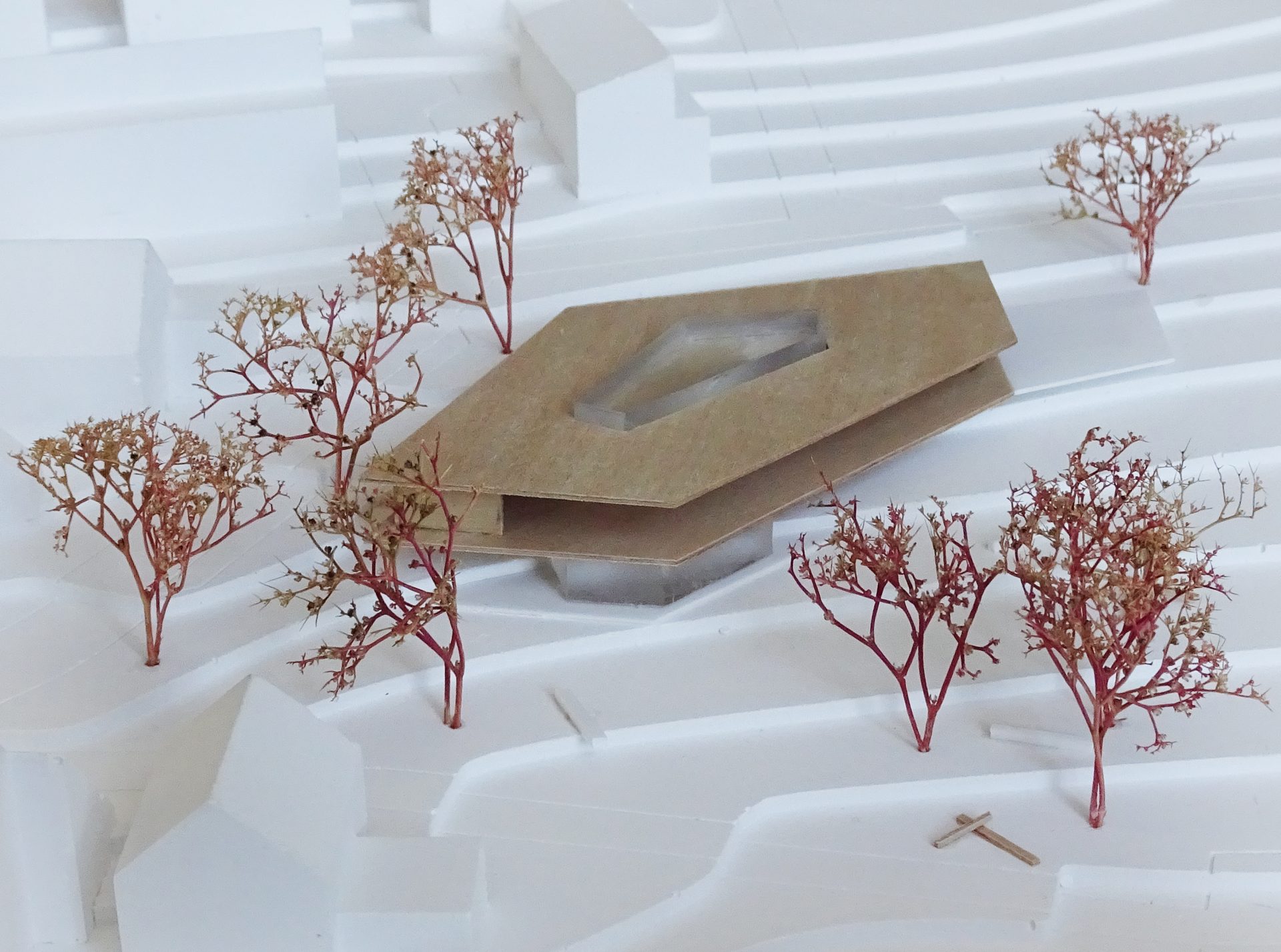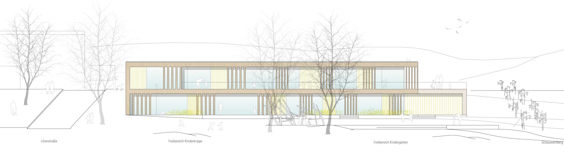 Die neue, zweigeschossige Kita ergänzt als Schlussstein das Wohnquartier an der Lilienstraße. Die kristallin geschliffenen Kanten des Baukörpers nehmen die Höhenlinien des Hanggrundstückes auf und führen diese wie selbstverständlich weiter. Das vorgegebene Baufeld