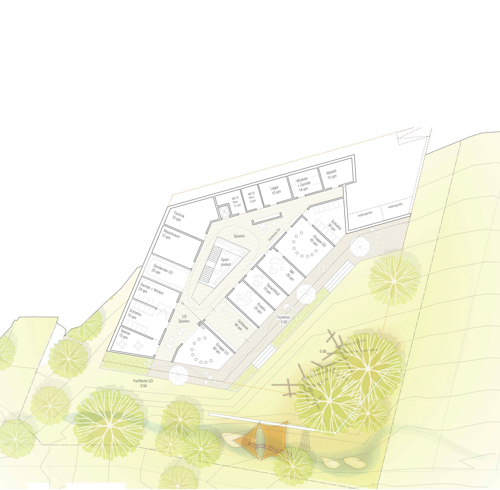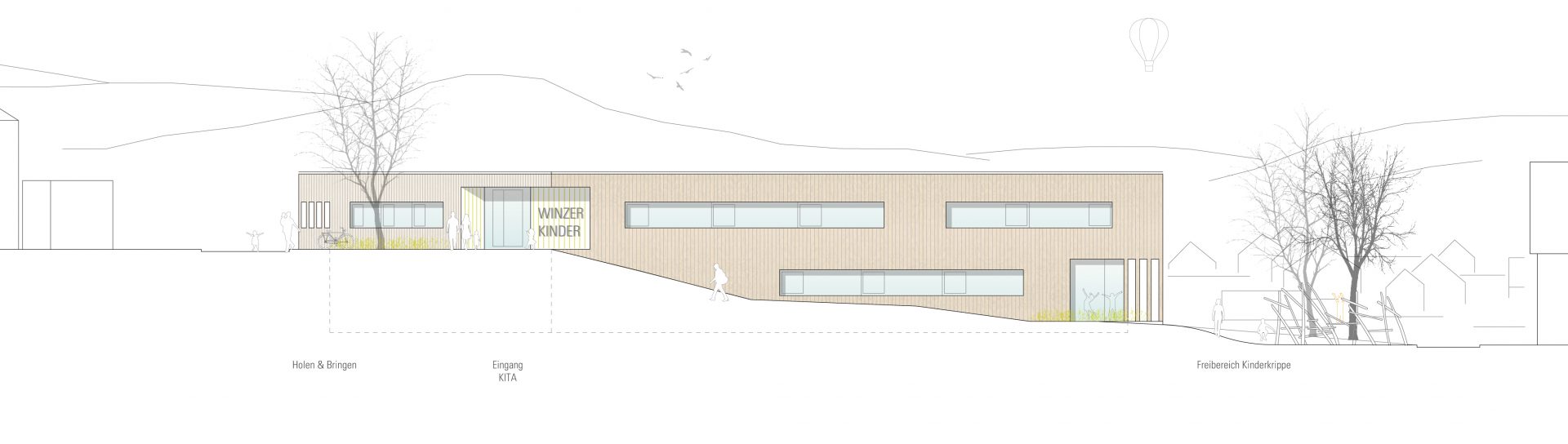 Die Kita ist als kompakter Baukörper um ein glasgedecktes, lichtdurchflutetes Atrium angelegt. Im Erdgeschoss befinden sich sämtliche Verwaltungs- und Serviceräume inkl. Küche. Mehrzweckraum und großer Speiseraum können für Veranstaltungen zum Foyer geöffnet und zusammen bespielt werden. Zwei modular aufgebaute Gruppeneinheiten für Ü3-Kinder sind als Aktivzonen zum Garten hin orientiert. Vorgelagerte Terrassen bieten für die Gruppen einen geschützten Aufenthalt im Freien. Die Schlafräume und Sanitärbereiche sind akustisch entkoppelt als Ruhezonen in der Westspange untergebracht. Eine raumhaltige Treppe führt im zentralen Atrium ins untere Gartengeschoss. Hier befinden sich eine weitere Ü3-Gruppe und eine Einheit für unter dreijährige Kinder. Die U3-Einheit kann separat betrieben werden, mit eigenem angeschlossenem Spielgarten. Garderoben für die Ü3-Gruppen befinden sich als Einbauten direkt in den Flurbereichen, die U3-Gruppe erhält zusätzlich einen Garderobenraum. Generell gelangt man über eine Schmutzschleuse mit Stiefelanlage in den Freibereich der “Winzerkinder”. Die Nebenräume und Haustechnikanlagen sind im unterkellerten Bereich dieses Geschosses angelegt. Das Gebäude ist über einen Aufzug barrierefrei erschlossen.