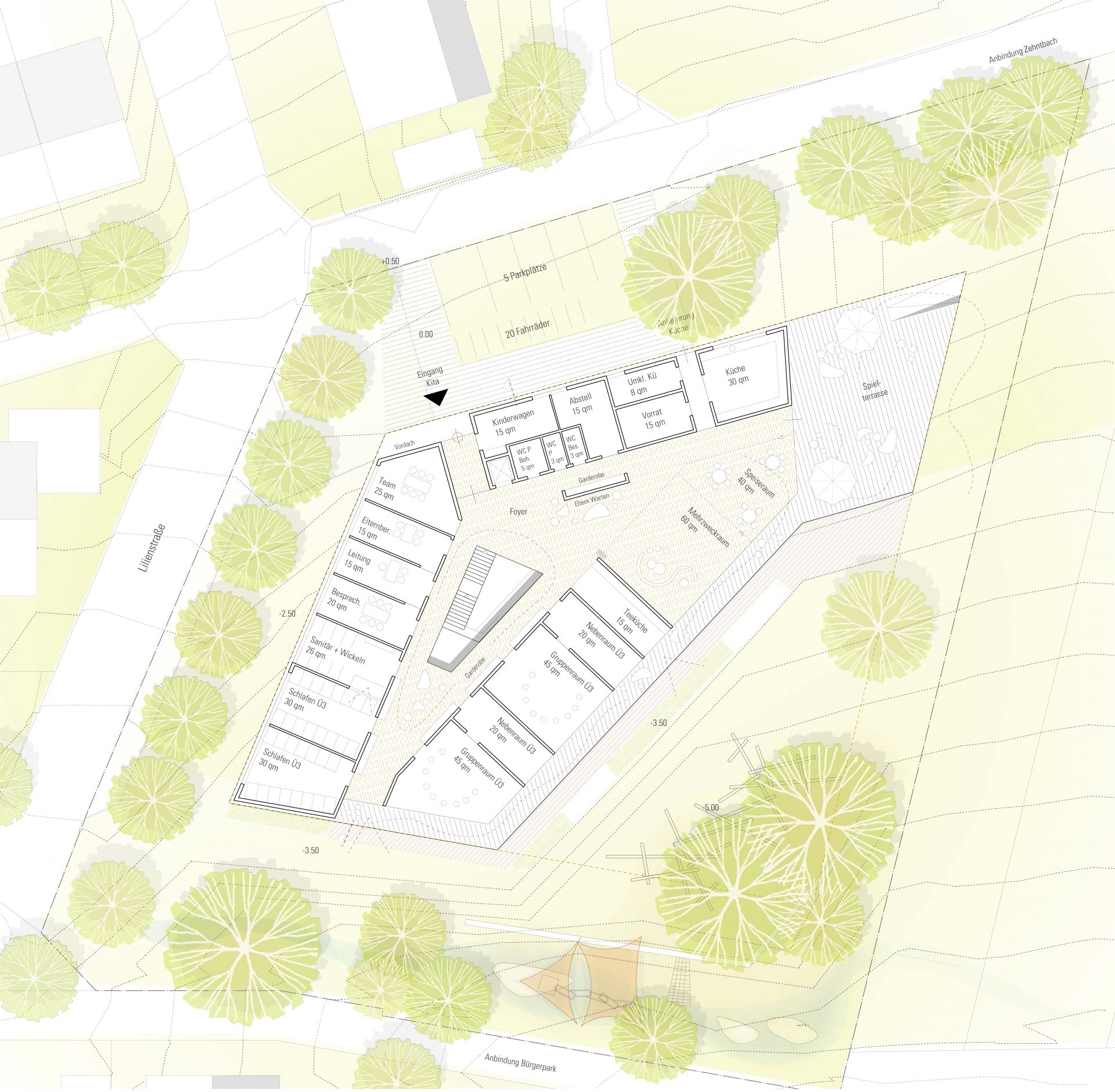 wird eingehalten und an den Nord- und Westrändern besetzt. Im Osten besteht die Möglichkeit einer späteren Erweiterung als 2. Bauabschnitt. Der großzügige Spielgarten ist nach Osten und Südosten ausgerichtet. Er nimmt Bezug zu den Weinbergen, dem angrenzenden Schauweinberg, dem neu entstehenden Bürgerpark und Zehntbach auf.