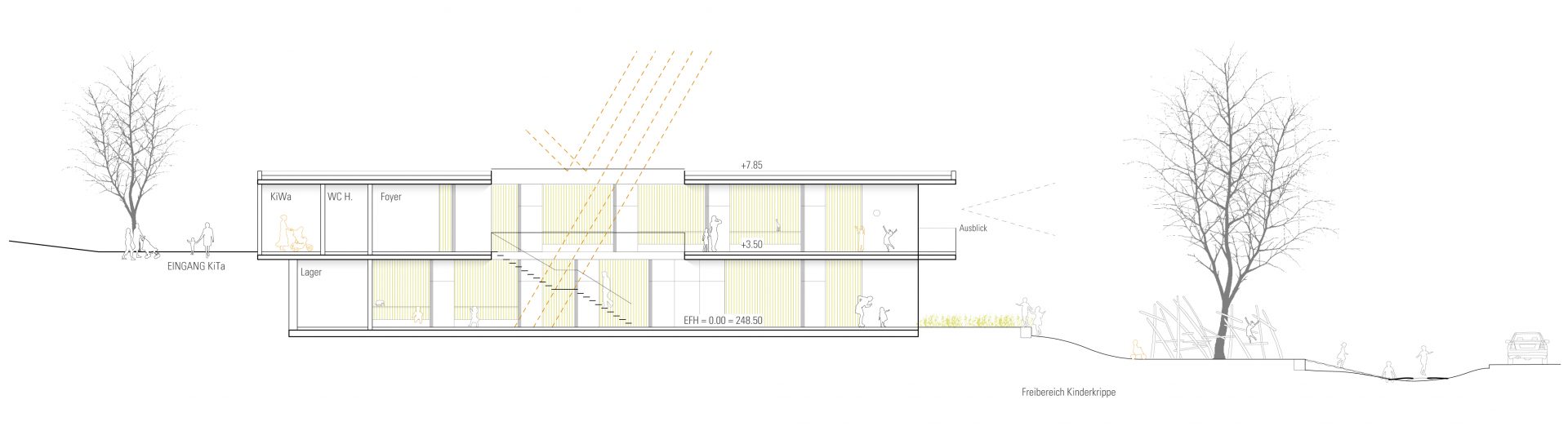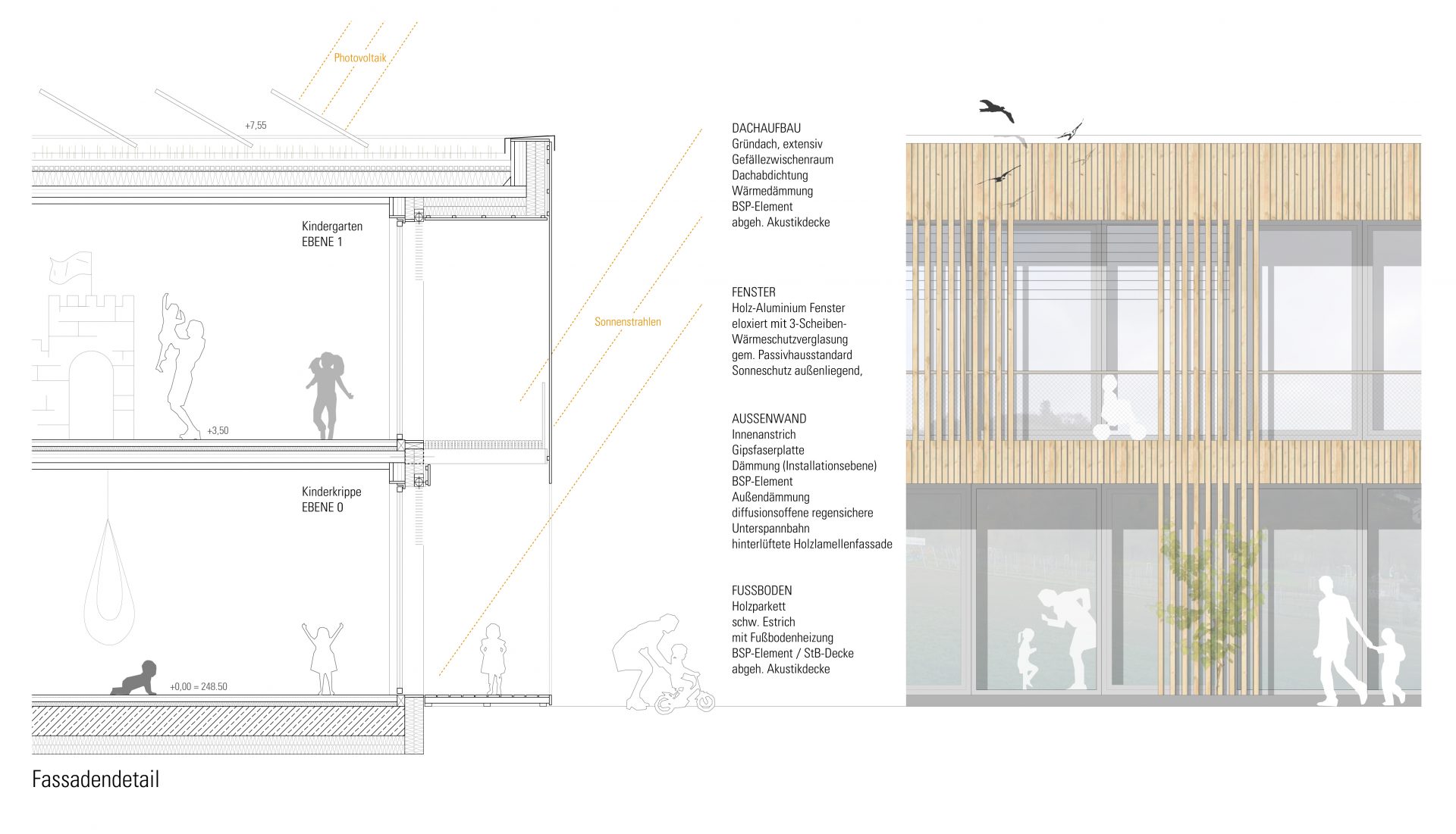 Das Erscheinungsbild der KITA ist geprägt durch eine schlichte und klare Formensprache. Das Gebäude wird in massiver Brettsperrholzbauweise errichtet. Bodenplatte und Hangabfangung erfolgt in Stahlbeton. Durch wirtschaftliche Spannweiten der Decken werden die Baukosten optimiert. Die nichttragenden Innenwände und die Außenwände werden in Leichtbauweise bzw. vorgefertigter Holzleichtbauweise ausgeführt. Serielle Ausbauelemente sorgen für eine ökonomische Umsetzung. Ein niedriger Energiebedarf des Gebäudes ist Ziel der Planung. Die
