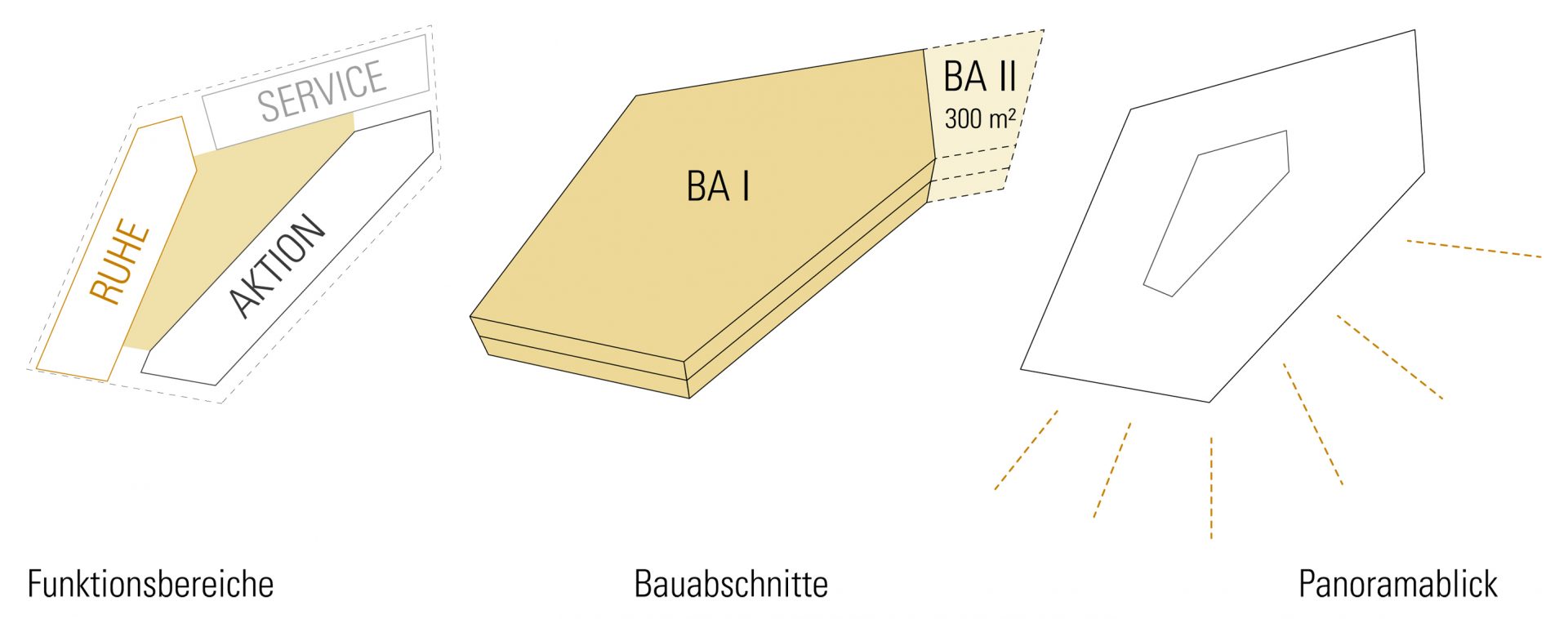Außenhülle wird thermisch optimiert bzw. hochwärmegedämmt. Der Einfachheit und Klarheit folgt auch die Wahl der Materialien. Das Gebäude wird mit einer vertikalen Schalung aus vorpatiniertem Lärchenholz bekleidet. Sie verleiht der Fassade Plastizität und nimmt Bezug zum umliegenden Naturraum auf. Einige der Vertikalelemente dienen gleichzeitig als Weinranke und Sichtschutz. Die Fenster werden geschosshoch ausgeführt. Im Sommer schützt der hohe Dachüberstand und bewegliche Raffstores vor Überhitzung, im Winter erhält man durch die tief stehende Sonne gute Wärmeeinträge. Für die Haustechnik wird eine Low-Tech-Lösung angestrebt. Optional können die begrünten Flachdächer mit Solaranlagen bestückt werden.