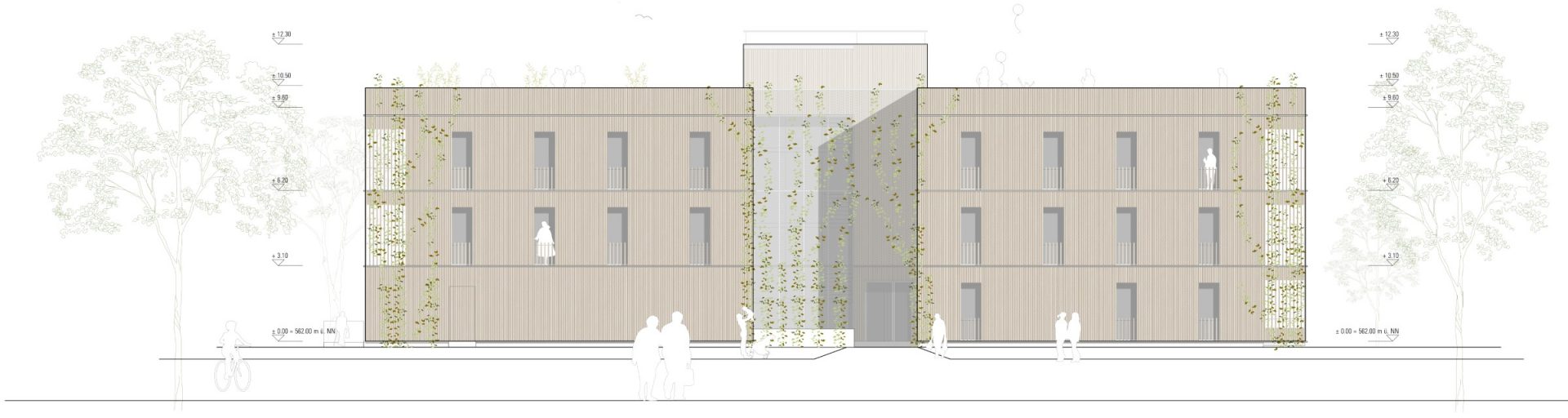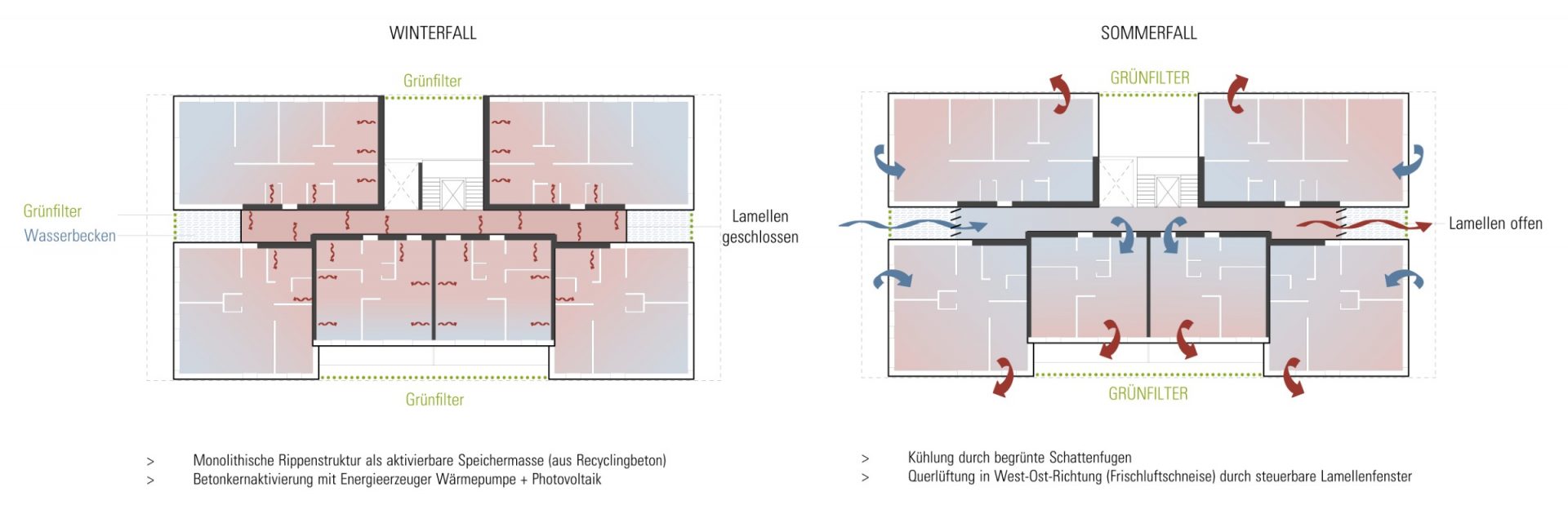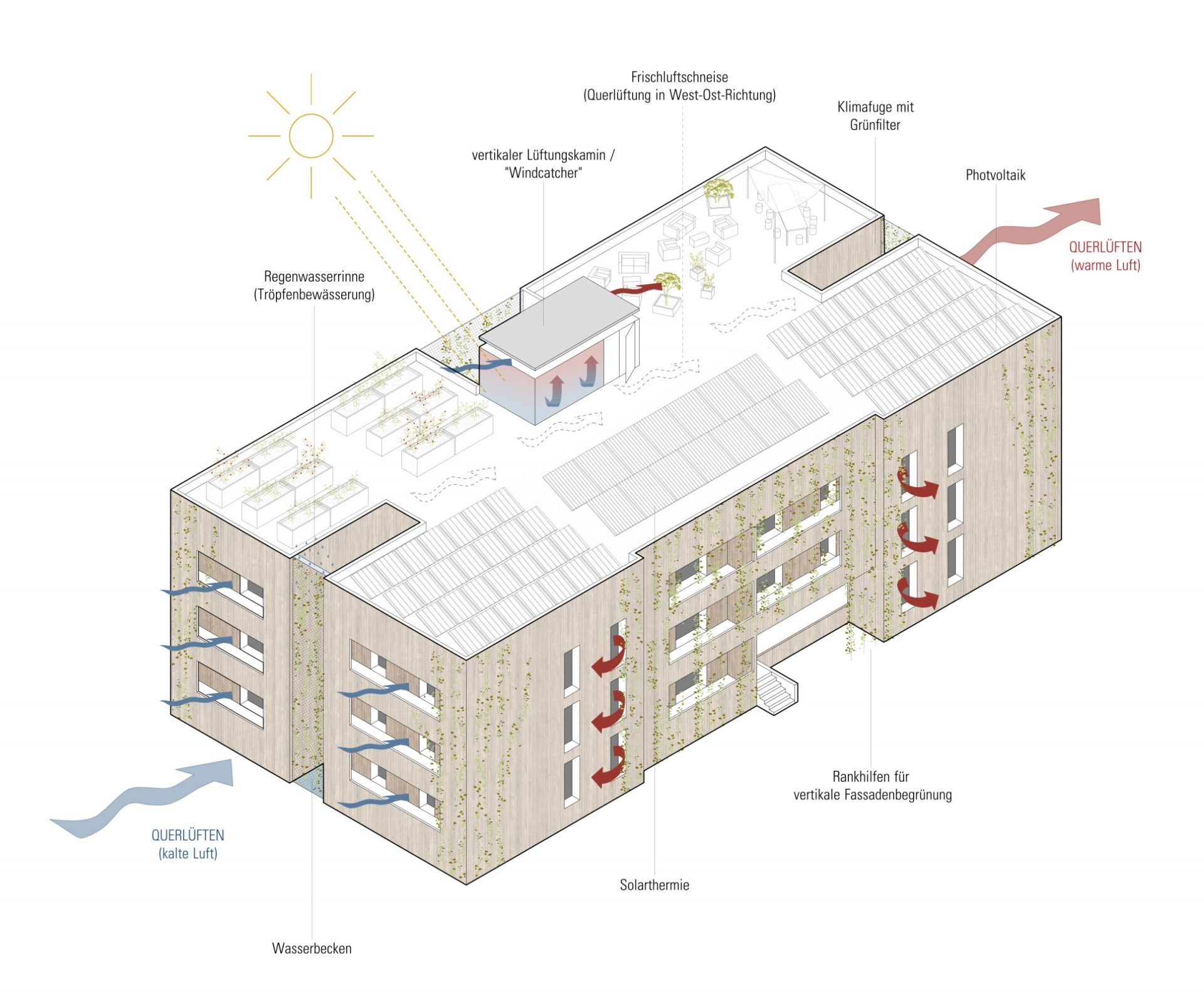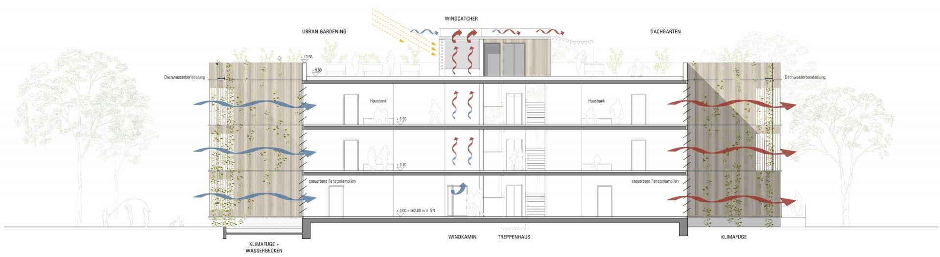gesetzte Fugen und Öffnungen im Sinne einer natürlichen Aeration, und die Wahl geeigneter Materialien bilden die Grundlage des klimaangepassten Konzeptes. Dabei wurde auch auf historische Prinzipien des ländlichen Bauens der Region zurückgegriffen. Die Typologie des Vierseithofes und die Prinzipien des Wohnstallhauses bilden wunderbare Ausgangspunkte für die Entwicklung eines neu aufgelegten klimaangepassten Baustils. Durch die monolithische Rippenstruktur aus Ortbeton im Inneren des Baukörpers entsteht eine aktivierbare Speichermasse. Gleichzeitig werden die Flächen zur Betonkernaktivierung (thermische Bauteilaktivierung) herangezogen. Als Energieerzeuger sollte eine Kombination aus Wärmepumpe und Photovoltaik zum Einsatz kommen. Die massiven „Kühlrippen“ aus Beton werden zusätzlich über die „begrünten Schattenfugen“ am Baukörper im Sommer heruntergekühlt. Zu diesem Effekt gesellt sich die Querdurchlüftbarkeit der inneren Flurfläche in West-Ost-Richtung, steuerbar durch flexible Lamellenfenster in den Flurenden. Dadurch kann die kühlende Wirkung der Frischluftschneise am ehemaligen Bahngelände und die Winddynamik der Westwindzone zur Gebäudeklimatisierung genutzt werden. In stürmischen Jahreszeiten oder bei Unwettergefahr kann die Luftbewegung im Gebäudeinneren durch das Schließen der Lamellenfenster auch komplett unterbleiben. Der natürliche, horizontale Kühleffekt wird durch einen zentral gesetzten „Windkamin“ bzw. „Windcatcher“ am Treppenhaus ergänzt. Durch Aufheizung des Windcatchers im Bereich über dem Dach entsteht eine vertikale Luftströmung im Gebäudeinneren, durch die kühlere Luft in den Innenbereich nachgezogen wird. Gleichzeitig dient der Kamin als Rauchabzug im Brandfall. Die Fassadenelemente aus Massivholz bilden die hybride vorfabrizierbare Ergänzung zu dem massiven Grundsystem. Fassadenbegrünung und Bepflanzungen in und um das Gebäude herum erhöhen den Kühleffekt und das psychische Wohlbefinden der Bewohner. Auch die Flachdächer werden als Gründächer geplant und gärtnerisch von den Bewohnern genutzt. Die südorientierten Bereiche können zusätzlich mit Solaranlagen bestückt werden. Das Dachwasser wird gedrosselt in die Klimafugen des Gebäudes abgeführt. An den begrünten Screens der Fugen kann es abtröpfeln und verdunsten und als gekühlte Luft ins Gebäudeinnere transportiert werden. Ein kleines Sammelbecken in