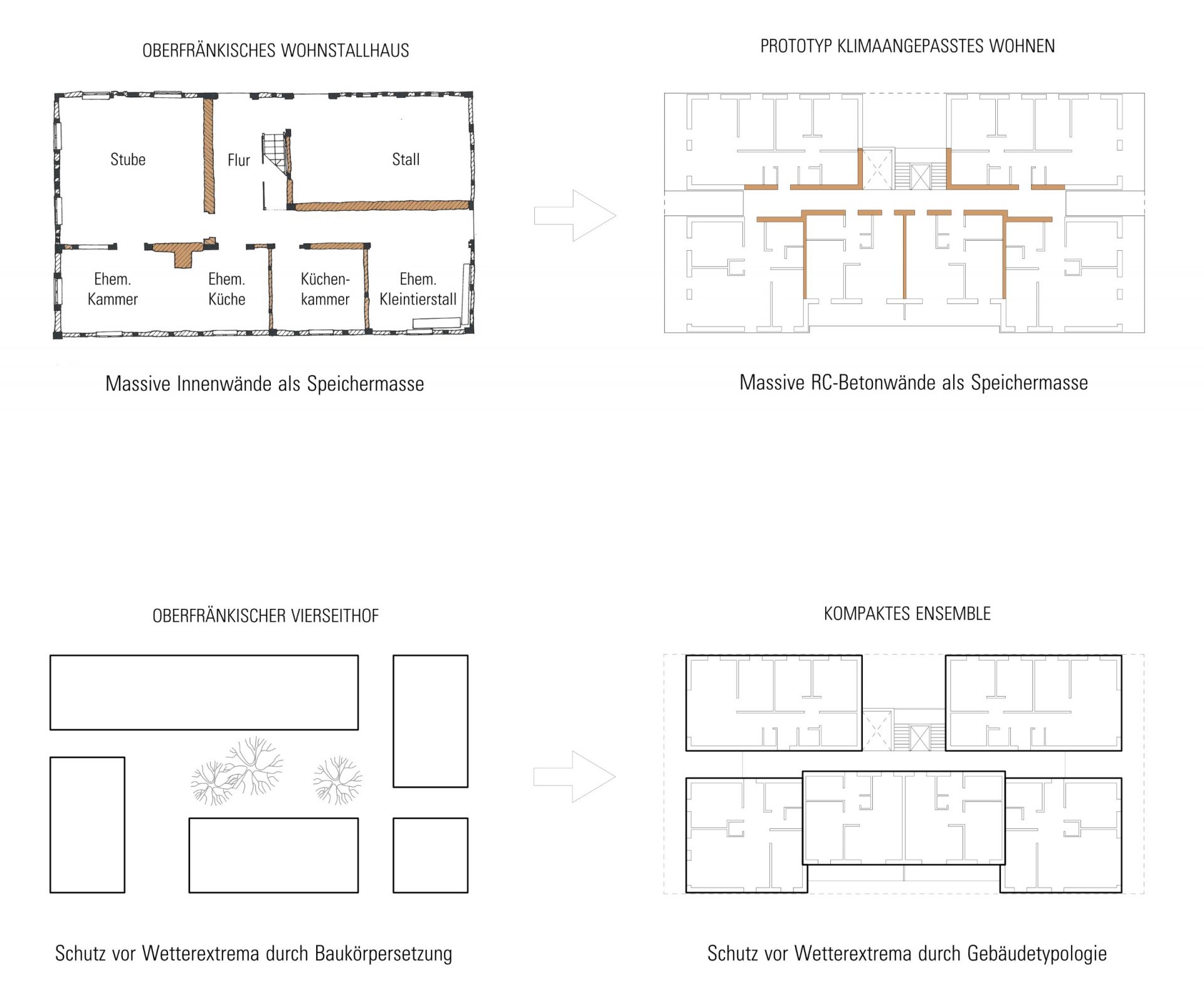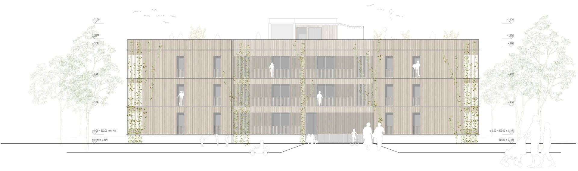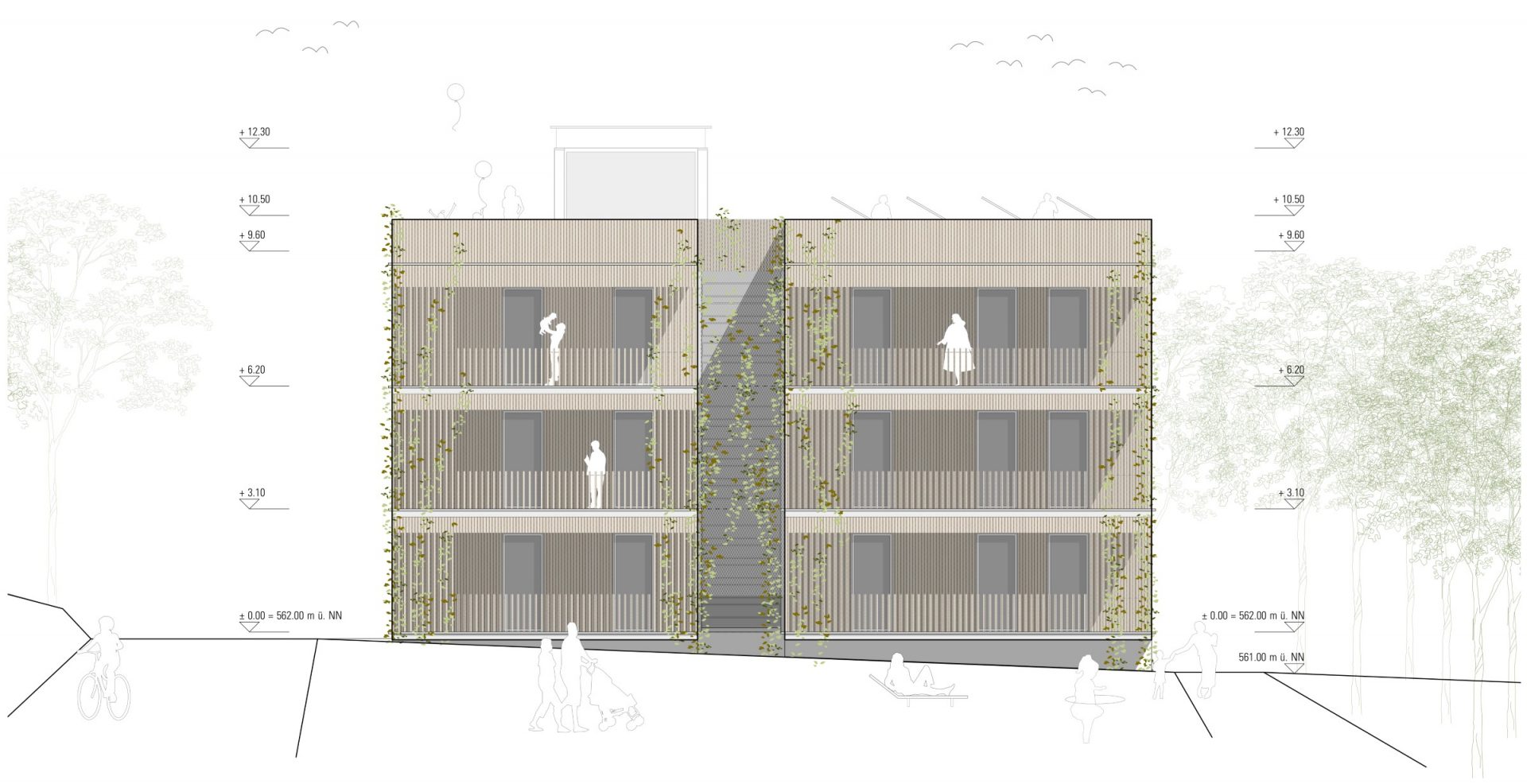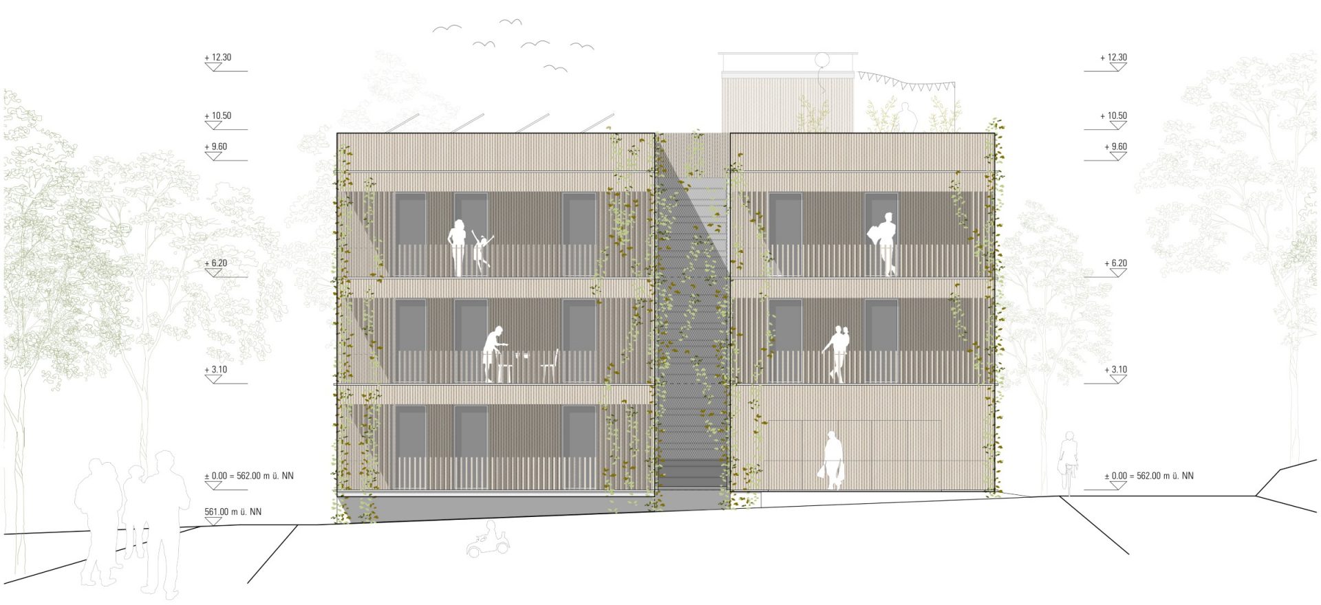 gesetzte Fugen und Öffnungen im Sinne einer natürlichen Aeration, und die Wahl geeigneter Materialien bilden die Grundlage des klimaangepassten Konzeptes. Dabei wurde auch auf historische Prinzipien des ländlichen Bauens der Region zurückgegriffen. Die Typologie des Vierseithofes und die Prinzipien des Wohnstallhauses bilden wunderbare Ausgangspunkte für die Entwicklung eines neu aufgelegten klimaangepassten Baustils. Durch die monolithische Rippenstruktur aus Ortbeton im Inneren des Baukörpers entsteht eine aktivierbare Speichermasse. Gleichzeitig werden die Flächen zur Betonkernaktivierung (thermische Bauteilaktivierung) herangezogen. Als Energieerzeuger sollte eine Kombination aus Wärmepumpe und Photovoltaik zum Einsatz kommen. Die massiven „Kühlrippen“ aus Beton werden zusätzlich über die „begrünten Schattenfugen“ am Baukörper im Sommer heruntergekühlt. Zu diesem Effekt gesellt sich die Querdurchlüftbarkeit der inneren Flurfläche in West-Ost-Richtung, steuerbar durch flexible Lamellenfenster in den Flurenden. Dadurch kann die kühlende Wirkung der Frischluftschneise am ehemaligen Bahngelände und die Winddynamik der Westwindzone zur Gebäudeklimatisierung genutzt werden. In stürmischen Jahreszeiten oder bei Unwettergefahr kann die Luftbewegung im Gebäudeinneren durch das Schließen der Lamellenfenster auch komplett unterbleiben. Der natürliche, horizontale Kühleffekt wird durch einen zentral gesetzten „Windkamin“ bzw. „Windcatcher“ am Treppenhaus ergänzt. Durch Aufheizung des Windcatchers im Bereich über dem Dach entsteht eine vertikale Luftströmung im Gebäudeinneren, durch die kühlere Luft in den Innenbereich nachgezogen wird. Gleichzeitig dient der Kamin als Rauchabzug im Brandfall. Die Fassadenelemente aus Massivholz bilden die hybride vorfabrizierbare Ergänzung zu dem massiven Grundsystem. Fassadenbegrünung und Bepflanzungen in und um das Gebäude herum erhöhen den Kühleffekt und das psychische Wohlbefinden der Bewohner. Auch die Flachdächer werden als Gründächer geplant und gärtnerisch von den Bewohnern genutzt. Die südorientierten Bereiche können zusätzlich mit Solaranlagen bestückt werden. Das Dachwasser wird gedrosselt in die Klimafugen des Gebäudes abgeführt. An den begrünten Screens der Fugen kann es abtröpfeln und verdunsten und als gekühlte Luft ins Gebäudeinnere transportiert werden. Ein kleines Sammelbecken in