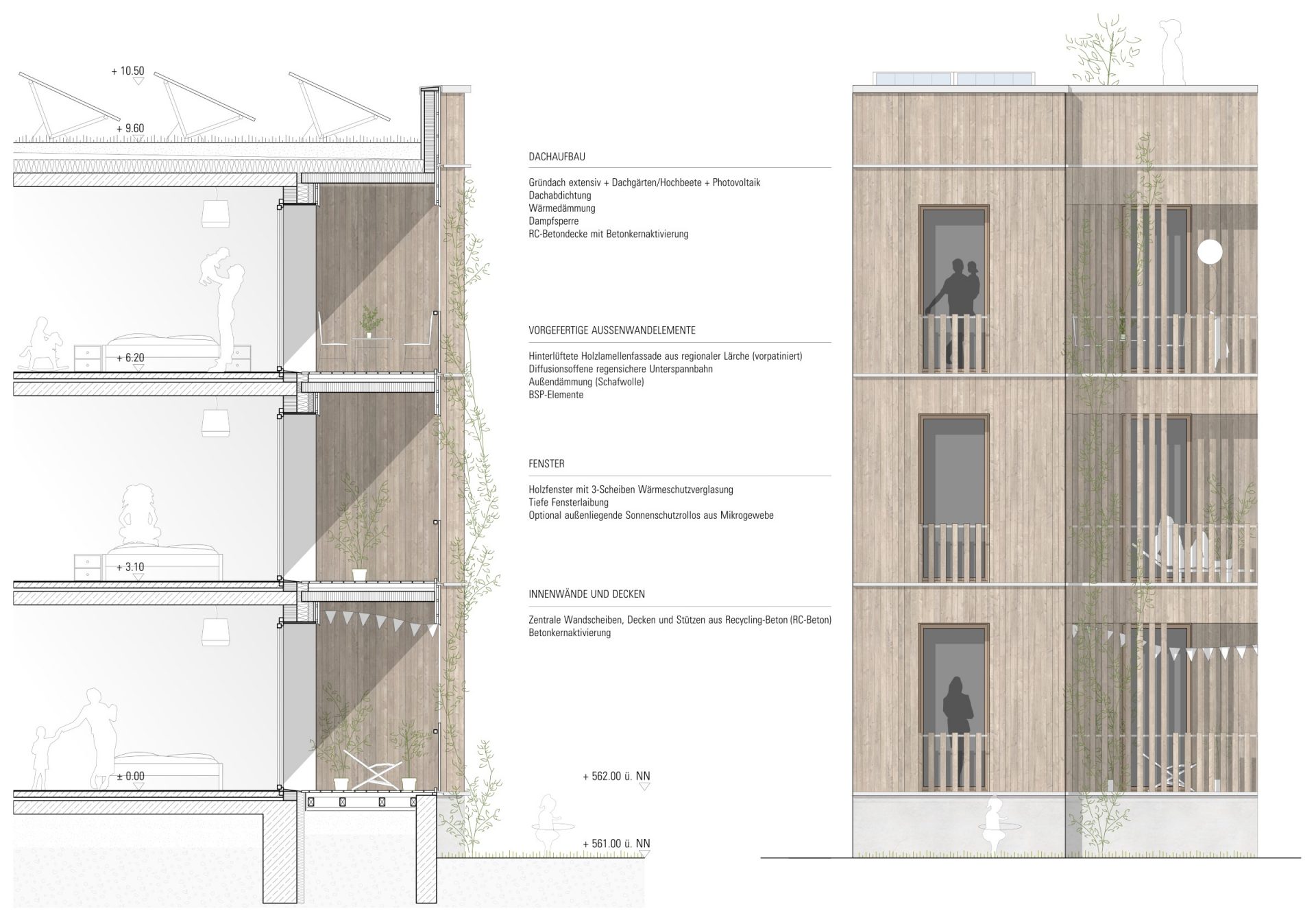 Das Erscheinungsbild des neuen Baukörpers ist geprägt durch eine schlichte und klare Formensprache. Das Gebäude wird nach dem Prinzip der Hybridbauweise errichtet – „ein Haus aus Stein, Holz und viel Grün“. Zentrale Wandscheiben, Stützen und Decken aus Ortbeton werden kombiniert mit komplett vormontierten Außenwänden aus Brettsperrholztafeln. Die Wohneinheiten sind über die Geschosse hinweg modular angeordnet und durch das System wirtschaftlich umsetzbar. Steigschächte können in einem Zuge durchlaufen. Die Betonbauteile werden in Recycling-Beton (RC- oder R-Beton) erstellt. Serielle Ausbauelemente sorgen für eine ökonomische Umsetzung. Ein niedriger Energiebedarf ist Ziel der Planung. Die Außenhülle erhält ein Kleid aus vorpatinierter, vertikaler Lärchenholzschalung. Im Bereich der Fenster und Balkone wird die Schalung zum Screen, zum Sonnen- und Sichtschutz und zur Rankhilfe für die Fassadenbegrünung.