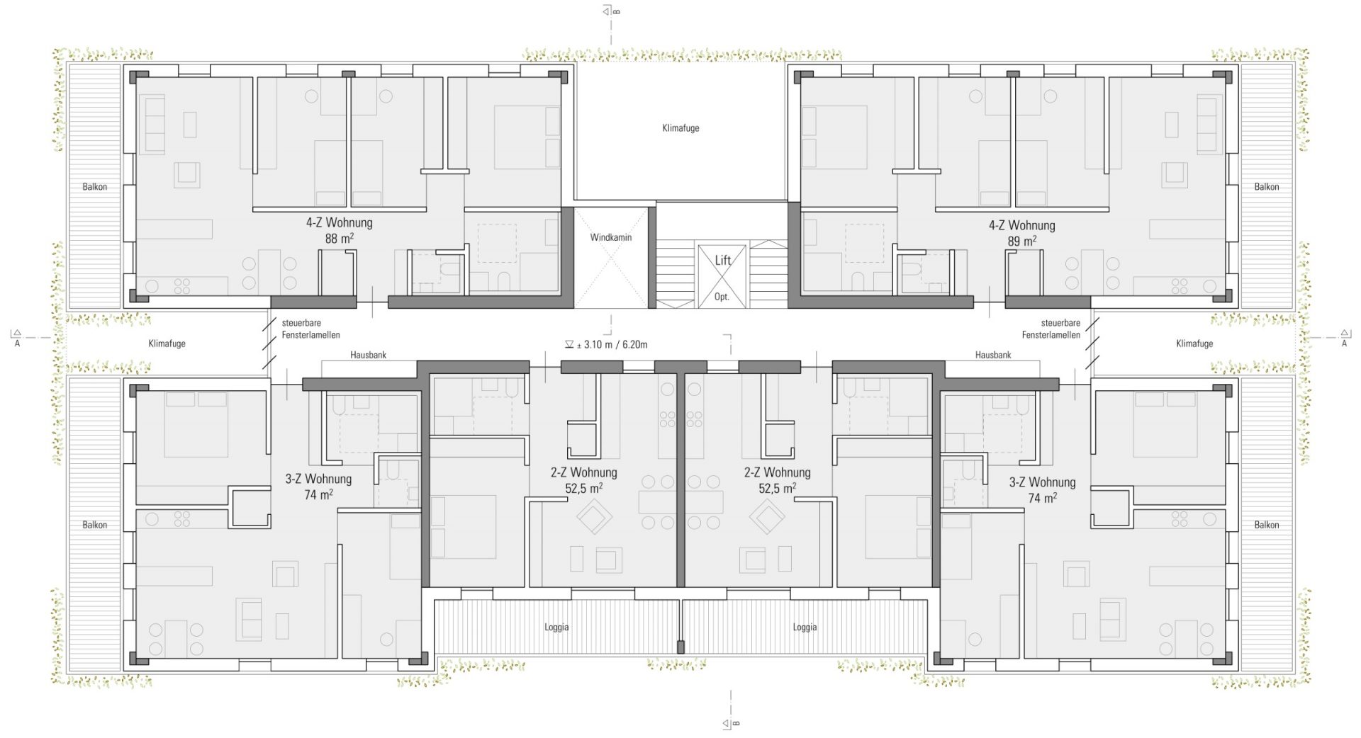 Flexibel gestaltbare Grundrisstypologien bieten eine kommunikative Lebenswelt mit Rückzugsmöglichkeiten und angenehm entspannter Atmosphäre. Integration, Gemeinschaft und individuelle Lebensgestaltung müssen sich gegenseitig nicht ausschließen. Der Gebäudegrundriss ist als Sechsspänner aufgebaut. Jeweils 2 Zweizimmer-, Dreizimmer- und Vierzimmer-Wohnungen bilden die Module einer Geschossebene. Im Erdgeschoss sind nur 4 Wohneinheiten angedacht, zwei davon als rollstuhlgerechte Wohnungen. Die restlichen Bereiche des Erdgeschosses bieten