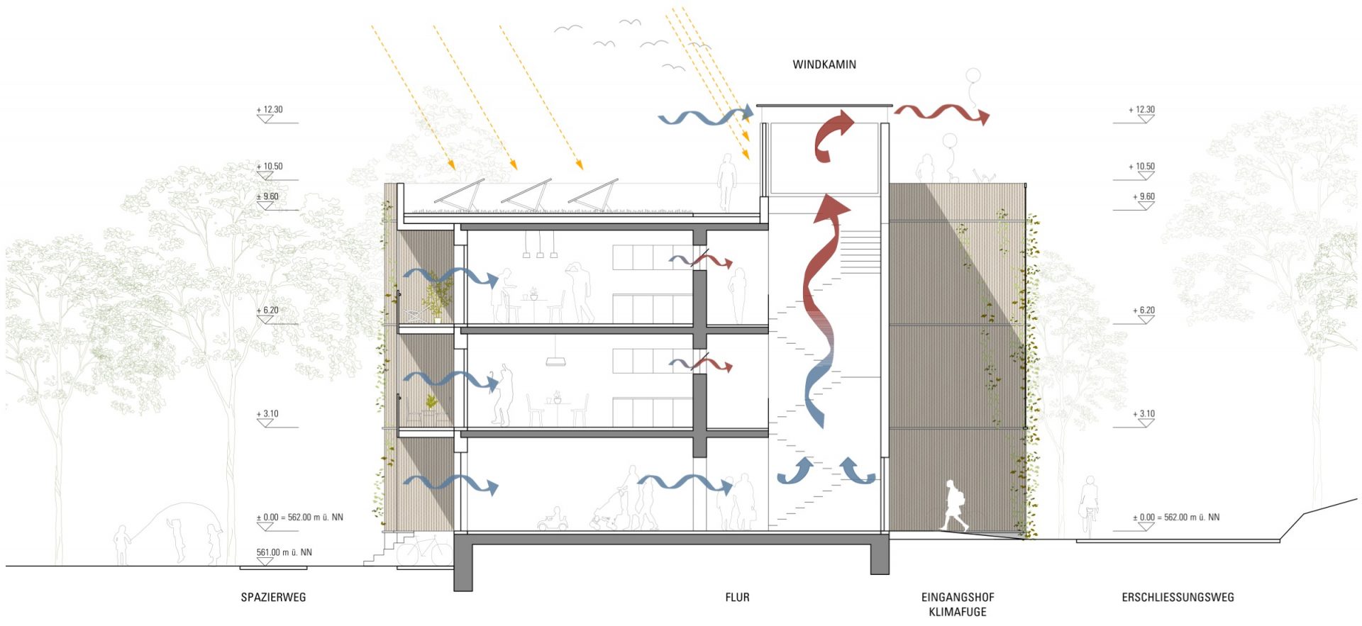 Flächen für Kellerersatzräume, Haustechnik, Kinderwägen, Rollstühle und Rollatoren. Dadurch wird kein separates Kellergeschoss benötigt. Durch die leichte Grundstücksneigung wird nach Süden hin ein Gebäudesockel ausformuliert, der schwellenlos an den Eingangsbereich im Norden anschließt. Das Erdgeschoss ist rollstuhlgerecht erschlossen, durch Einbau des später angedachten Aufzuges auch alle anderen Geschossebenen. In hochwassergefährdeten Regionen kann der Sockelbereich noch höher ausgebildet werden und über eine leichte Rampenfläche im Eingangshof barrierefrei erschlossen werden. Die Flurzonen im Inneren des Gebäudes sind von drei Seiten gut belichtet und erhalten an ihren Enden leichte Aufweitungen, die zum Verweilen und zum Nachbarschaftsplausch einladen. Alle Wohnungen besitzen großzügige vorgelagerte Balkone, Loggien und Terrassen, die begrünt werden können. Die Grundrisse aller Wohnungen sind barrierefrei angelegt und von der Größe im Rahmen der Fördervorgaben. Eine Querlüftung ist in allen Wohnungen möglich. Auch die kleinen Zweizimmer-Wohnungen können über ein Küchenfenster auf 1,60m Höhe (Brandschutzvorgabe) über den halboffenen Flurbereich und den Windkamin querlüften.