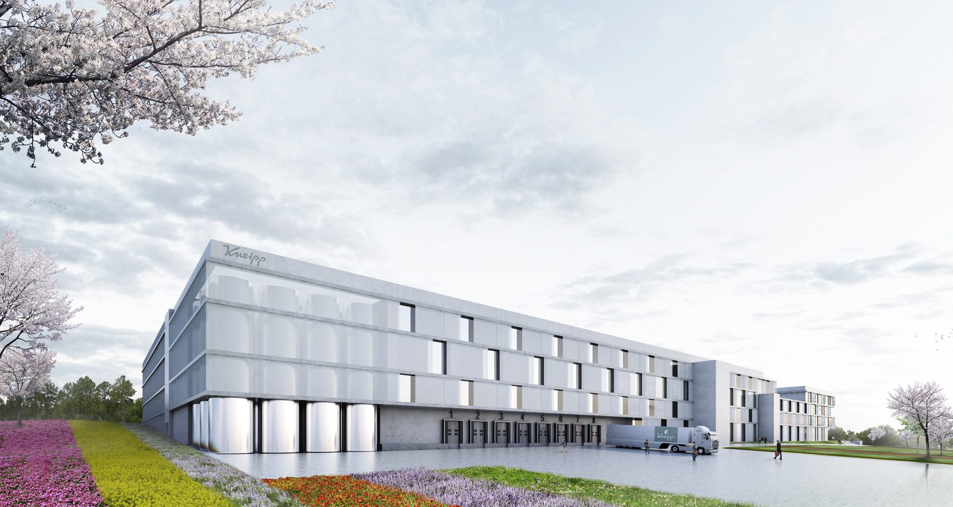 Der Kneipp-Hauptsitz in Hohestadt wird offen und einladend gestaltet, ein Ort der Kommunikation, die neue Visitenkarte der Firma. Das äußere Erscheinungsbild ist geprägt durch eine schlichte und klare Formensprache. Die tragende Konstruktion der Erweiterungsbauten besteht aus Stahlbetonstützen und punktgelagerten Stahlbetondecken. Das Grundraster der Konstruktion ist flexibel und nutzungsoffen angelegt. Die Außenwände der Produktionsflächen sind hochwärmegedämmt und erhalten eine Metallhaut als Abschluss. Die geschosshohen Fensterelemente der Bürofassaden werden als Dreifachverglasung ausgeführt. Auch die Bestandsgebäude erhalten, wo notwendig, neue Verglasungsöffnungen. Dadurch wird vor allem in den Produktionsebenen der vorgeschriebene Fensteranteil von 10% der Grundfläche garantiert. Der sommerliche Wärmeschutz wird durch außenliegende elektrisch gesteuerte Raffstores gewährleistet. Ergänzt werden sie durch eine vorgesetzte, leichte Haut aus Textilgewebe. Die Textilhaut umhüllt sowohl die neuen Büroflächen, als auch die alten und neuen Produktionsräume, sie verbindet alt und neu zu einer Einheit, schafft Identität ohne protzig zu wirken. Die Textilscreens filtern das UV-Licht, ohne großartig zu verdunkeln oder den Blick nach außen zu stören. Sie verhindern zu große Unterschiede in der Leuchtdichte des Tageslichteintrages. Die zweite Haut kann auch als flexibler Informationsträger für die Marke Kneipp genutzt werden. Strukturen von Heilpflanzen oder die Darstellung der Firmenphilosphie: die Fassade wird zum Display, zum Aushängeschild der Firma. Das Hochregallager erhält eine Verkleidung aus hochwärmegedämmten Sandwichelementen mit Trapezblech. Durch unterschiedliche Profilbreiten der Trapezbleche erhalten die Ansichten eine horizontale Akzentuierung und Gliederung. Steuerbare Oberlichter sorgen für einen gleichmäßigen Tageslichteintrag in der Lagerhalle und verhindern gleichzeitig eine sommerliche Überhitzung.