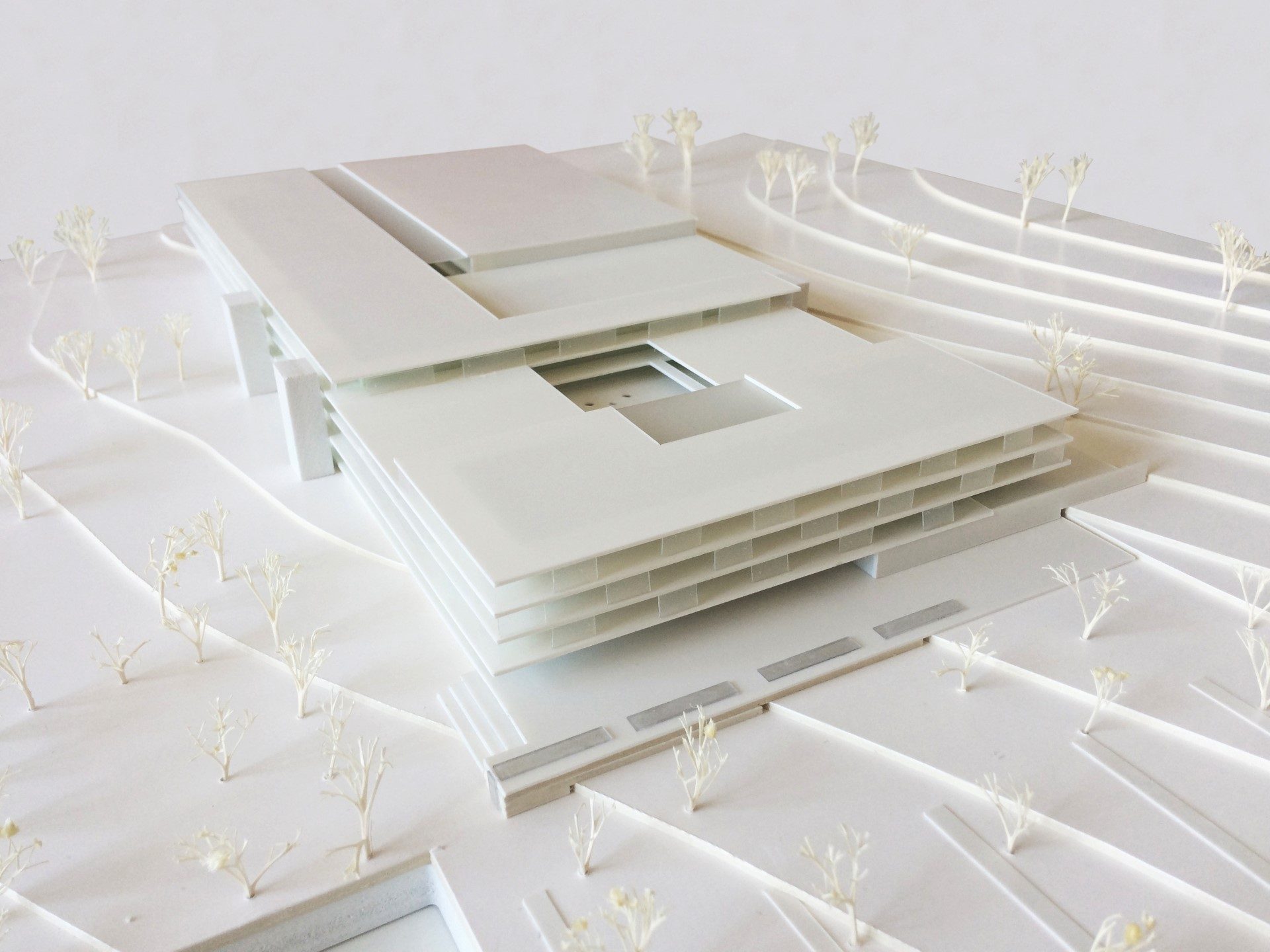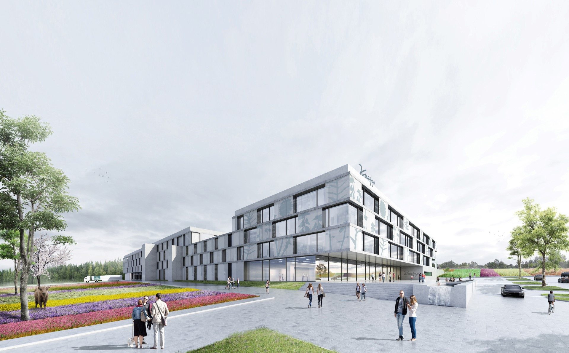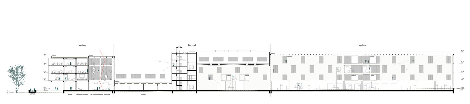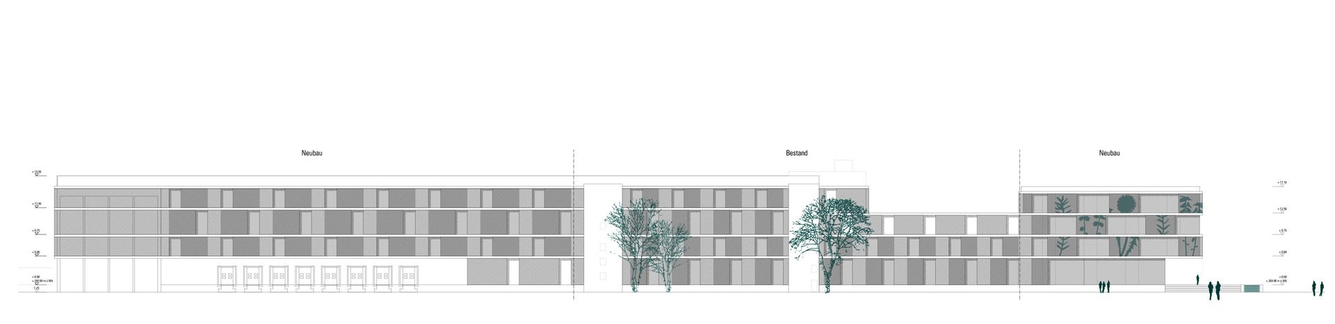 Die Erweiterungsflächen ergänzen den Bestand zu einem klaren Ensemble. Die neuen Fassadenelemente stellen ein verbindendes Motiv dar, welches den Gesamtorganismus zusammenführt, gleichzeitig bleiben die einzelnen Funktionen nach außen hin ablesbar.