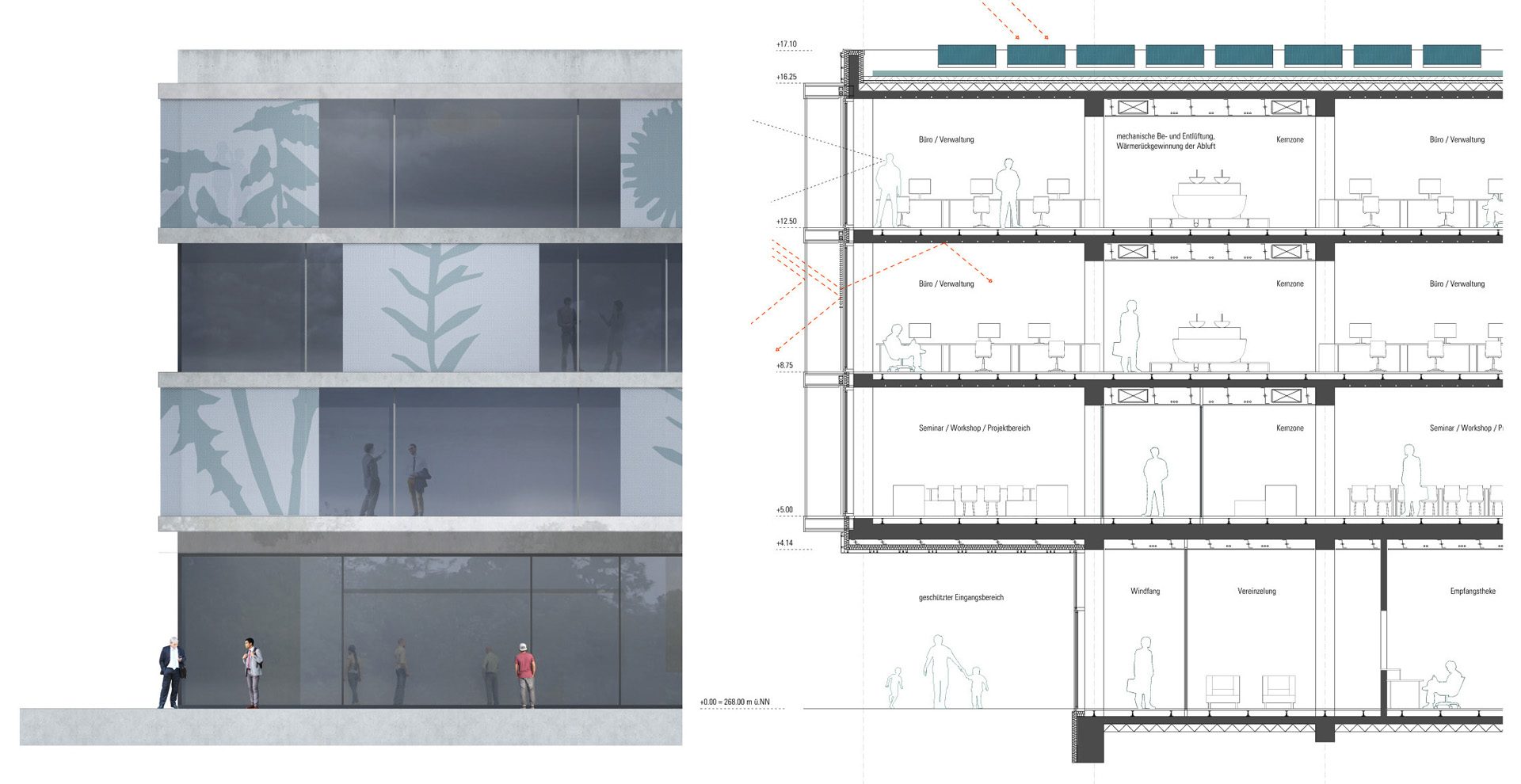 Büro- und Seminarzonen werden im neuen Kopfbau gebündelt. Aufzüge und Treppenanlagen verbinden den Eingangsbereich mit den Obergeschossen. Die halböffentlichen Seminar-, Projekt- und Workshop-Bereiche befinden sich im 1. Obergeschoss und sind direkt vom Foyer aus über eine Freitreppe erreichbar. Im 2. und 3. Obergeschoss sind die Bürolandschaften situiert. Die Arbeitsplätze der Büros sind um einen offenen Kommunikations- und Servicebereich mit Besprechungsinseln, Lounge-Ecken, Kopierer und Teeküche angeordnet. Die Büros aus dem Bestandsgebäude werden auch in den neuen Kopfbau verlagert.