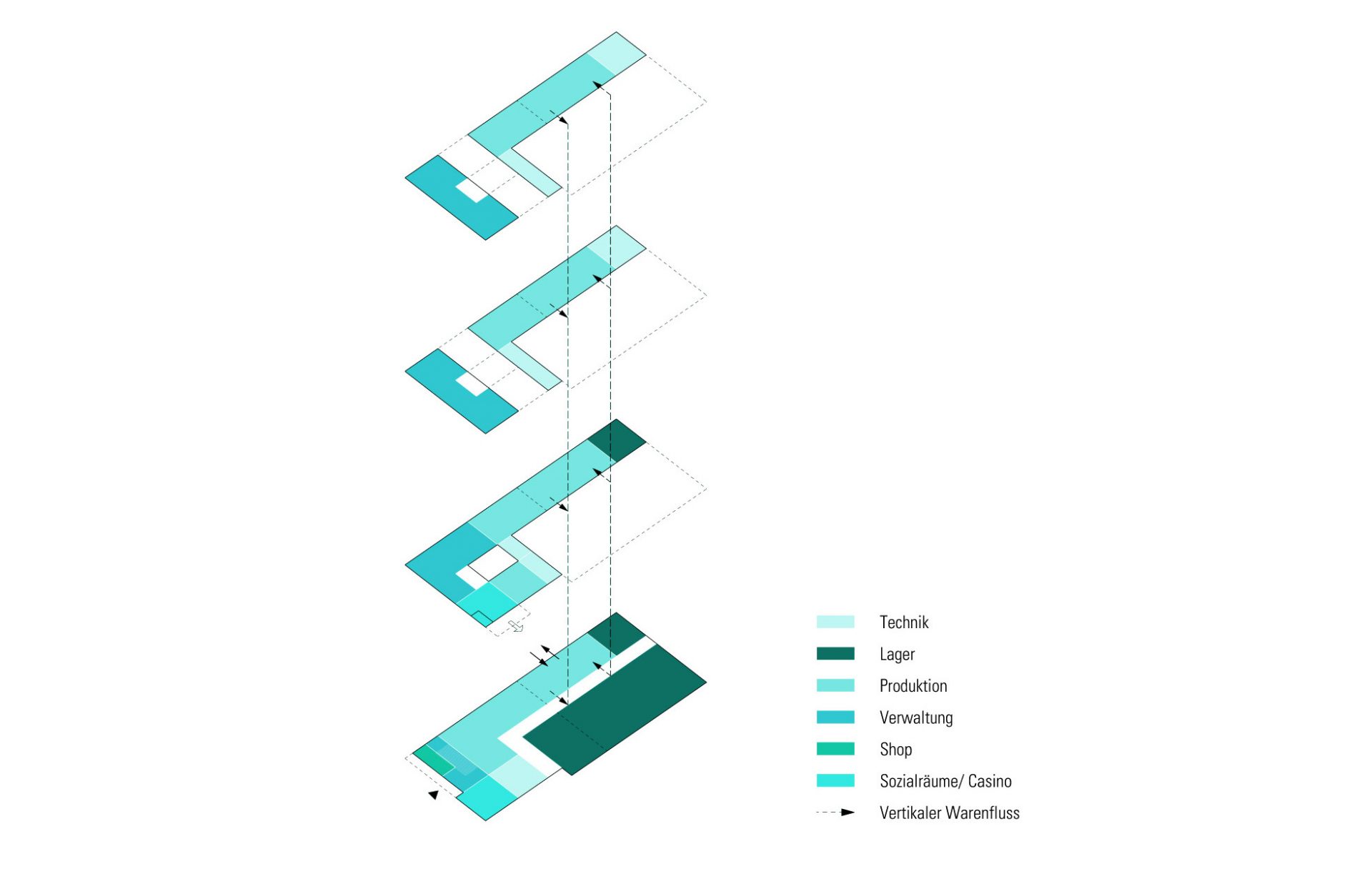 Zusätzliche produktionsnahe Büros werden dezentral in die Produktionsetagen integriert. Der verglaste Luftraum im Foyer ermöglicht Rückblicke und die geschossübergreifende Kontaktaufnahme zwischen den einzelnen Bereichen. Alle Ebenen erhalten einen Hohlraumboden. Abgehängte Decken werden nur in den zentralen Bereichen von Leitungsführungen vorgeschlagen.