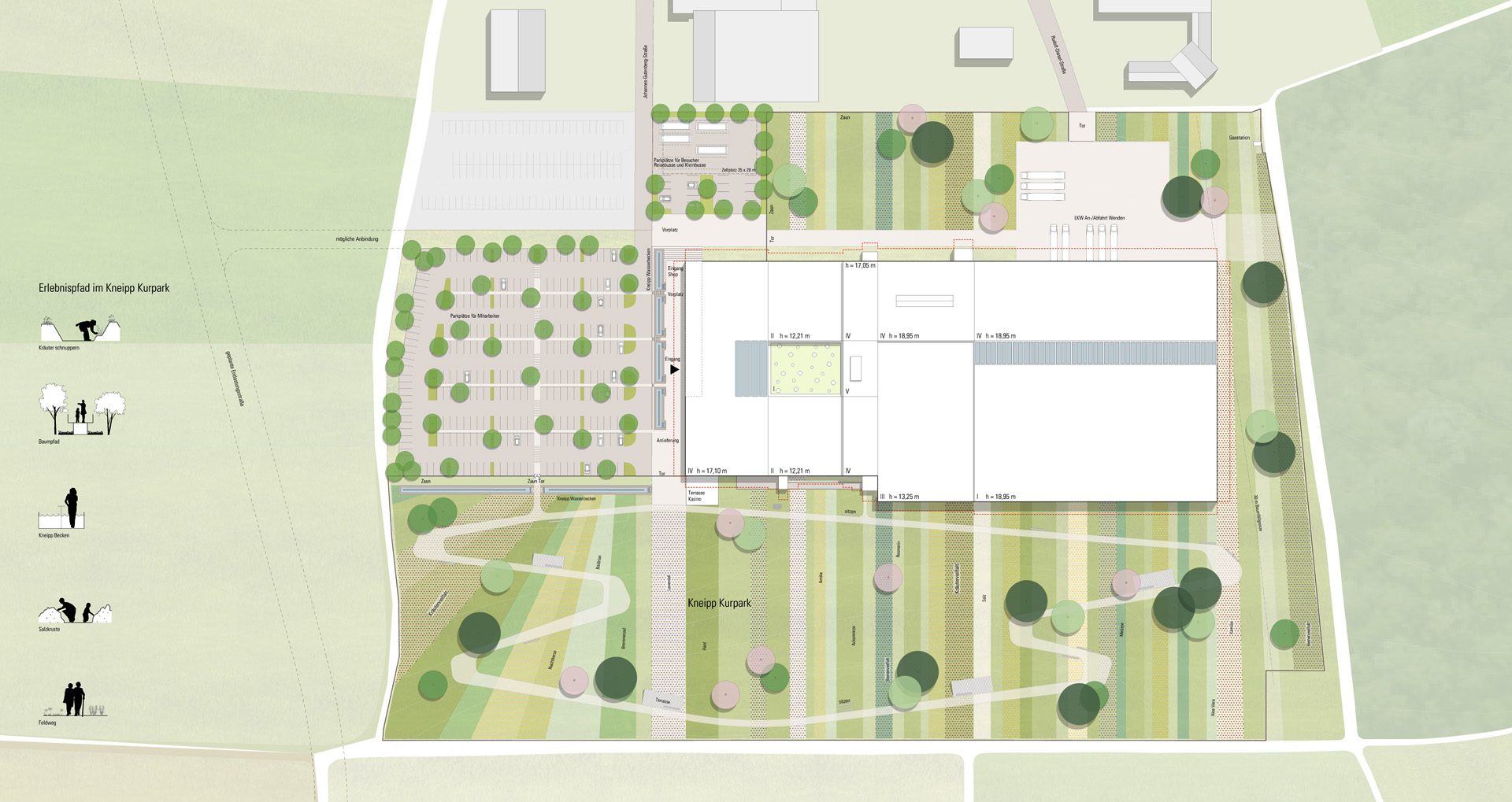 In den arrondierten Freiflächen wird die Produktpalette Kneipp mit all ihren Ingredienzien für Besucher und Mitarbeiter atmosphärisch und räumlich erfahrbar. Im Ordnungssystem der umgebenden Feldfluren sind Kräuter-Salz-Landschaften topographisch inszeniert. Der in den Hang eingeschriebene Rundweg lädt zum Erwandern ein und kann firmenstrategisch repräsentativ für Geschäftspartner und Besucher inszeniert werden. Auf dem Weg vom Parkplatz oder Foyer eröffnet sich für Gäste ein Rundblick über das Firmenareal. Auf kleinen Freiterrassen können gebäudenah oder in den Kräuterhügeln repräsentative Empfänge abgehalten werden. So wird die ganzheitliche Firmenphilosophie auf den Säulen Wasser, Ernährung, Bewegung und Pflanzen in Balance selbstverständlich veranschaulicht. Als eigenständiger, markanter Landschaftsbaustein kann das Firmenareal so einen Beitrag zur Entwicklung der Ochsenfurter Kulturlandschaft liefern.