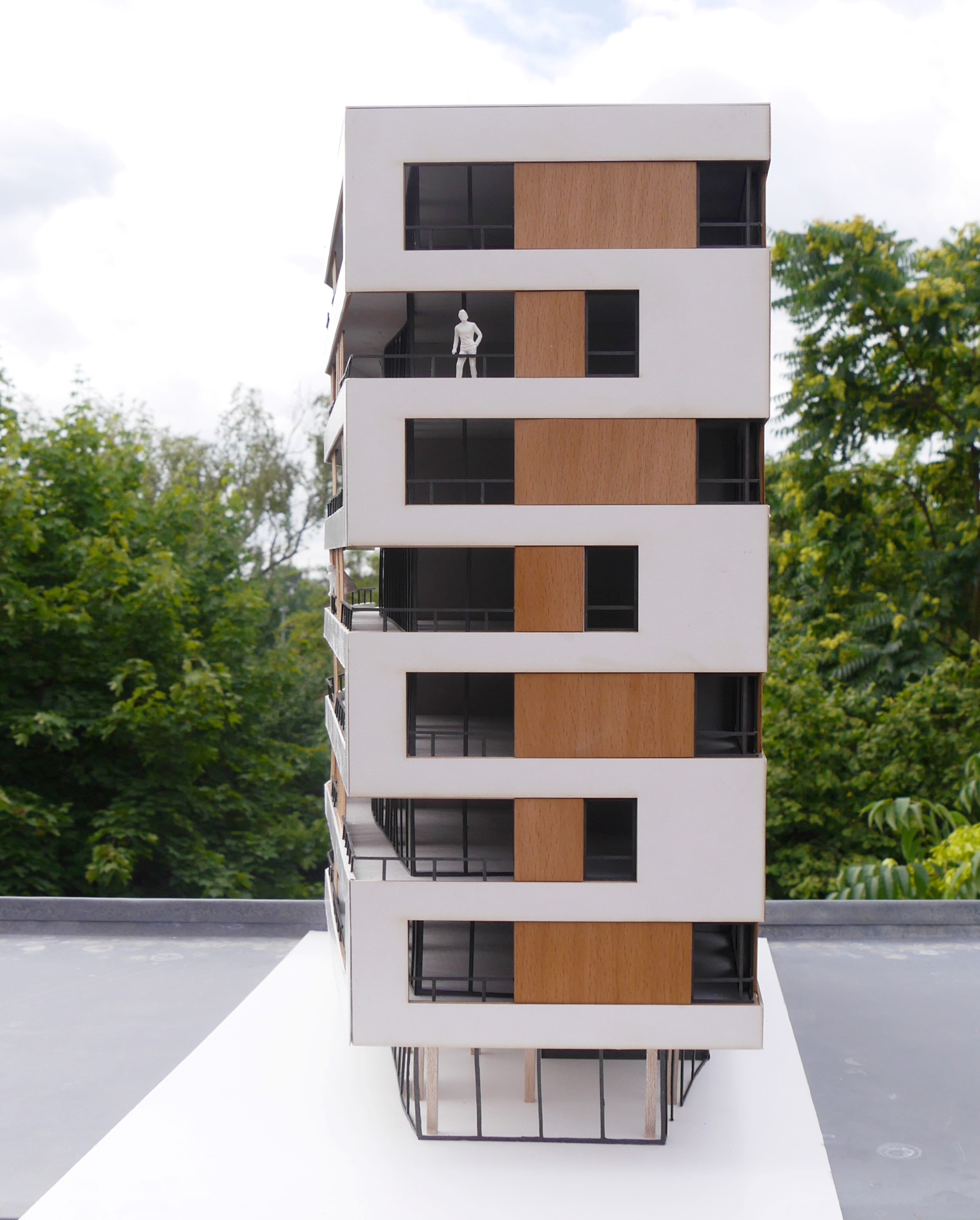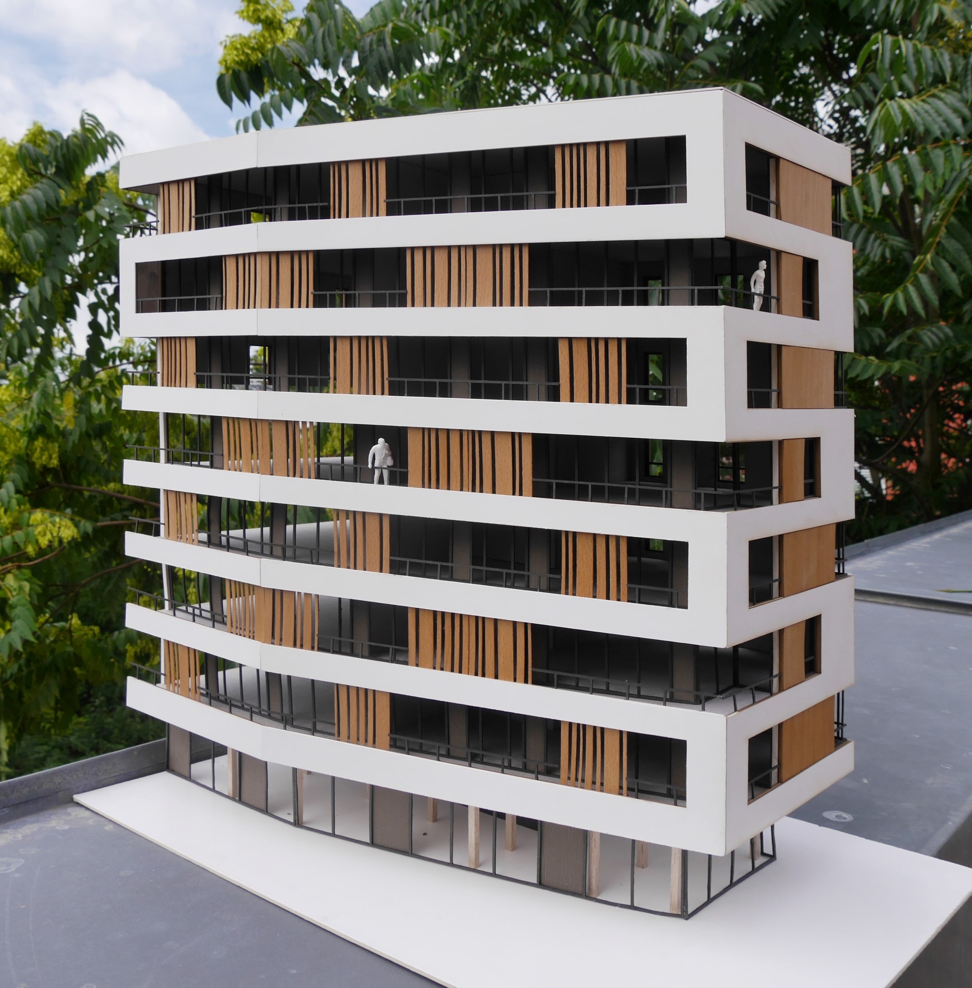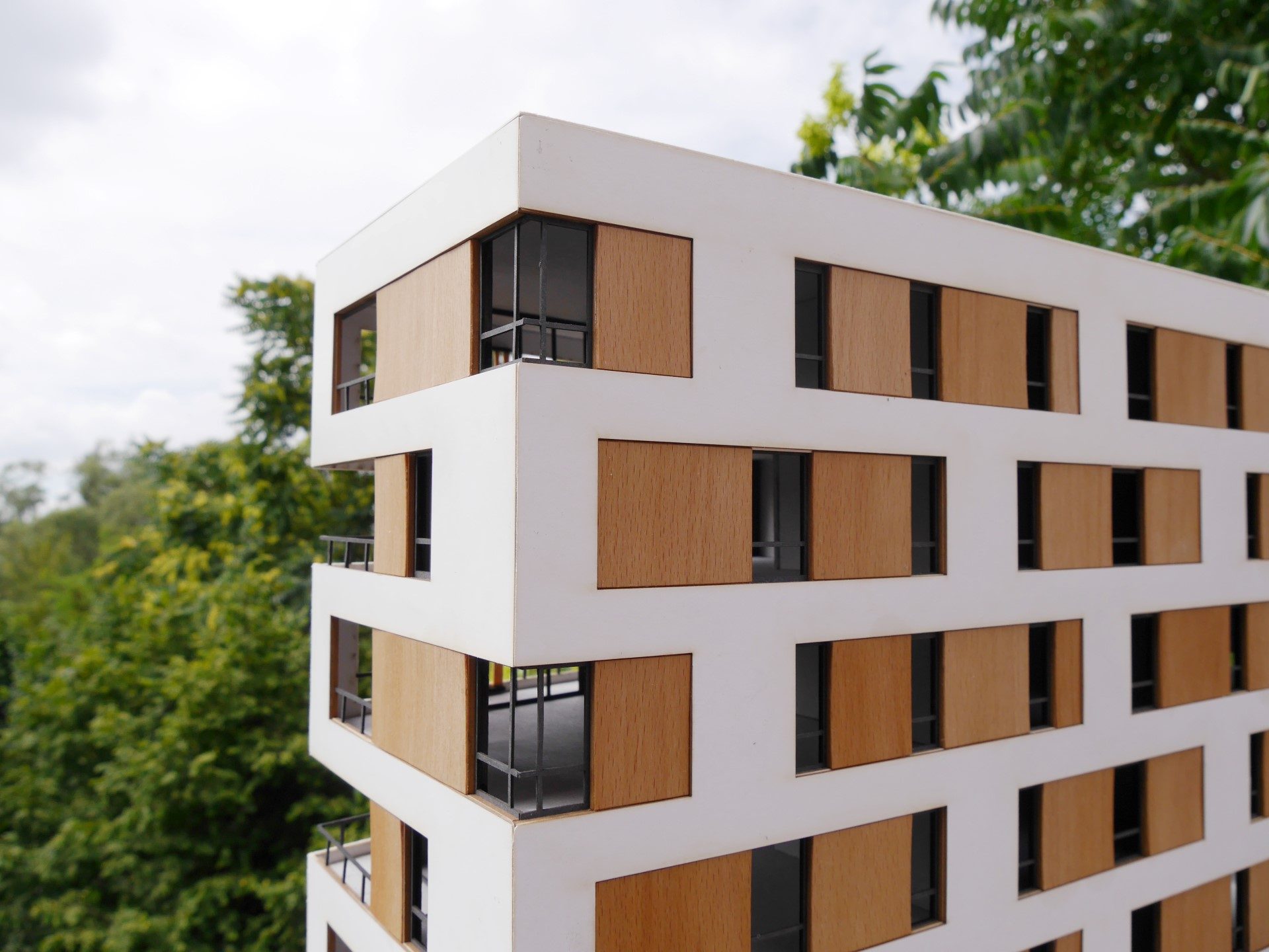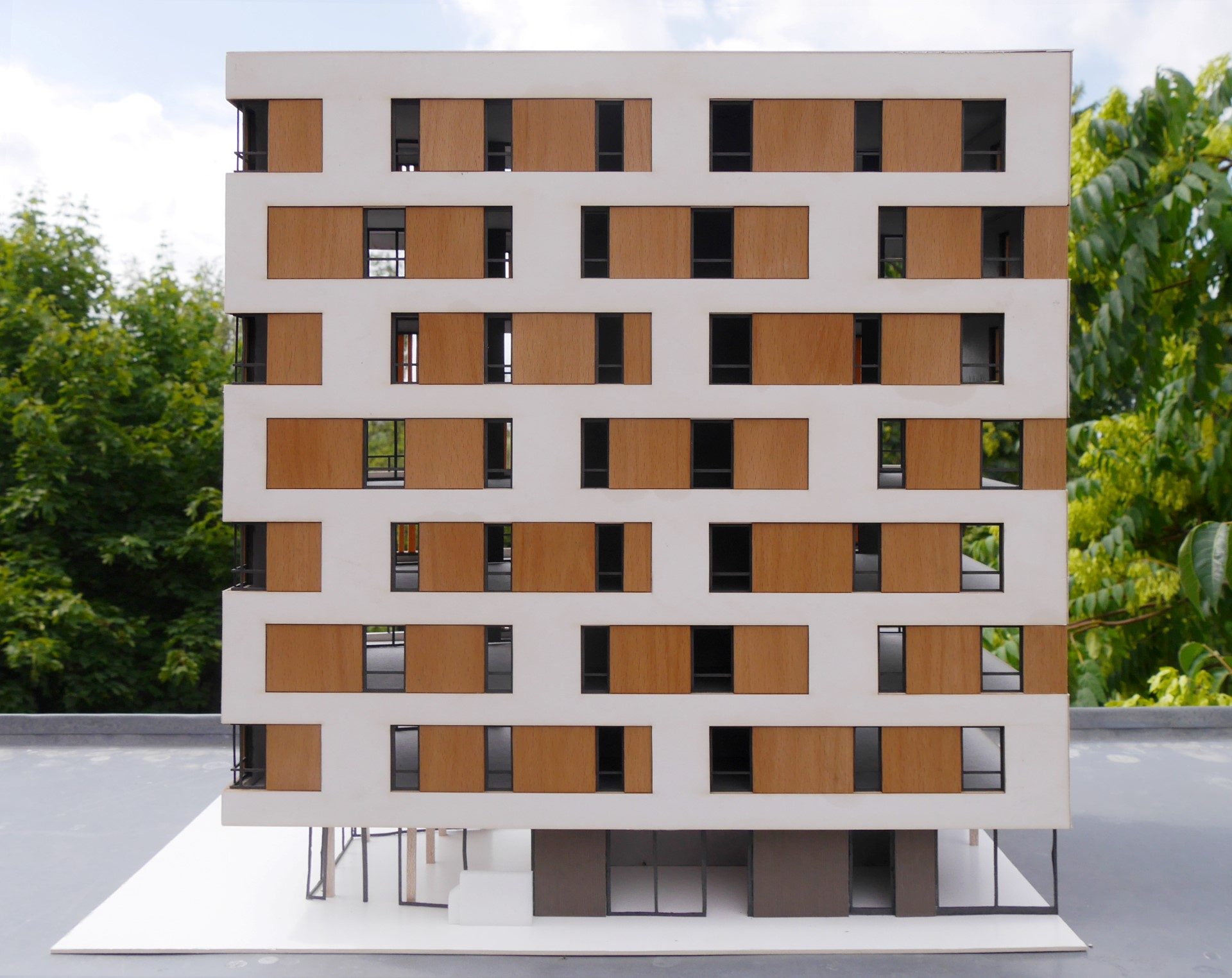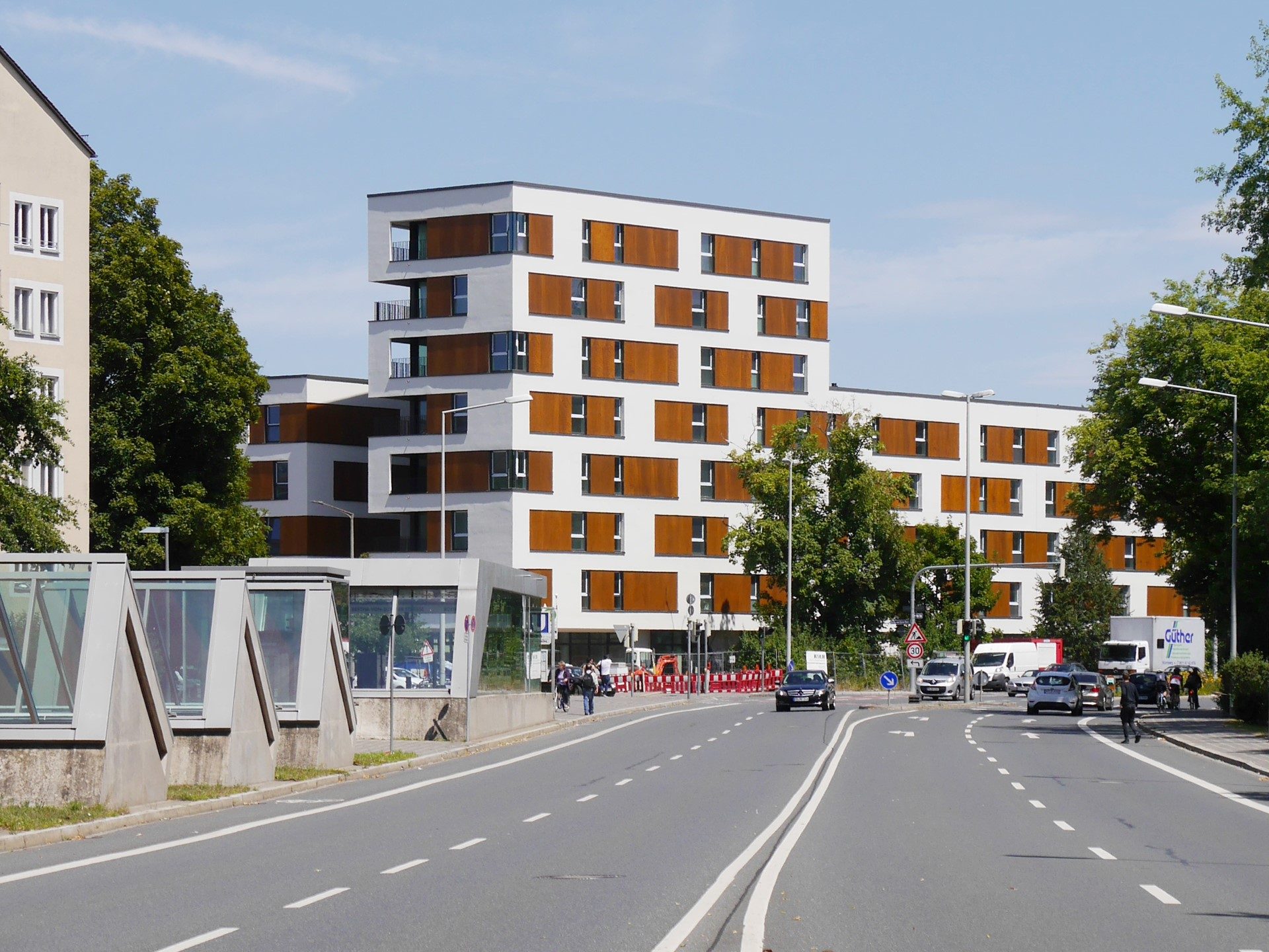 Das Erscheinungsbild der neuen Baukörper ist geprägt durch eine schlichte und klare Formensprache. Die Gebäude sind in Schottenbauweise konzipiert. Durch wirtschaftliche Spannweiten der Decken werden die Baukosten optimiert. Die Außenwände und Brüstungen zur Straße werden aus Lärmschutzgründen in KS-Mauerwerk erstellt, nichttragende Innenwände werden in Leichtbauweise ausgeführt. Serielle Ausbauelemente sorgen für eine ökonomische Umsetzung.