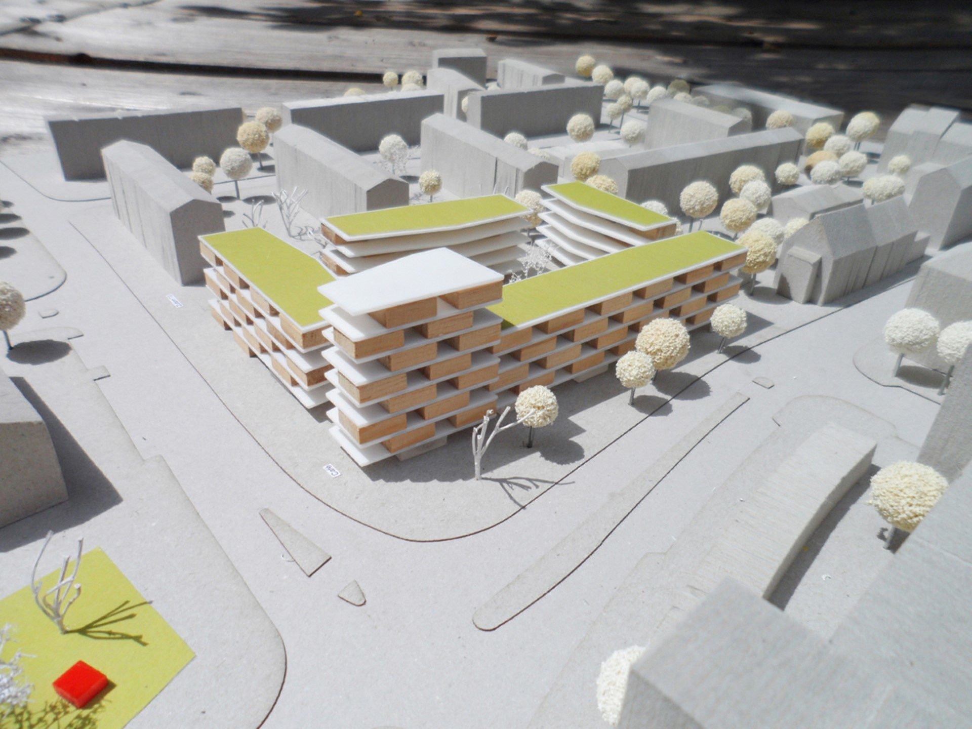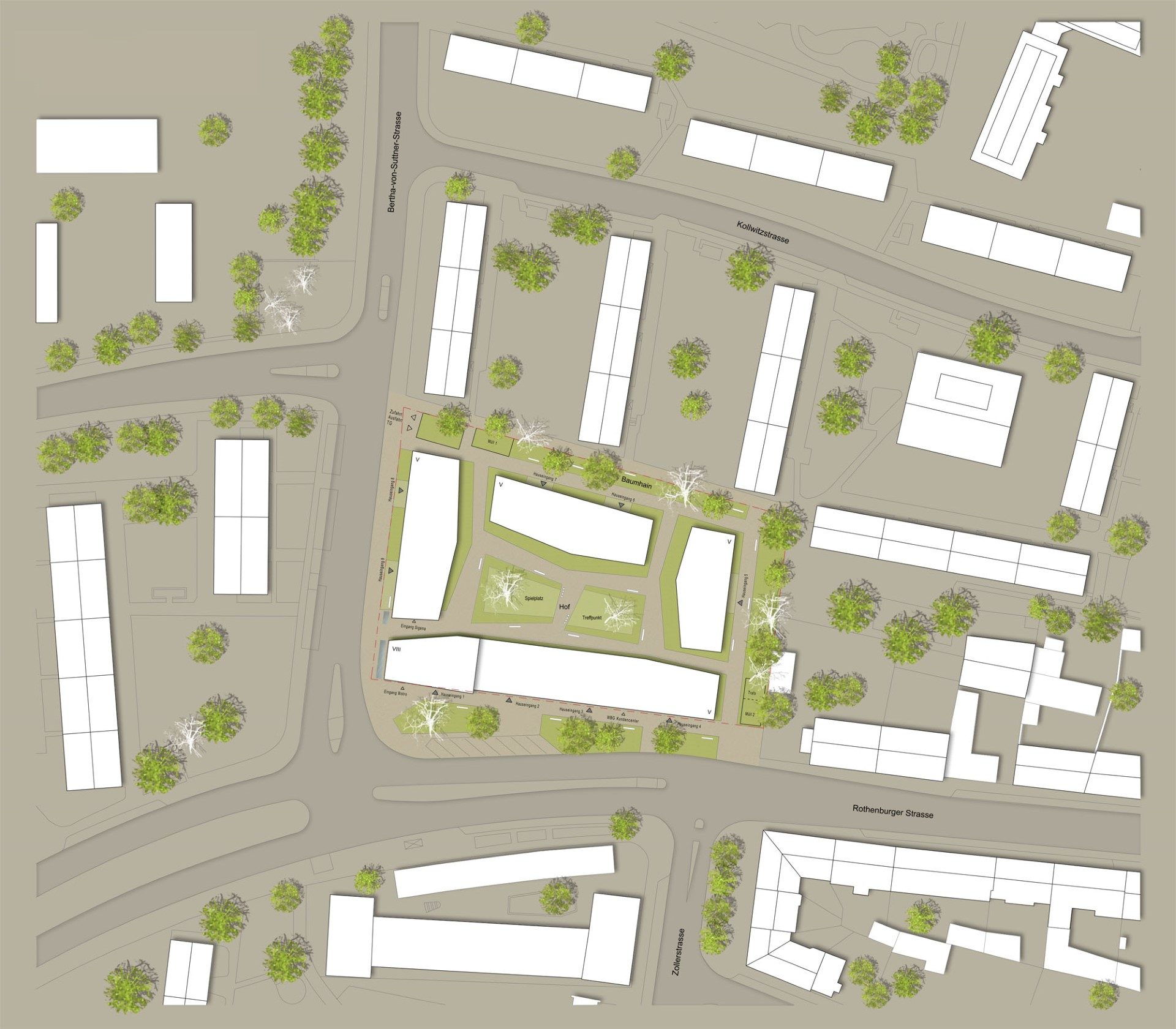 Städtebaulich orientiert sich die neue Anlage an der Maßstäblichkeit der vorhandenen Siedlungsstrukturen. Das Ensemble bildet jedoch als zukünftiges Quartier für Jung und Alt auch einen eigenen typologischen Charakter aus. Unterschiedlichste Generationen sollen hier in angenehmer Atmosphäre miteinander leben, wohnen, arbeiten und altern können. Deshalb wird vor allem Wert gelegt auf die Ausarbeitung der Schnittstellen zwischen den Bewohnern. Flexibel gestaltbare, nutzungsneutrale bzw. anpassungsfähige Grundrisse sind eine weitere Grundlage.