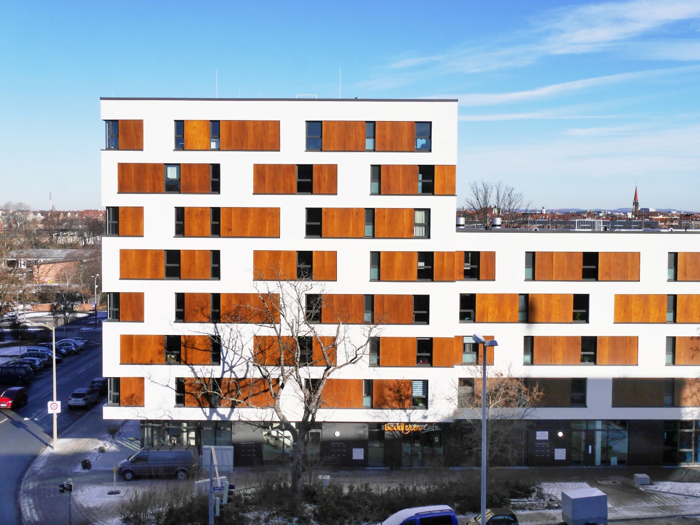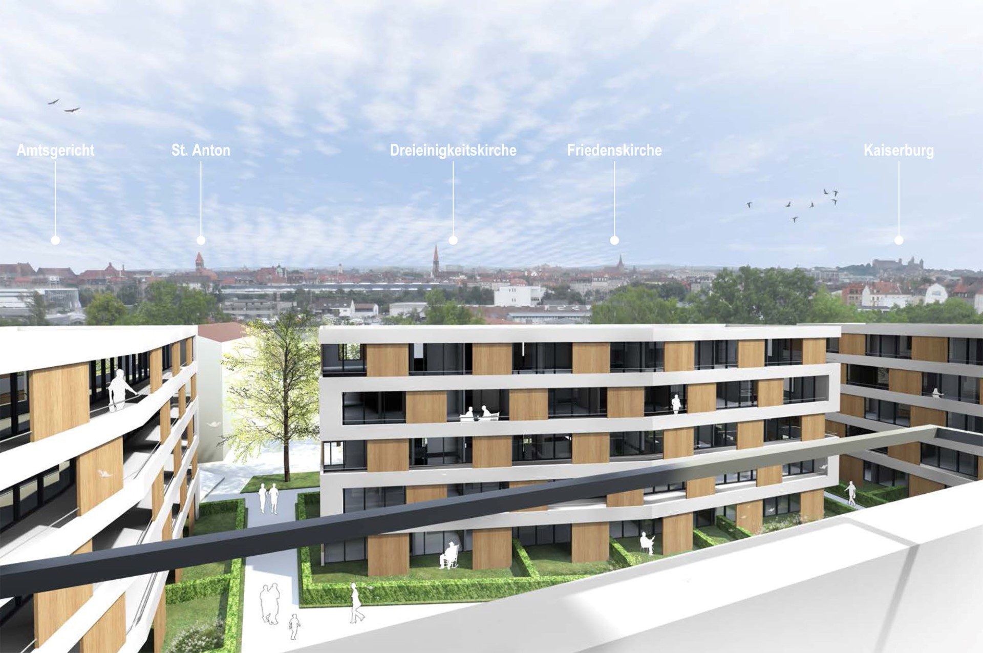 Als Auftakt und städtebauliche Markante erhält die Anlage im Kreuzungsbereich Rothenburger Straße / Bertha-von-Suttner-Straße eine 8-geschossige Überhöhung. Von den oberen Geschossen hat man zur Nordseite einen kompletten Panoramablick über die Nürnberger Kernstadt, vom Quelle-Turm über die Kaiserburg bis zur Nürnberger Versicherung.