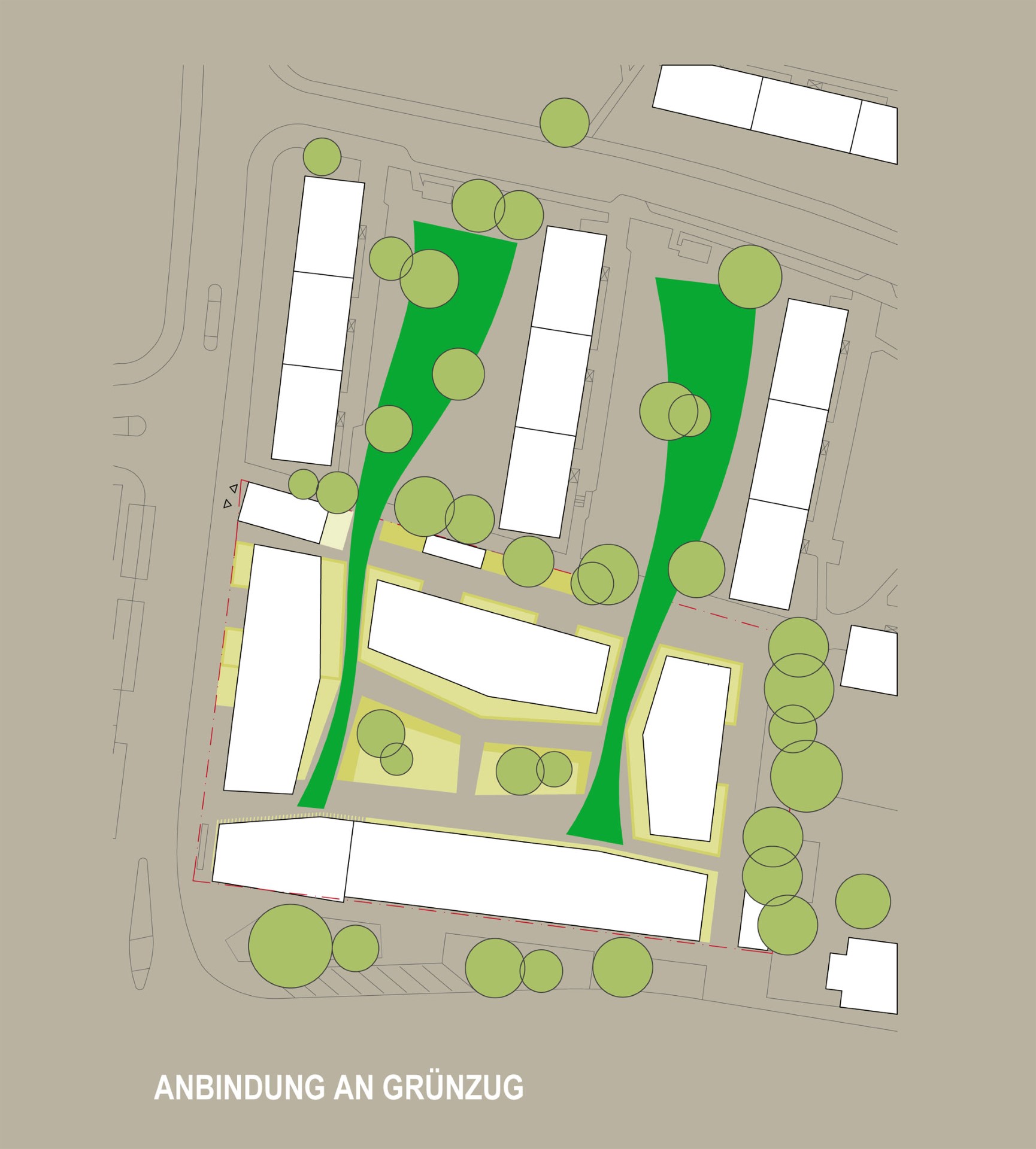 Die vier 5-geschossigen Baukörper sind als aufgelöste Blockrandbebauung arrangiert. Das neue Ensemble vermittelt dadurch zwischen der Blockstruktur aus der Gründerzeit und der Zeilenbebauung der Nachkriegsjahre. Die Gebäude gruppieren sich um einen zentralen Gemeinschaftshof. Er stellt die gemeinsame Mitte der Anlage dar, er ist zentraler Verteiler und Treffpunkt für Anwohner. Spiel- und Erholungsflächen sind hier situiert. Die Gebäude präsentieren sich zur Außenseite hin geradlinig, im Hofbereich werden sie amorph und kommunizieren miteinander. Gebäudekanten formulieren Sicht- und Bewegungsachsen aus und adaptieren den wohnlichen Charakter einer gewachsenen Struktur. Die Art und Anordnung der Fugen zwischen den Baukörpern gewährleistet den notwendigen Lärmschutz, gleichzeitig aber auch die Offenheit der Struktur, bestehende Wegebeziehungen werden gestärkt, neue Verbindungen werden angeboten.