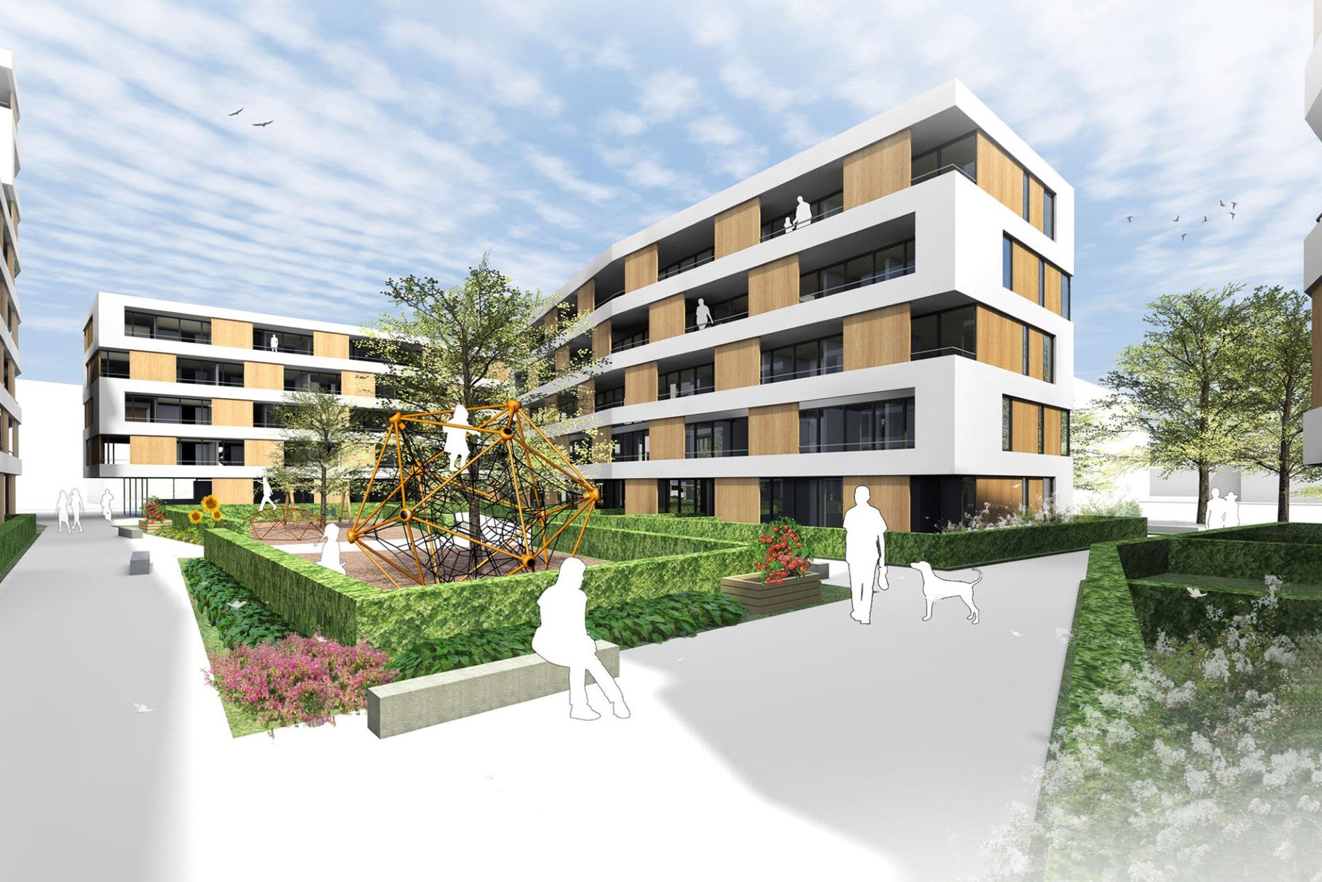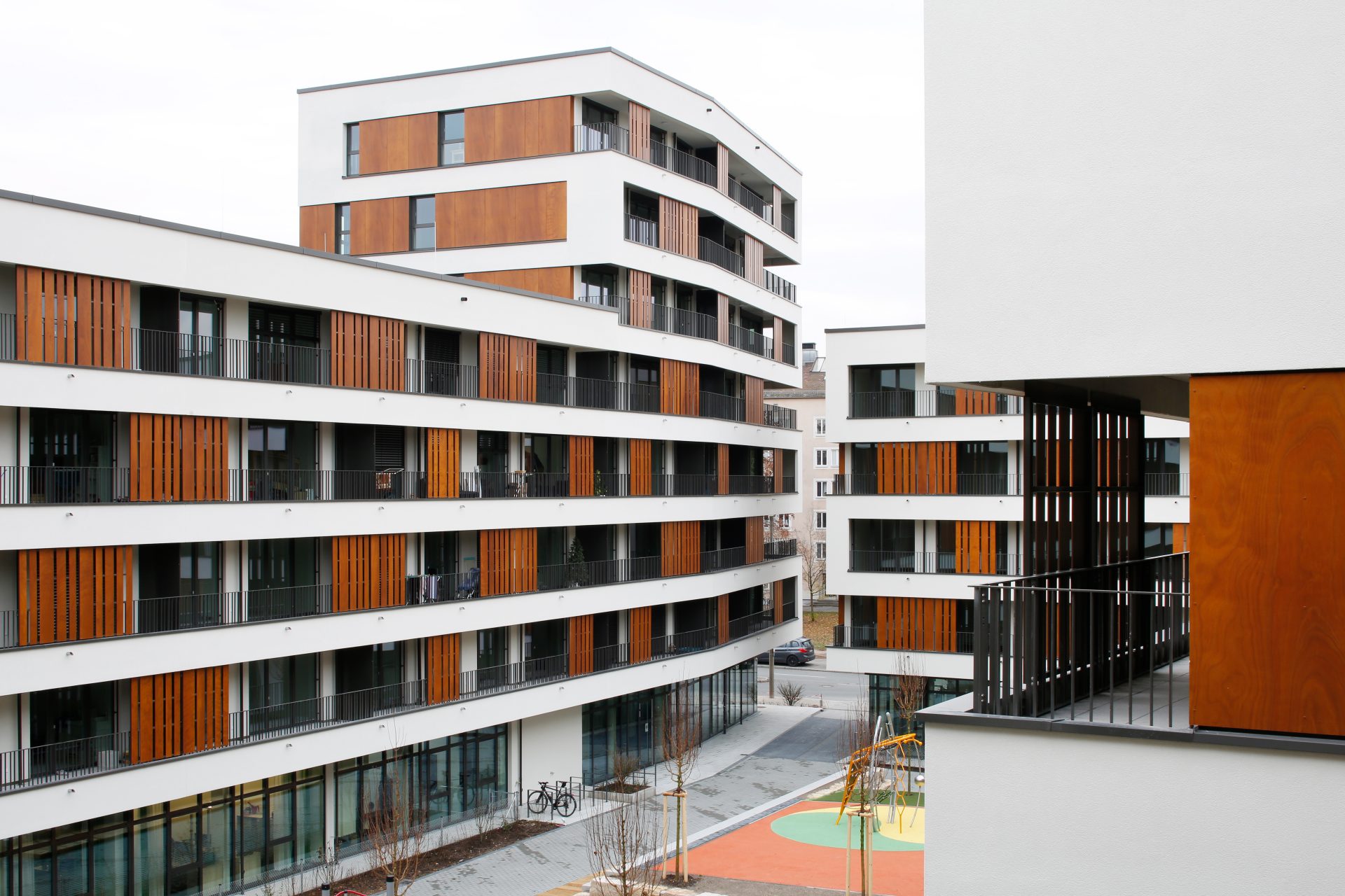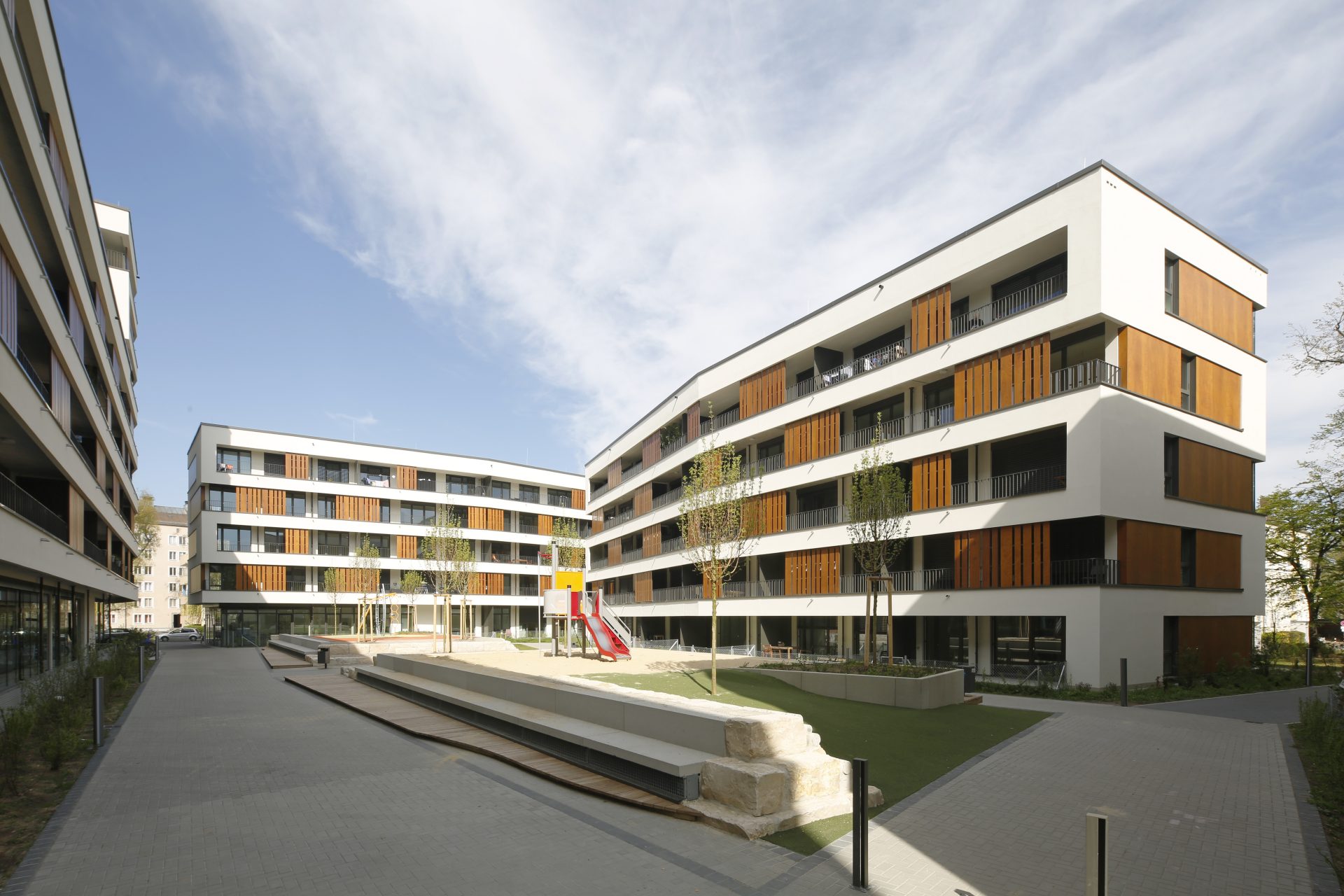 Die Gebäude sind überwiegend als Zweispänner organisiert. Aufzugsanlagen ermöglichen eine durchgehend barrierefreie Erschließung. Flexibel gestaltbare Grundrisstypologien bieten eine kommunikative Lebenswelt mit Rückzugsmöglichkeiten und angenehm entspannter Atmosphäre. Integration, Gemeinschaft und individuelle Lebensgestaltung müssen sich gegenseitig nicht ausschließen. Die Wohneinheiten sind über die Geschosse hinweg modular angeordnet und durch das Schottensystem wirtschaftlich umsetzbar. Jede Wohnung besitzt einen großzügigen Balkon oder eine Terrasse mit privater Grünfläche. Alle Balkone sind zum zentralen Hof hin ausgerichtet.