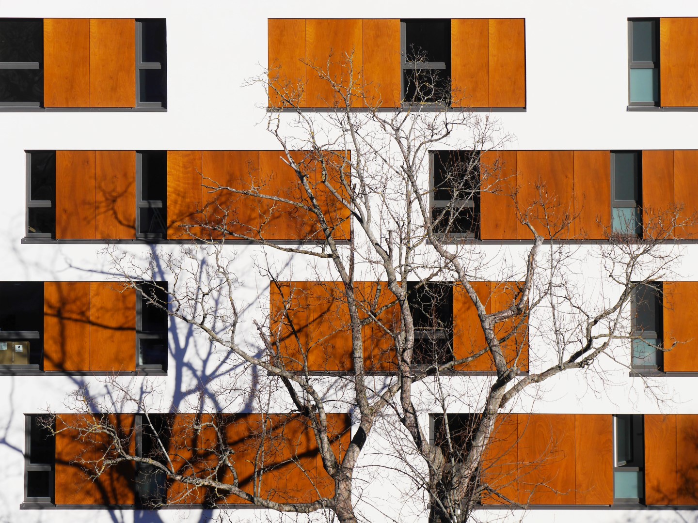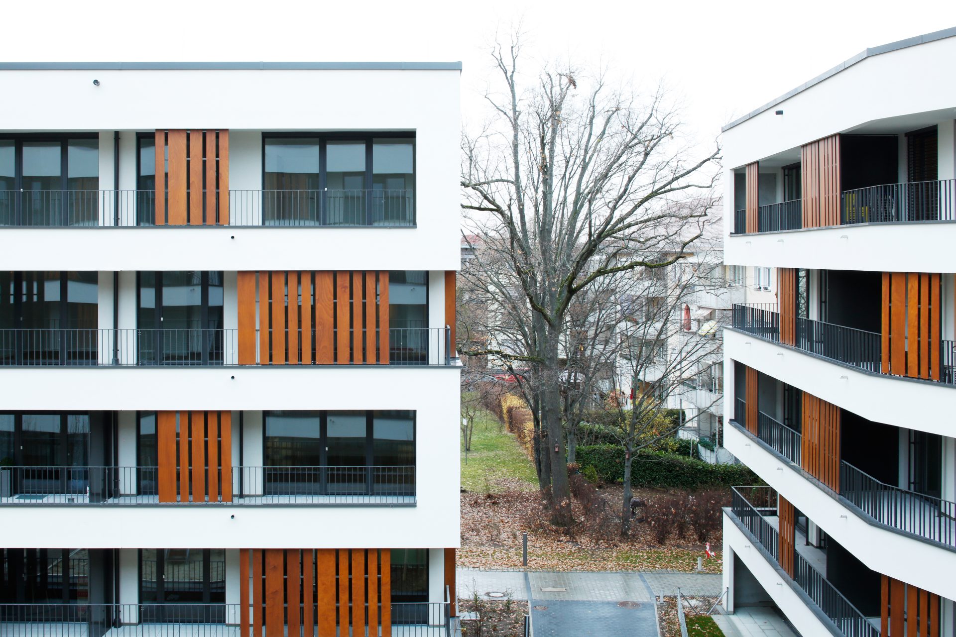 Ein niedriger Energiebedarf ist Ziel der Planung. Die Außenhülle wird thermisch optimiert bzw. hochwärmegedämmt. Der Einfachheit und Klarheit folgt auch die Wahl der Materialien. Die Gebäude werden mit hellen Holzfaserzementplatten bekleidet. Die Fensterbereiche werden mit zueinander versetzten, hölzernen Plattenmaterialien (Intarsien) akzentuiert. Diese verleihen der Fassade Plastizität. Die Gebäudeecken werden optisch durch die umlaufenden Holzintarsien gebrochen. Durch Übereckfenster erhalten gerade diese Wohneinheiten auch einen speziellen innenräumlichen Charme. Die Fenster werden zu den Balkonen hin geschosshoch ausgeführt. Zur Strassenseite erhalten sie ein 2/3 hohes Parapet, um “barrierefreie” bzw. “altengerechte” Ausblickmöglichkeiten im Sitzen, im Rollstuhl und im Liegen zu gewährleisten, gleichzeitig aber Einblicke von außen zu verhindern. Im Sommer schützen außenliegende Sonnenschutzrollos aus Mikrogewebe die Wohnungen vor Überhitzung, im Winter erhält man durch die tief stehende Sonne gute Wärmeeinträge. Auf den Balkonen sorgen hölzerne Schiebeläden für den notwendigen Sonnen- bzw. Sichtschutz.