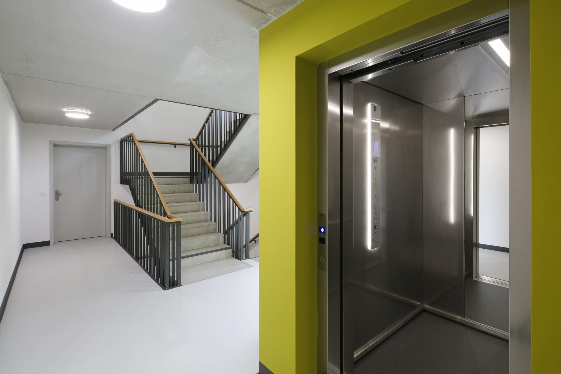 Der warme Werkstoff Holz wird auch zum Wegbegleiter im Inneren des Gebäudes. Eingangsbereiche und Verkehrsflächen erhalten Natursteinbeläge.