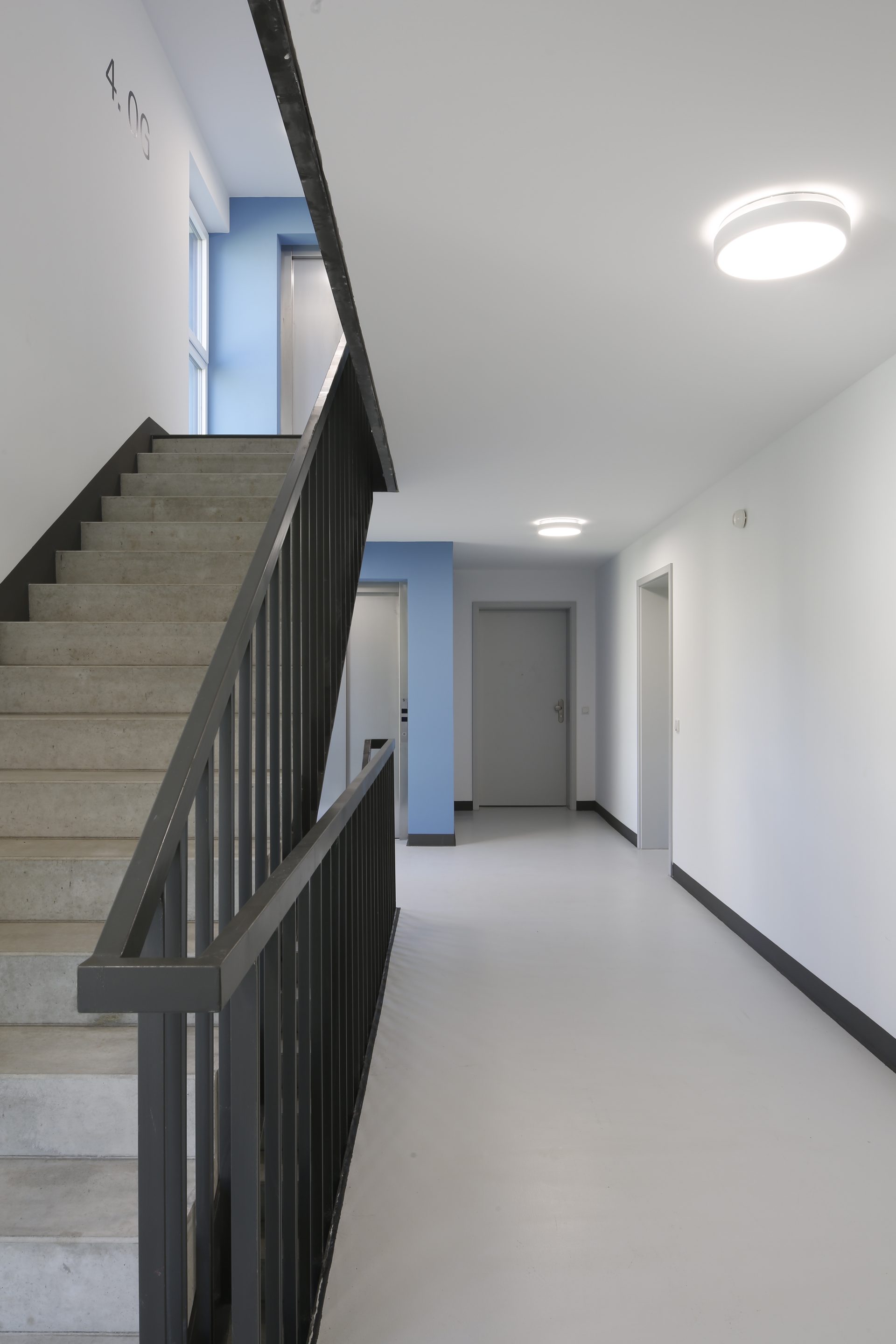 Die straßenseitigen Baukörper erhalten spezielle “Lärmschutzgrundrisse”. Aufenthaltsräume sind hier zum ruhigen Hof hin ausgerichtet, Nebenräume und Serviceräume stellen den Lärmschutzpuffer zur Straße dar. Der Wohn-Ess-Koch-Bereich ist als “Durchwohnen” konzipiert, um das Tageslichtspektrum erlebbar zu machen und dennoch eine Lüftungsmöglichkeit zur ruhigen Hofseite anzubieten.